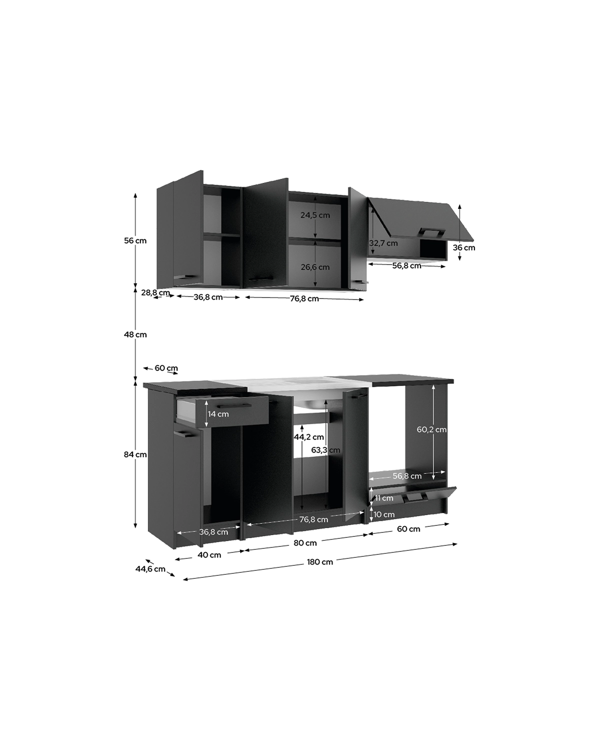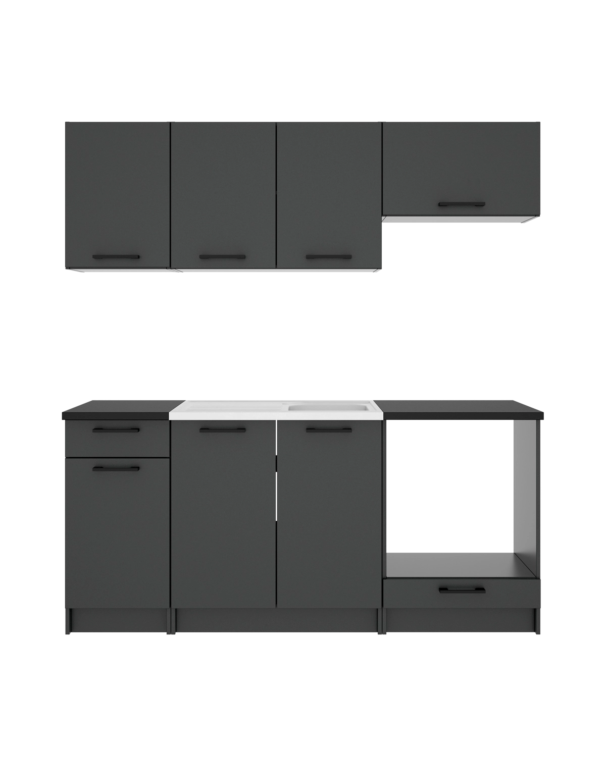 - Este conjunto reúne 3 módulos colgantes destinados a ampliar el almacenaje superior sin restar espacio funcional. Incluye 4 puertas, una de ellas preparada para la campana, lo que permite una instalación práctica y visualmente ordenada en la cocina. En la parte inferior incorpora 2 módulos bajos con 3 puertas, 1 cajón y hueco para fregadero, pensados para organizar la zona de trabajo. El acabado en grafito con encimera negra crea un conjunto moderno y homogéneo, fabricado en tablero laminado para un uso diario cómodo. Además, se completa con un módulo base para horno de 60 cm, que integra el electrodoméstico de forma funcional. Incluye una puerta inferior para almacenaje adicional y permite mantener el horno a una altura cómoda, mejorando la organización y coherencia visual del conjunto.