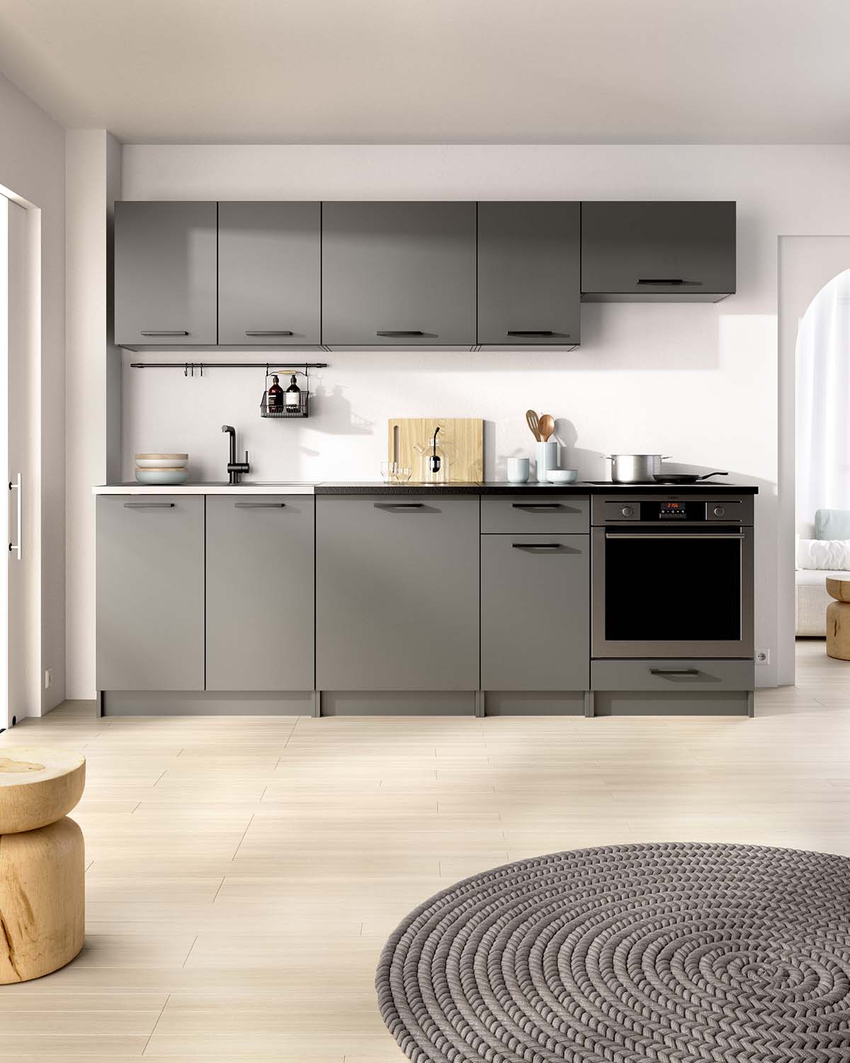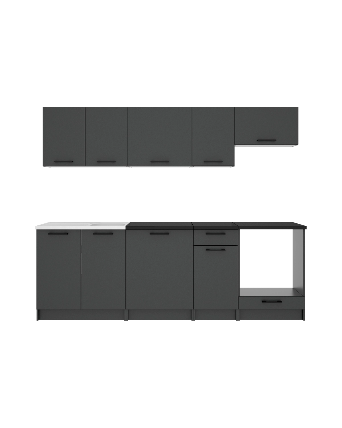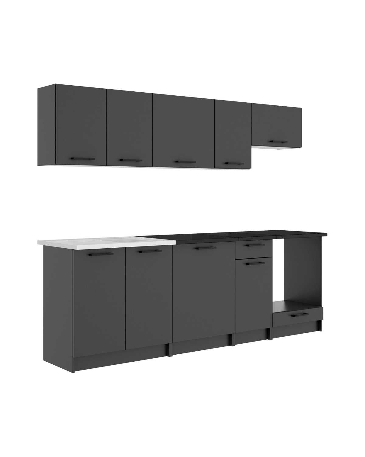 - Este conjunto reúne 3 módulos colgantes destinados a mejorar el almacenaje en la parte superior de la cocina. Dispone de 4 puertas, incluyendo una para la campana, lo que favorece una instalación limpia y coherente. El diseño permite organizar vajilla y despensa de forma accesible. En la parte inferior incorpora 2 módulos bajos con 3 puertas, 1 cajón y hueco para fregadero, pensados para ordenar la zona de trabajo diaria. El acabado en grafito con encimera negra mantiene una estética homogénea, mientras que el tablero laminado garantiza durabilidad y fácil limpieza. El conjunto se amplía con 1 módulo superior y 1 módulo inferior, además de un módulo base para horno de 60 cm. Este último integra el electrodoméstico de forma práctica e incluye almacenaje inferior, mejorando la organización general y aportando una cocina completa, funcional y bien estructurada.