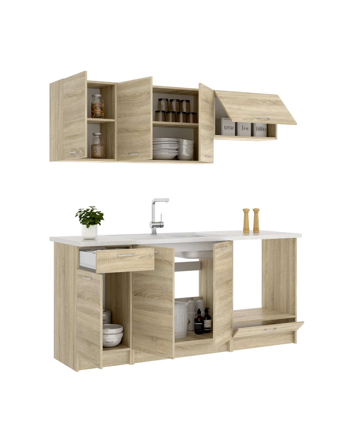 - Este conjunto reúne 3 módulos colgantes destinados a ampliar el almacenaje superior sin restar espacio funcional. Incluye 4 puertas, una de ellas preparada para la campana, lo que permite una instalación práctica y visualmente ordenada en la cocina. En la parte inferior incorpora 2 módulos bajos con 3 puertas, 1 cajón y hueco para fregadero, pensados para organizar la zona de trabajo. El acabado en madera natural con encimera negra crea un conjunto moderno y homogéneo, fabricado en tablero laminado para un uso diario cómodo. Además, se completa con un módulo base para horno de 60 cm, que integra el electrodoméstico de forma funcional. Incluye una puerta inferior para almacenaje adicional y permite mantener el horno a una altura cómoda, mejorando la organización y coherencia visual del conjunto.