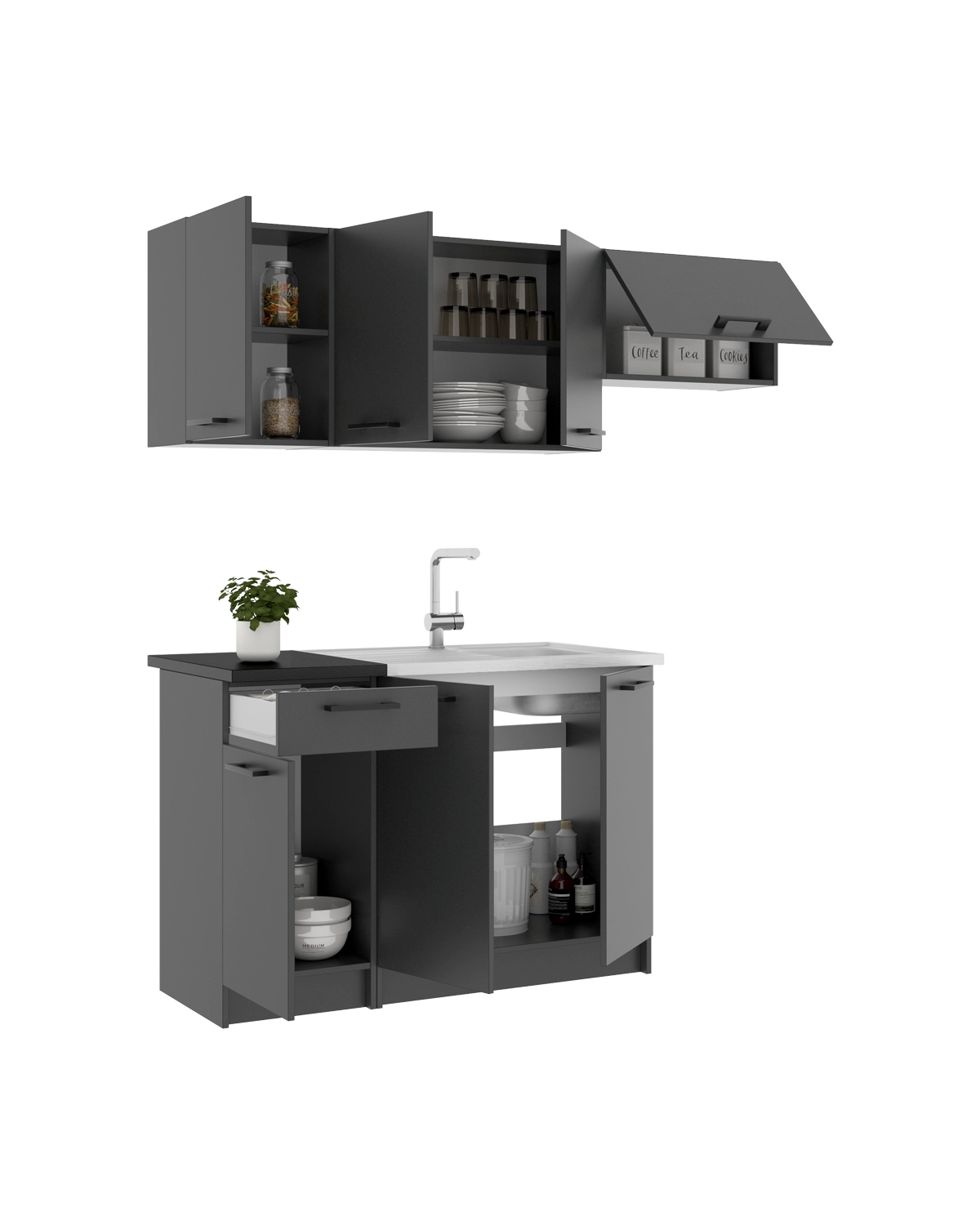 - Este conjunto incluye 3 módulos colgantes pensados para aumentar el almacenaje en la parte superior sin ocupar superficie útil. Dispone de 4 puertas, una preparada para la campana, lo que permite una instalación limpia y funcional. Es una solución práctica para mantener la cocina despejada y bien organizada. El acabado en color grafito aporta un estilo actual y fácil de combinar. Su estructura en tablero laminado ofrece ligereza y resistencia frente al uso diario, además de un mantenimiento sencillo. Está diseñado para integrarse con naturalidad en cocinas de 180 cm. La composición se completa con 2 módulos bajos que organizan la zona de trabajo. Incorporan 3 puertas, 1 cajón y hueco para fregadero, facilitando la distribución del menaje, productos de limpieza y utensilios. Una opción eficiente para cocinas que priorizan orden y accesibilidad.