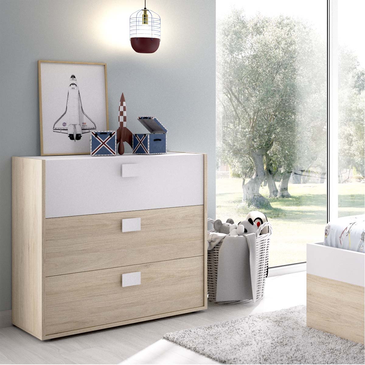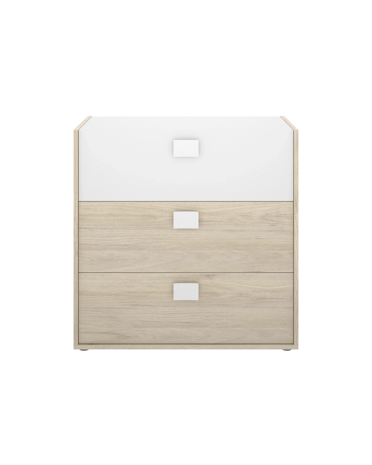 - La cómoda Dina combina blanco y madera natural para aportar un estilo moderno y muy fácil de integrar. Su formato vertical permite aprovechar el espacio sin recargar el dormitorio. Cuenta con tres amplios cajones de suave deslizamiento, ideales para guardar ropa, complementos o textiles de uso diario. Su diseño equilibrado aporta orden y una estética limpia. Fabricada en tablero melaminizado y trasera en fibras de densidad media, ofrece durabilidad y buena estabilidad. Incluye fijación a pared y tacos ABS antirrayaduras para un uso seguro.