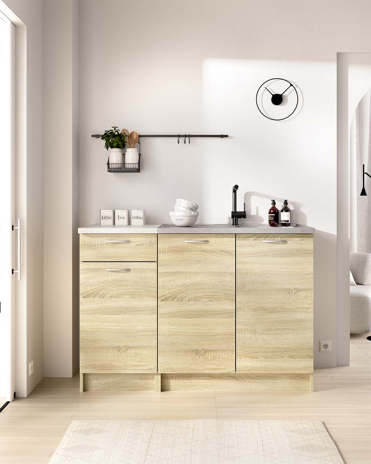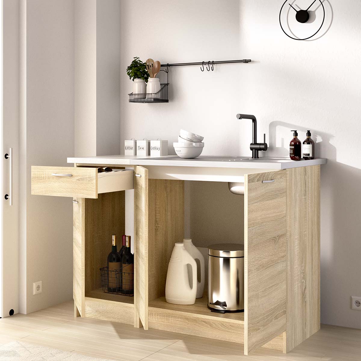 - Este conjunto está formado por 2 módulos bajos que combinan almacenaje cerrado y un hueco destinado al fregadero, facilitando una distribución funcional en cocinas compactas o medianas. Incluye 3 puertas y 1 cajón, ideales para organizar utensilios y productos de limpieza. Dispone de montaje reversible y un zócalo de 10 cm, aportando estabilidad y permitiendo integrar el conjunto con diferentes alturas de encimera. El fondo de 60 cm maximiza la capacidad interior. Su acabado en madera natural y beige aporta calidez, mientras que el tablero laminado, los tiradores de plástico y las bisagras metálicas aseguran durabilidad en un uso diario.