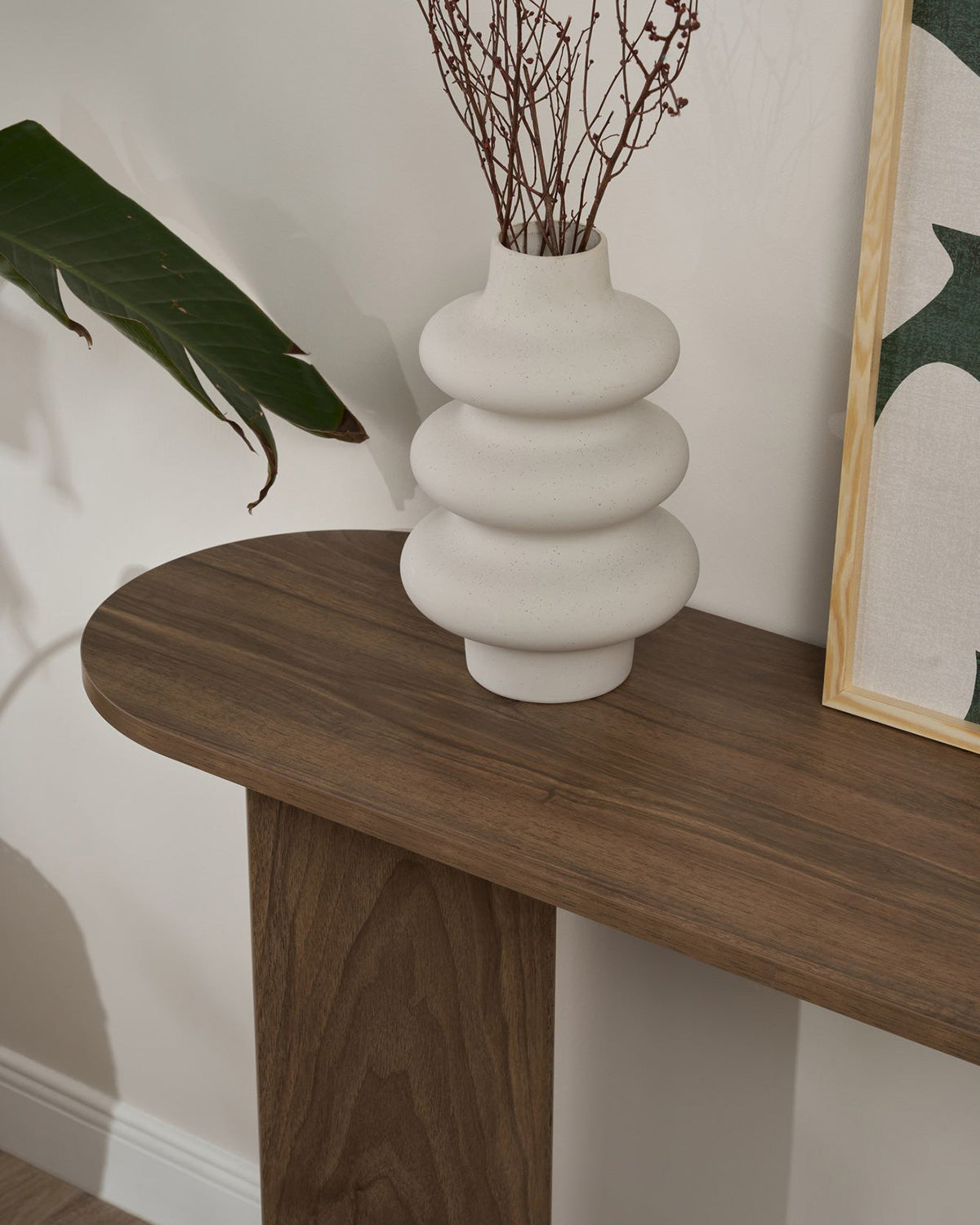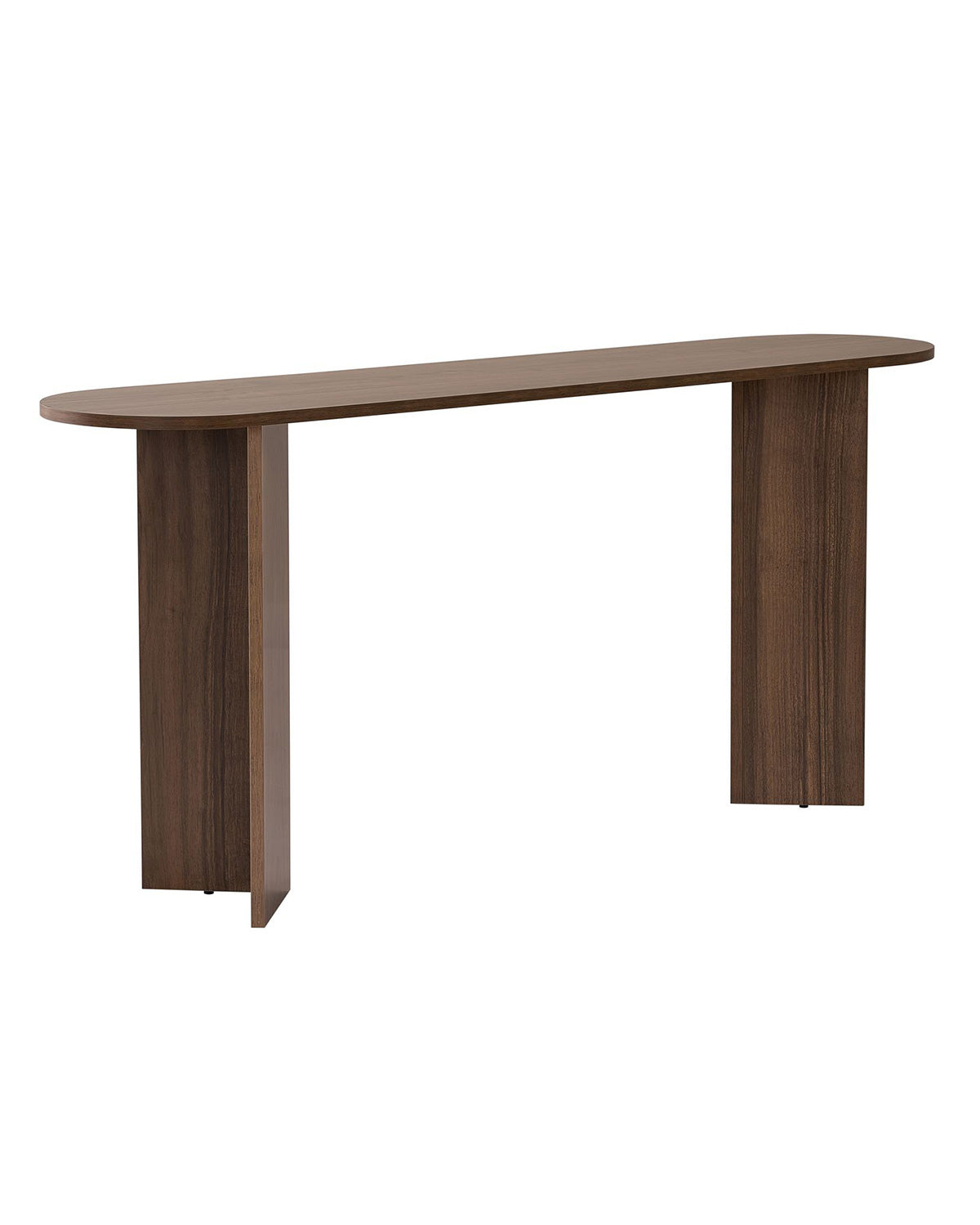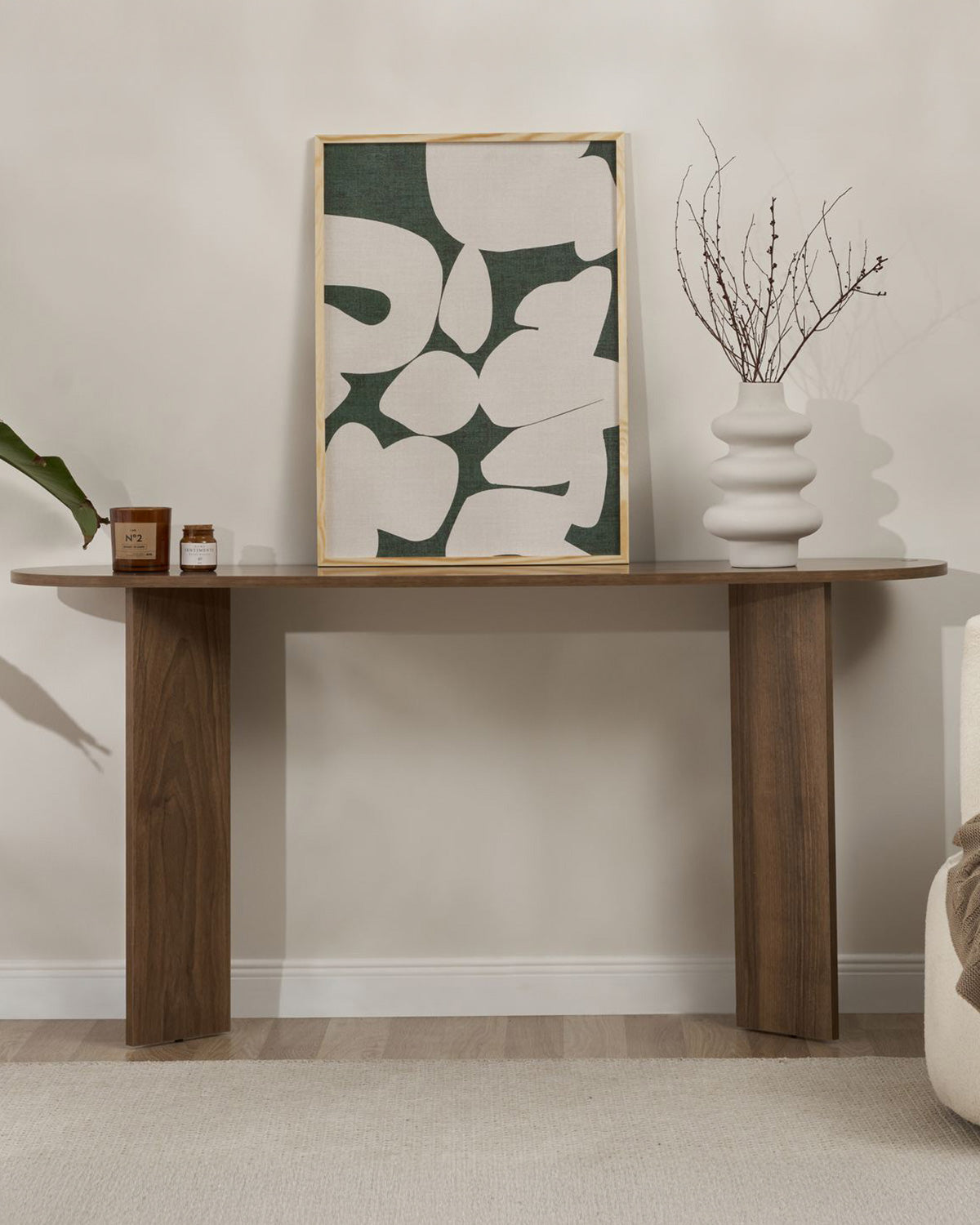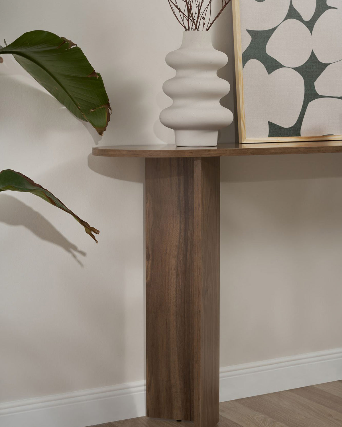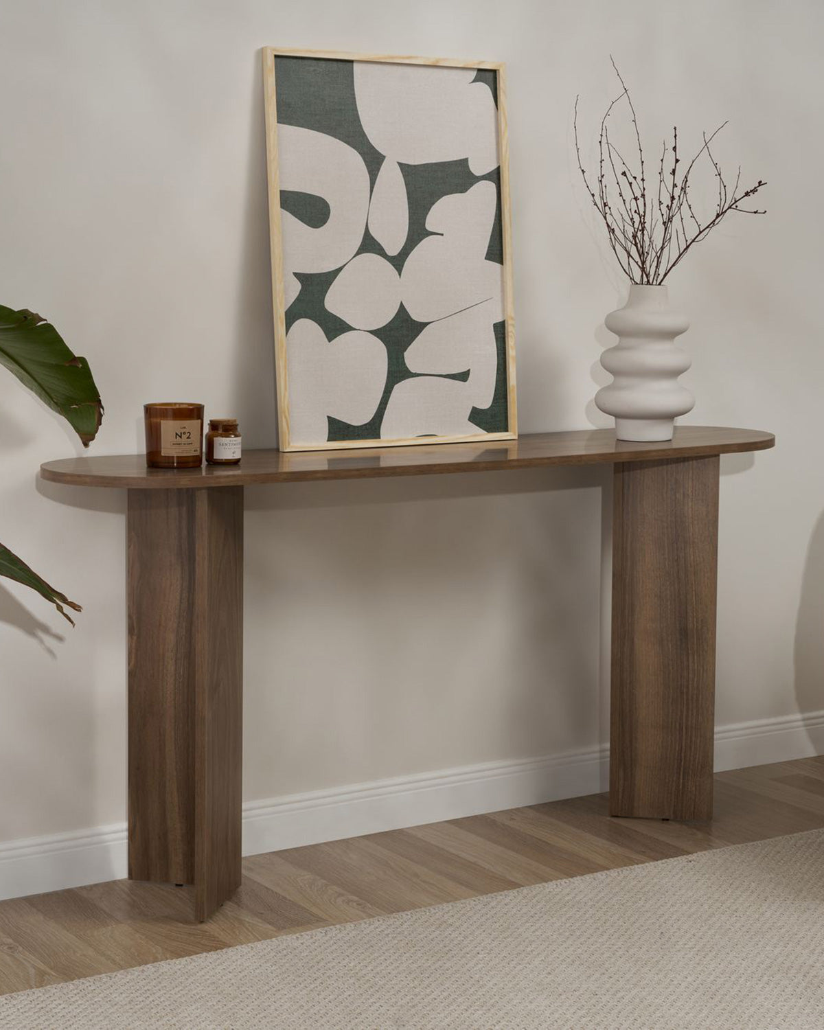 - La consola Elsie en acabado madera oscura combina elegancia y sobriedad en una pieza de líneas depuradas. Su tonalidad cálida aporta profundidad y carácter al ambiente, convirtiéndola en un punto focal perfecto en espacios de inspiración moderna o clásica. Elaborada en tablero de partículas melaminizado, ofrece una superficie resistente y fácil de limpiar, pensada para el uso cotidiano. Su diseño de proporciones amplias permite decorar con naturalidad, ya sea con piezas decorativas, marcos o elementos funcionales como una bandeja vaciabolsillos. De 150 cm de ancho, la consola Elsie añade un toque refinado sin ocupar demasiado espacio, aportando equilibrio entre estética y practicidad en recibidores, pasillos o zonas abiertas del hogar.