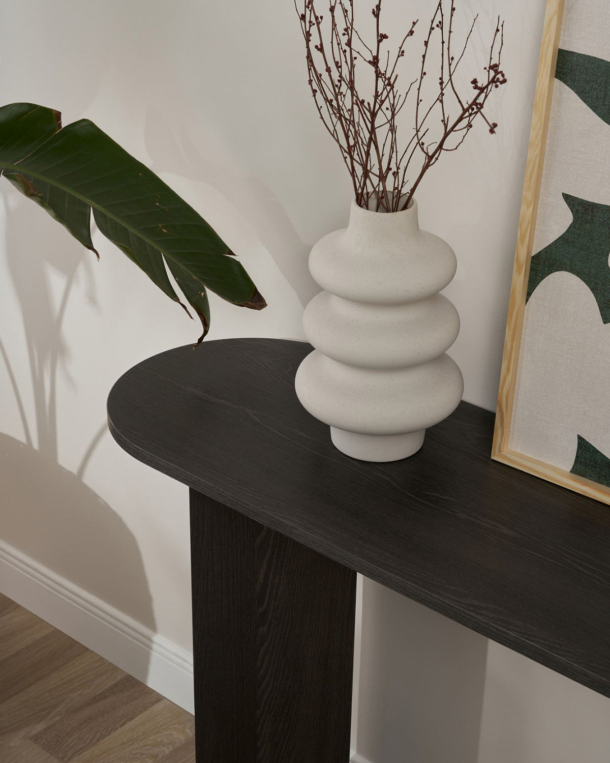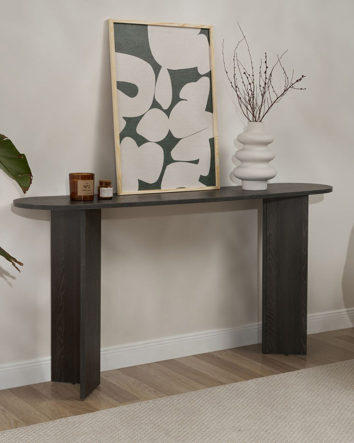 - La consola Elsie en color negro destaca por su elegancia atemporal y su presencia escultural. Su acabado uniforme y mate la convierte en una pieza de carácter, ideal para espacios contemporáneos o industriales donde el contraste y la sobriedad son protagonistas. Fabricada en tablero de partículas melaminizado, ofrece estabilidad y durabilidad, con una superficie de fácil mantenimiento. Su diseño depurado refuerza la sensación de orden y amplitud, aportando un toque moderno sin renunciar a la calidez del mobiliario de interior. Sus 150 cm de longitud permiten decorar con equilibrio y estilo cualquier estancia: un recibidor, un pasillo o un rincón del salón. Una consola práctica y decorativa que combina diseño y funcionalidad en una misma pieza.
