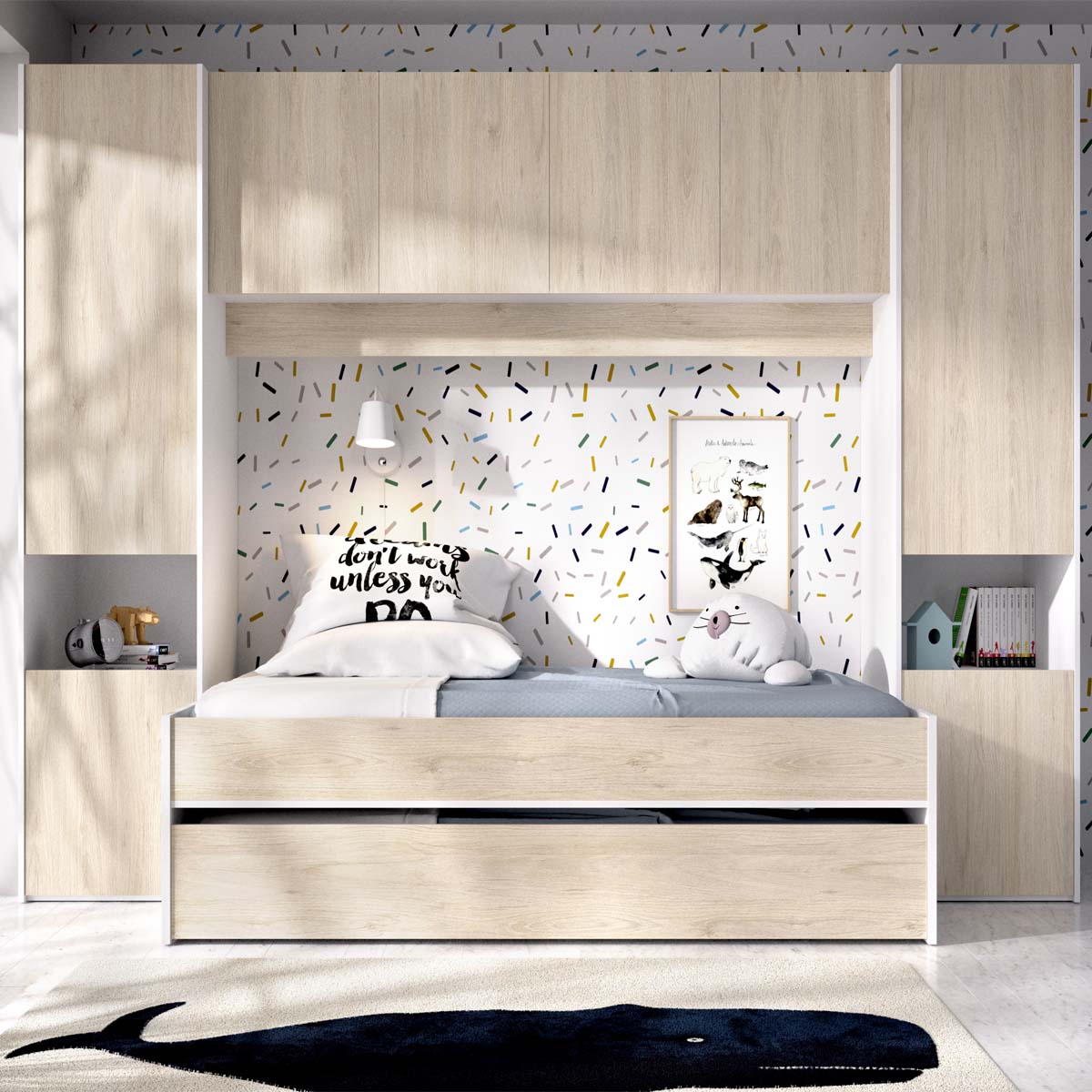 - El dormitorio puente juvenil Kwai está concebido para aprovechar cada centímetro del espacio disponible con una composición práctica y estética. Su diseño en blanco y roble natural combina la luminosidad de los tonos claros con la calidez de la madera, creando un entorno juvenil, ordenado y acogedor. El conjunto integra dos camas de 90 x 190 cm, una principal y otra inferior con arrastre, que se desplaza fácilmente gracias a sus ruedas unidireccionales con soporte metálico. Ambas cuentan con bases con orificios de ventilación, por lo que no requieren somier, y se apoyan sobre tacos ABS antirrayaduras y quitarruidos para garantizar estabilidad y proteger el suelo. Sobre la zona de descanso se dispone un completo conjunto de armarios superiores y laterales, que amplía notablemente la capacidad de almacenaje. Dos de ellos incorporan barras para colgar ropa, ideales para prendas largas, mientras que los restantes ofrecen estantes interiores que facilitan la organización de ropa, textiles o accesorios. Fabricado en tablero de partículas melaminizado, este dormitorio puente combina durabilidad, comodidad y diseño, siendo una solución perfecta para dormitorios donde el espacio debe rendir al máximo.