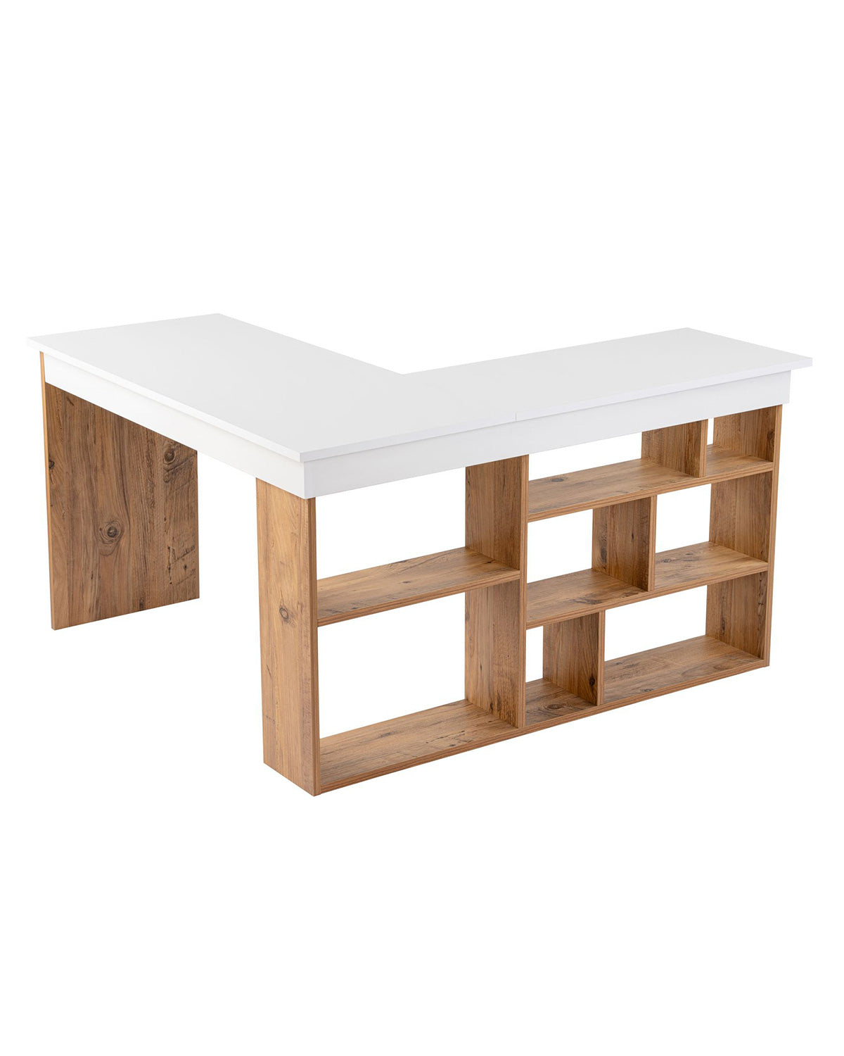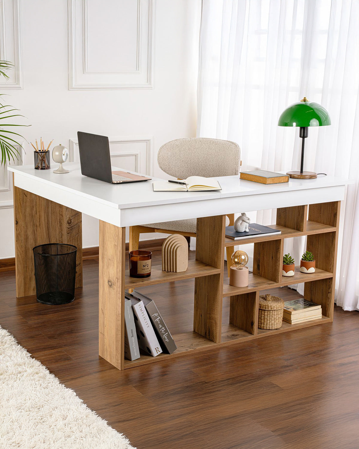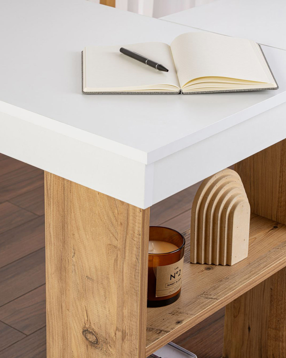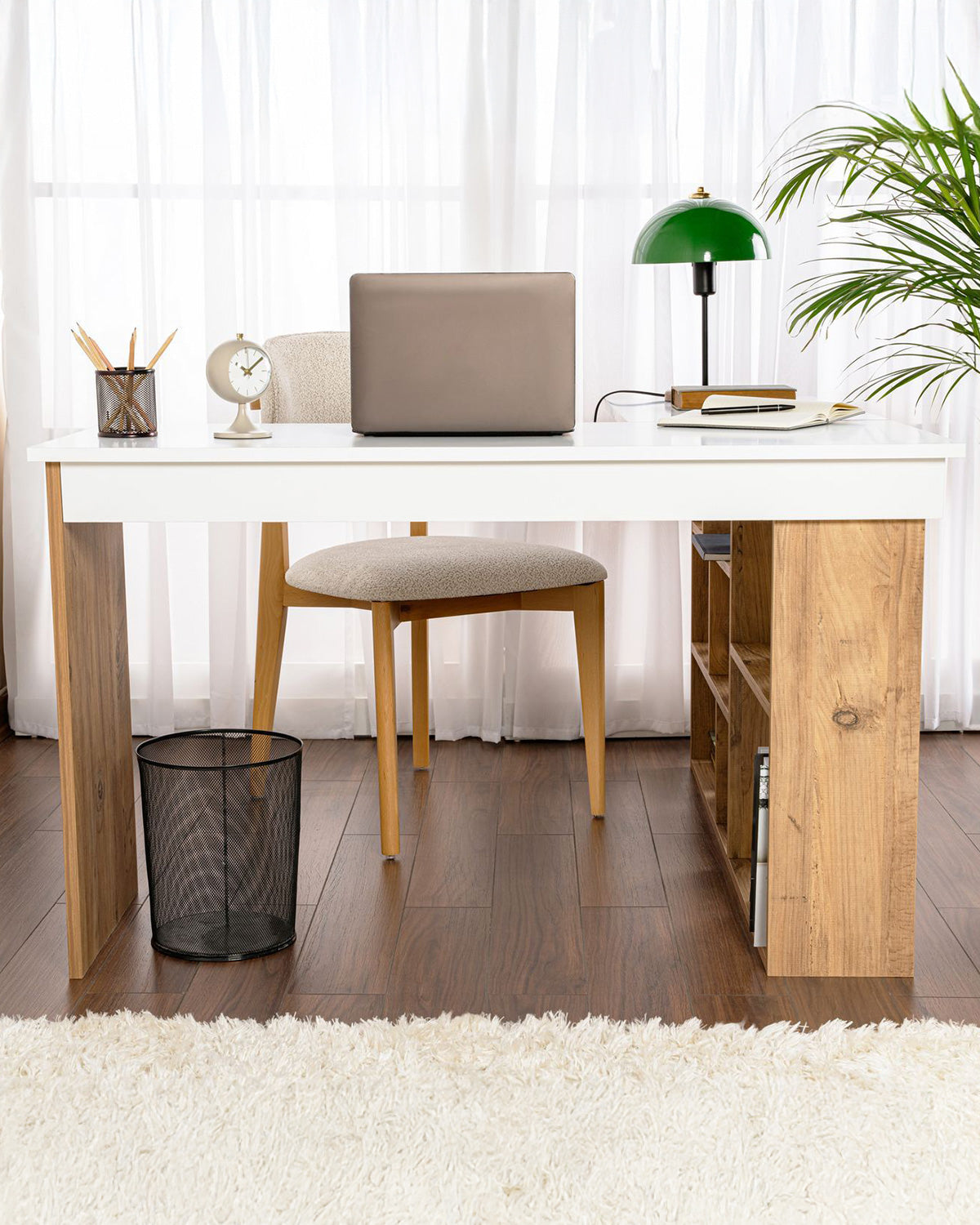 - El escritorio Debra combina diseño funcional y estilo contemporáneo para crear un espacio de trabajo cómodo y bien organizado. Su mezcla de madera natural con blanco transmite luminosidad y equilibrio, integrándose fácilmente en oficinas domésticas, dormitorios juveniles o zonas de estudio modernas. Incorpora amplios estantes laterales, perfectos para mantener a mano libros, carpetas o material de trabajo, optimizando el espacio sin necesidad de muebles adicionales. Su estructura en tablero de partículas melaminizado garantiza estabilidad, resistencia y un mantenimiento sencillo, ideal para el uso diario. Con 130 cm de ancho y 120 cm de fondo, ofrece una superficie espaciosa para trabajar con ordenador o realizar tareas creativas. El escritorio Debra es una pieza versátil que combina estética, funcionalidad y orden en un mismo diseño, perfecta para crear entornos de trabajo inspiradores y prácticos.