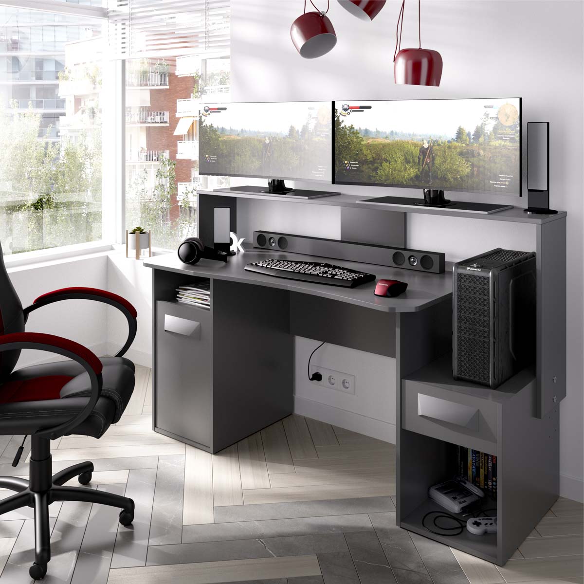 - El escritorio gamer Fosk combina diseño funcional y estética contemporánea, pensado para quienes buscan un espacio de trabajo o juego organizado y visualmente equilibrado. Su acabado en grafito aporta un aire moderno y elegante, fácilmente integrable en habitaciones juveniles o zonas gaming. Las líneas rectas y el diseño compacto transmiten orden y estabilidad, adaptándose tanto a entornos de ocio como a áreas de estudio. Fabricado en tablero de partículas melaminizado, ofrece una superficie resistente y de fácil limpieza. Incluye un cajón con acabado textil y guías metálicas de suave deslizamiento, además de una puerta para mantener ocultos los accesorios o dispositivos y conservar la estética despejada del conjunto. El montaje reversible permite configurar el mueble según las necesidades del espacio, mientras los tacos ABS antirrayaduras y quitarruidos garantizan estabilidad y protección del suelo. Un escritorio robusto y versátil que combina confort, funcionalidad y estilo. Su acabado oscuro y su diseño equilibrado lo convierten en una pieza ideal para mantener el orden en un entorno dinámico, ofreciendo una base sólida para concentrarse o disfrutar del juego sin distracciones.