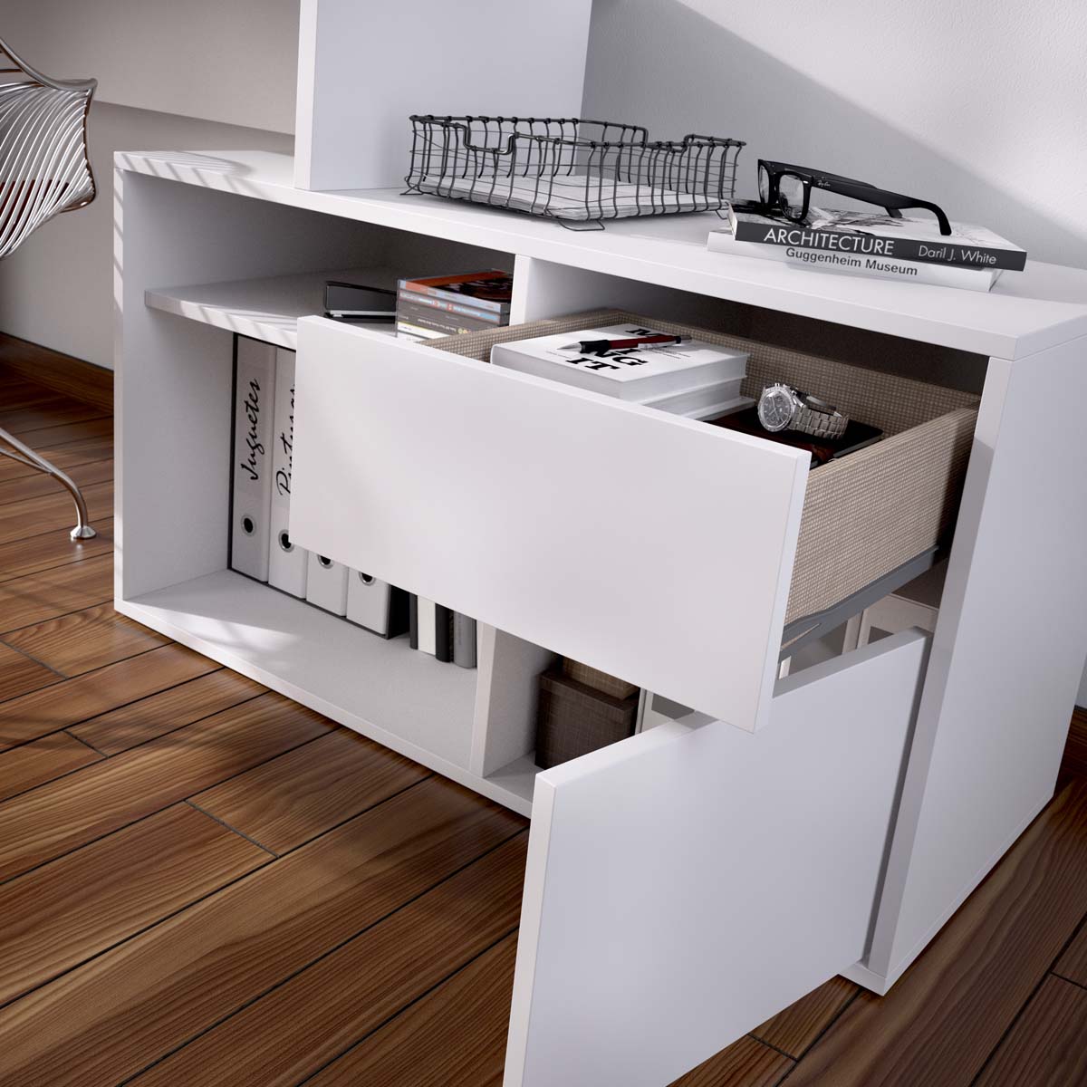 - Incluye tacos ABS quitarruidos y antirrayaduras para las patas. Cajones con acabado textil y con guías metálicas de suave deslizamiento.