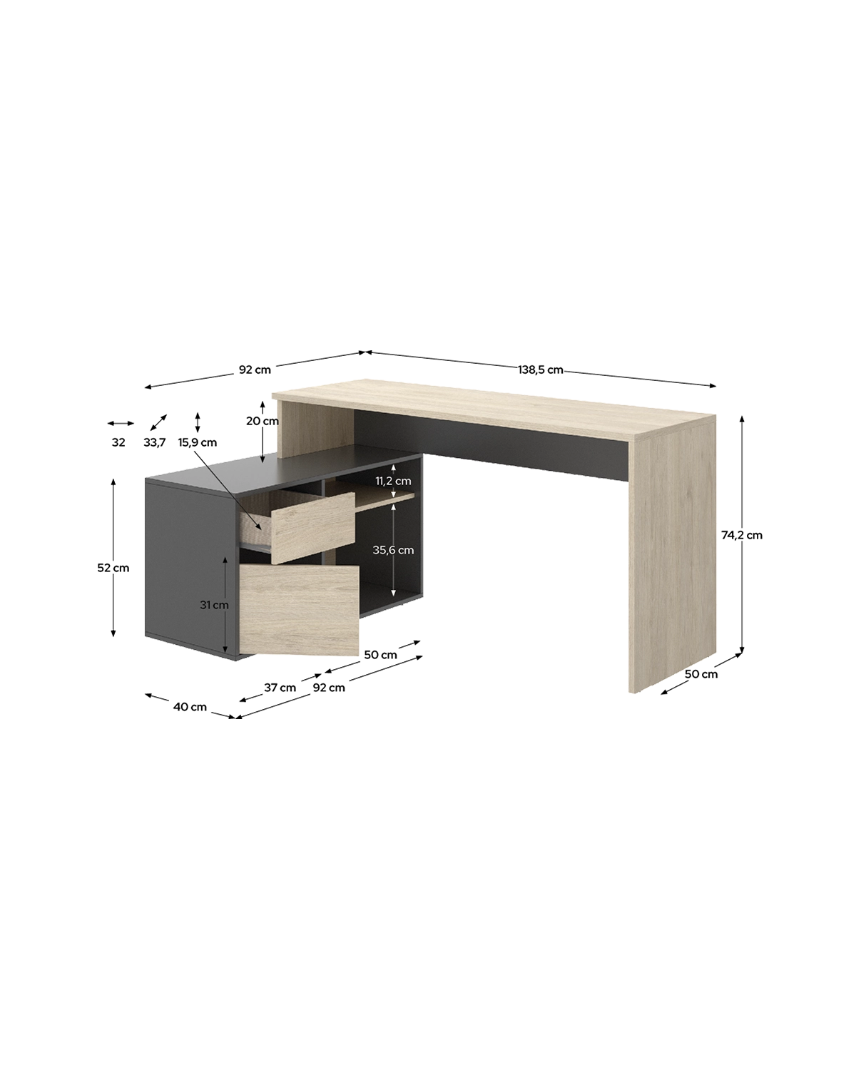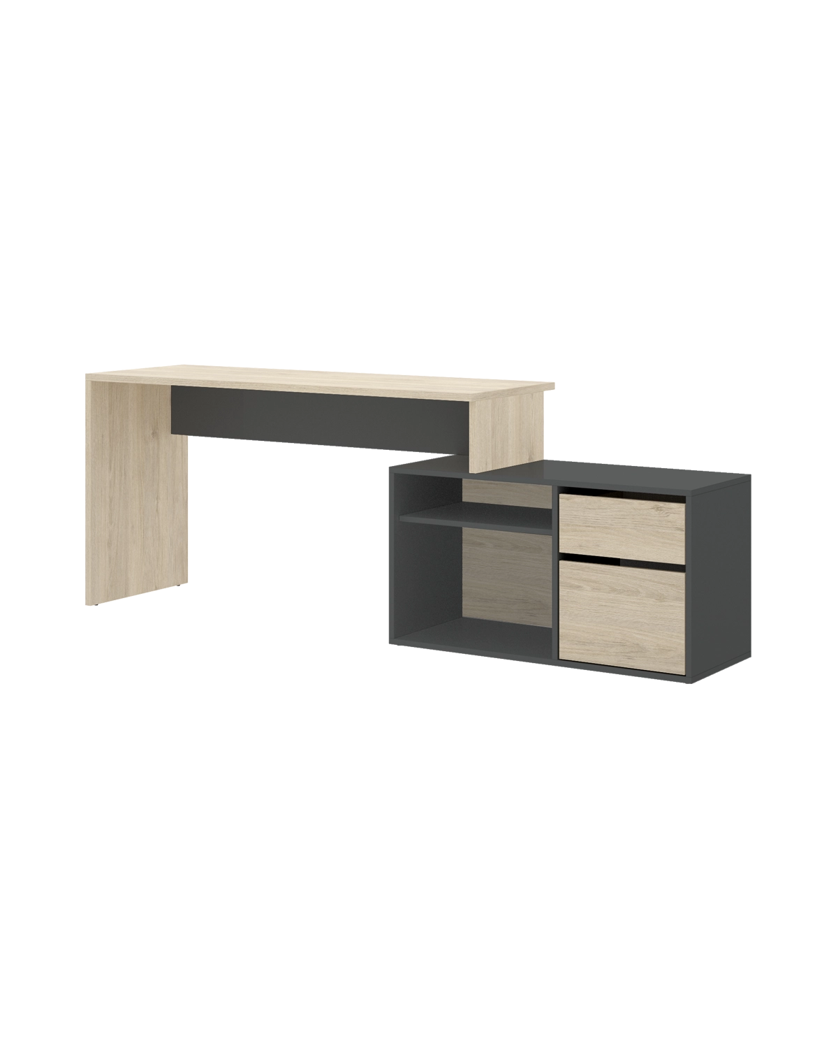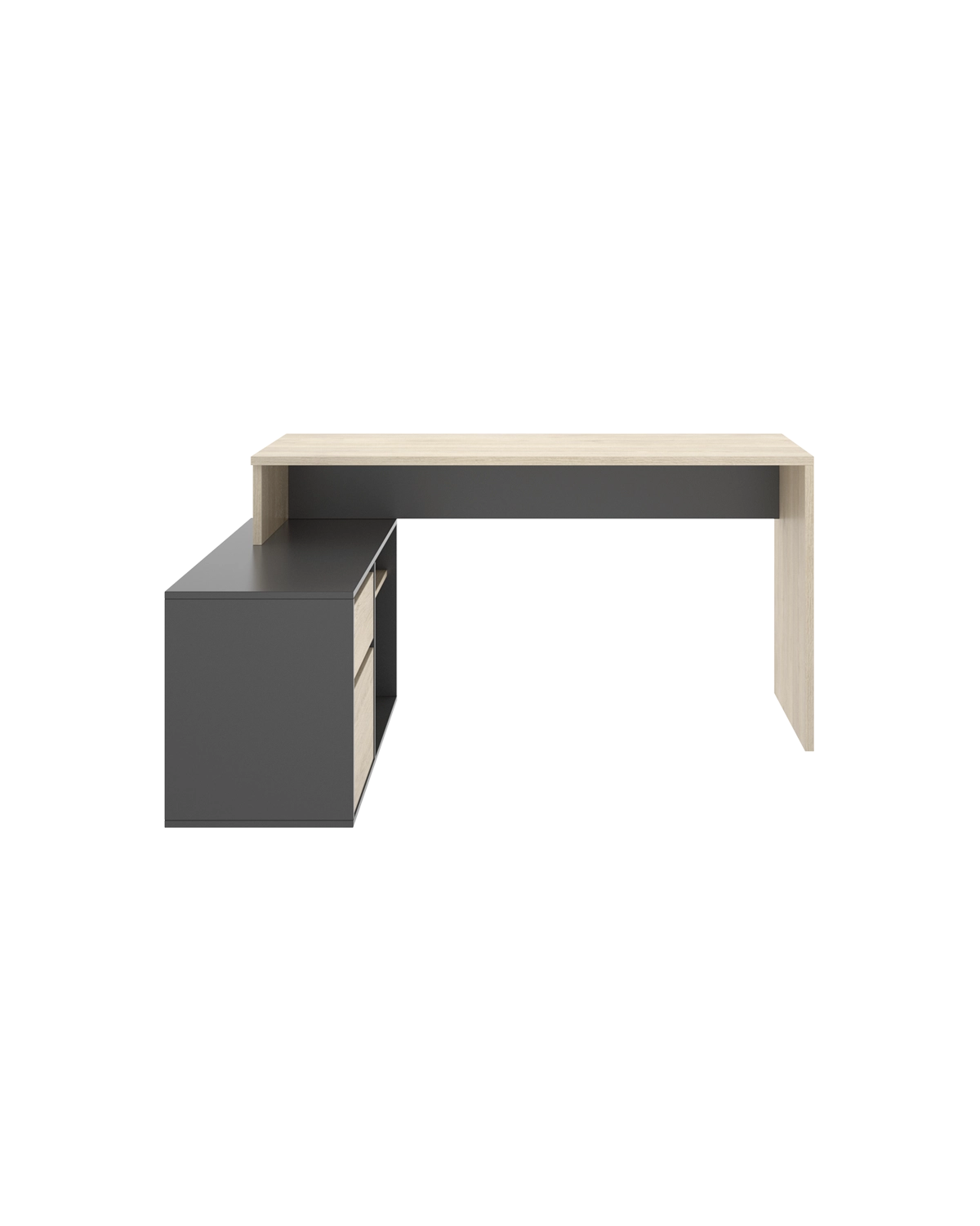 - El escritorio reversible Rox combina funcionalidad y diseño equilibrado, ideal para crear espacios de trabajo o estudio con personalidad. Su acabado en roble natural y grafito aporta calidez y contraste, integrándose con facilidad en interiores modernos o industriales. Las líneas limpias y proporciones equilibradas favorecen una atmósfera ordenada y visualmente ligera, perfecta para home office o dormitorios juveniles. Fabricado en tablero de partículas melaminizado, ofrece una superficie resistente y fácil de mantener. Dispone de un cajón con acabado textil y guías metálicas de suave deslizamiento, además de una puerta que permite ocultar material y mantener el orden. El montaje reversible facilita adaptar la disposición del módulo a las necesidades del espacio, y los tacos ABS antirrayaduras y quitarruidos protegen el suelo y aseguran estabilidad. Un escritorio versátil que equilibra diseño y utilidad, pensado para favorecer la concentración y mantener una rutina organizada. Su combinación de tonos naturales y oscuros añade carácter sin sobrecargar el ambiente, convirtiéndose en un elemento funcional y decorativo dentro del hogar.