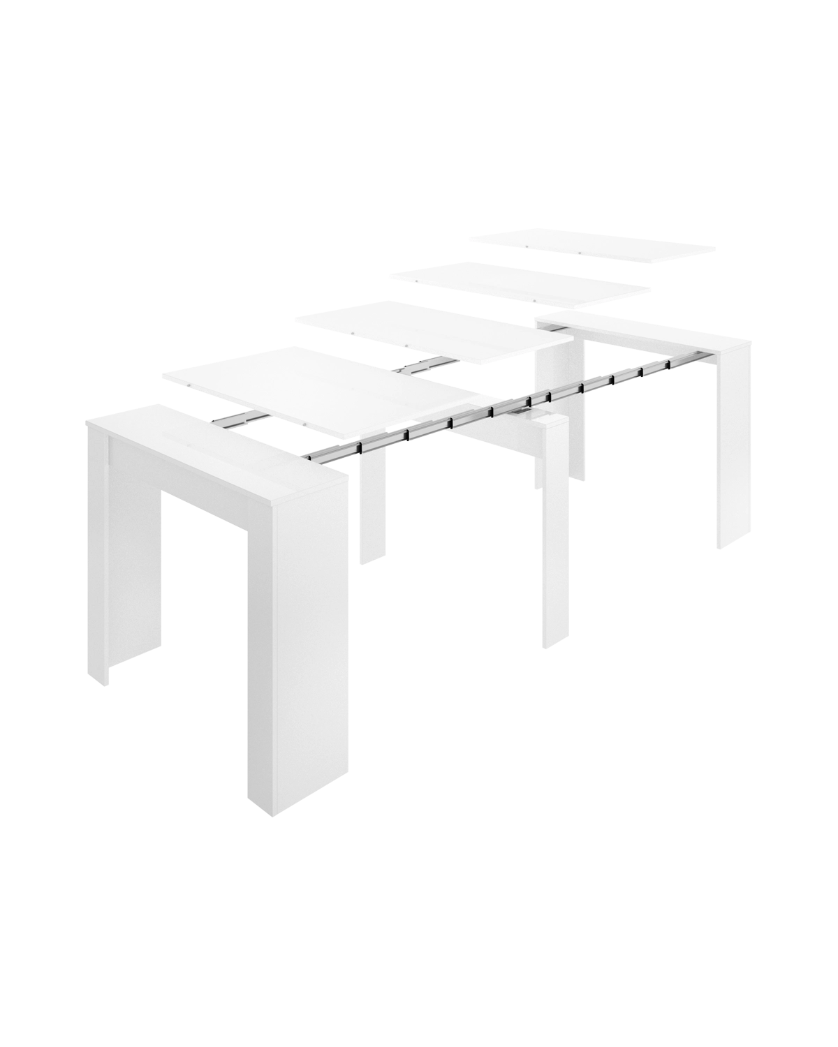 - La mesa consola extensible Kiona en blanco brillo destaca por su enorme funcionalidad, actuando como consola compacta, zona de trabajo o mesa de comedor capaz de acoger hasta 10 personas gracias a su sistema de extensión por tramos. Esta capacidad la convierte en una pieza ideal para espacios cambiantes. Sus suplementos interiores se almacenan dentro del propio mueble, facilitando un uso cómodo y ordenado mientras se adapta a cualquier necesidad diaria o a visitas inesperadas. El tablero melaminizado y su estructura estable aseguran un comportamiento sólido en cada apertura, ofreciendo un mueble transformable, resistente y perfecto para quienes buscan maximizar el espacio sin perder estilo.