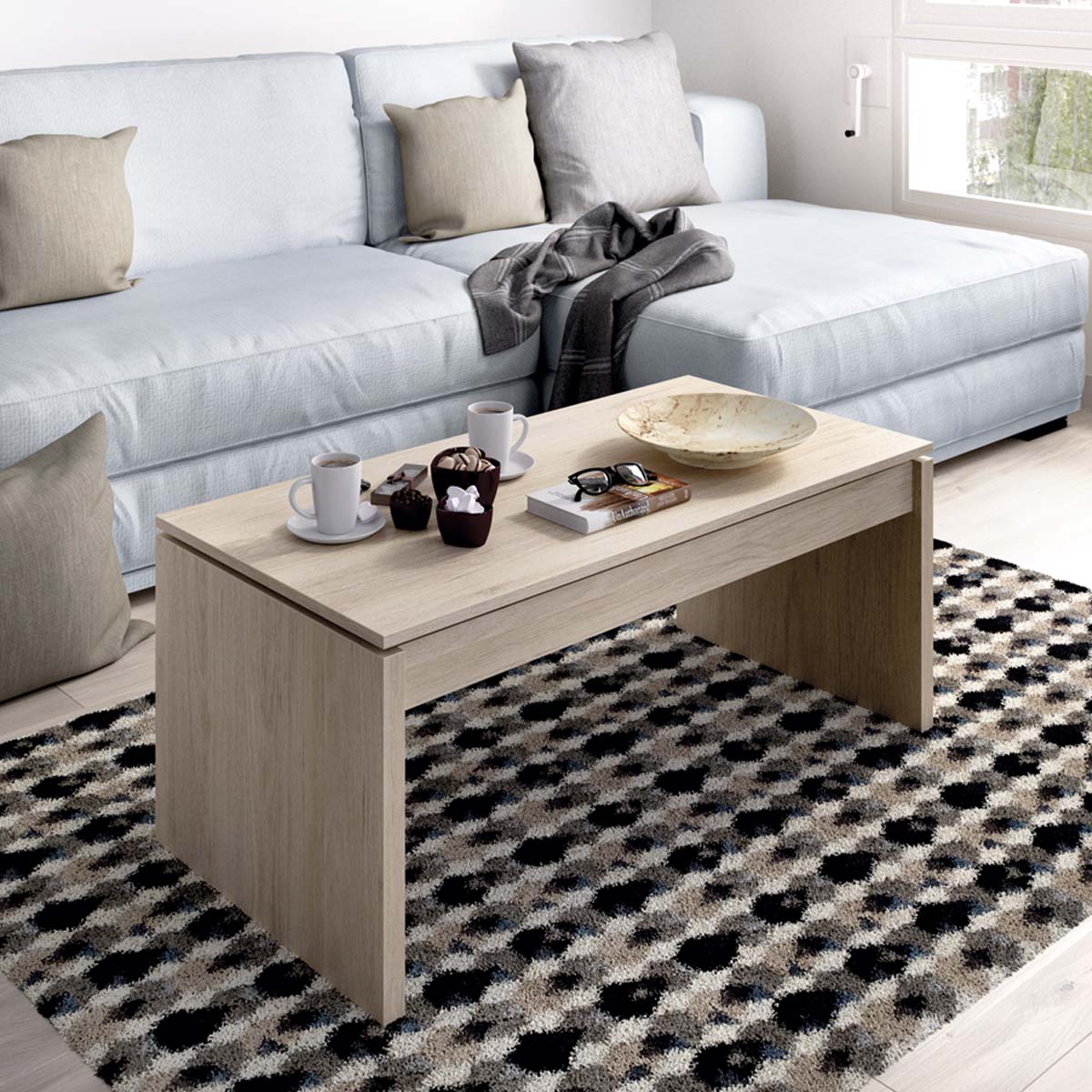 - Esta mesa de centro destaca por su sobre elevable, una solución perfecta para adaptar el espacio según lo necesites: trabajar desde el sofá, cenar cómodamente o simplemente acercar los objetos del día a día. Su diseño en color madera natural aporta calidez y combina con cualquier estilo de salón. Al elevar el sobre alcanza una altura máxima de 53,2 cm, manteniendo una estructura estable gracias a su compás metálico. Bajo la tapa encontrarás un práctico espacio de almacenaje ideal para guardar mandos, revistas o pequeños accesorios. Fabricada con tablero melaminizado de 16–30 mm, incluye tacos ABS antirrayaduras y patas de 33 cm que aportan una base sólida. Es una mesa funcional, resistente y pensada para un uso diario cómodo.