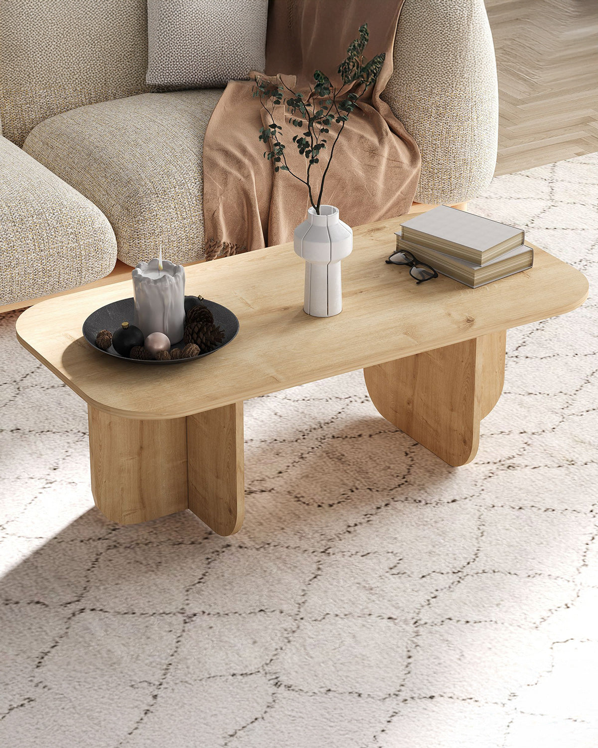 - La mesa de centro Lucille en acabado madera natural combina calidez y diseño contemporáneo en una pieza de líneas suaves y equilibradas. Sus cantos redondeados aportan un acabado más delicado y seguro, ideal para hogares donde se busca comodidad y funcionalidad sin renunciar al estilo. Con una superficie de 120 x 60 cm, ofrece espacio suficiente para decorar, apoyar bandejas o mantener a mano objetos de uso diario. Fabricada en tablero de partículas melaminizado, destaca por su resistencia y fácil mantenimiento. Su tono claro y natural encaja en ambientes nórdicos o modernos, aportando luminosidad y armonía al salón. Una mesa versátil y atemporal que crea un punto central acogedor en la zona de estar.