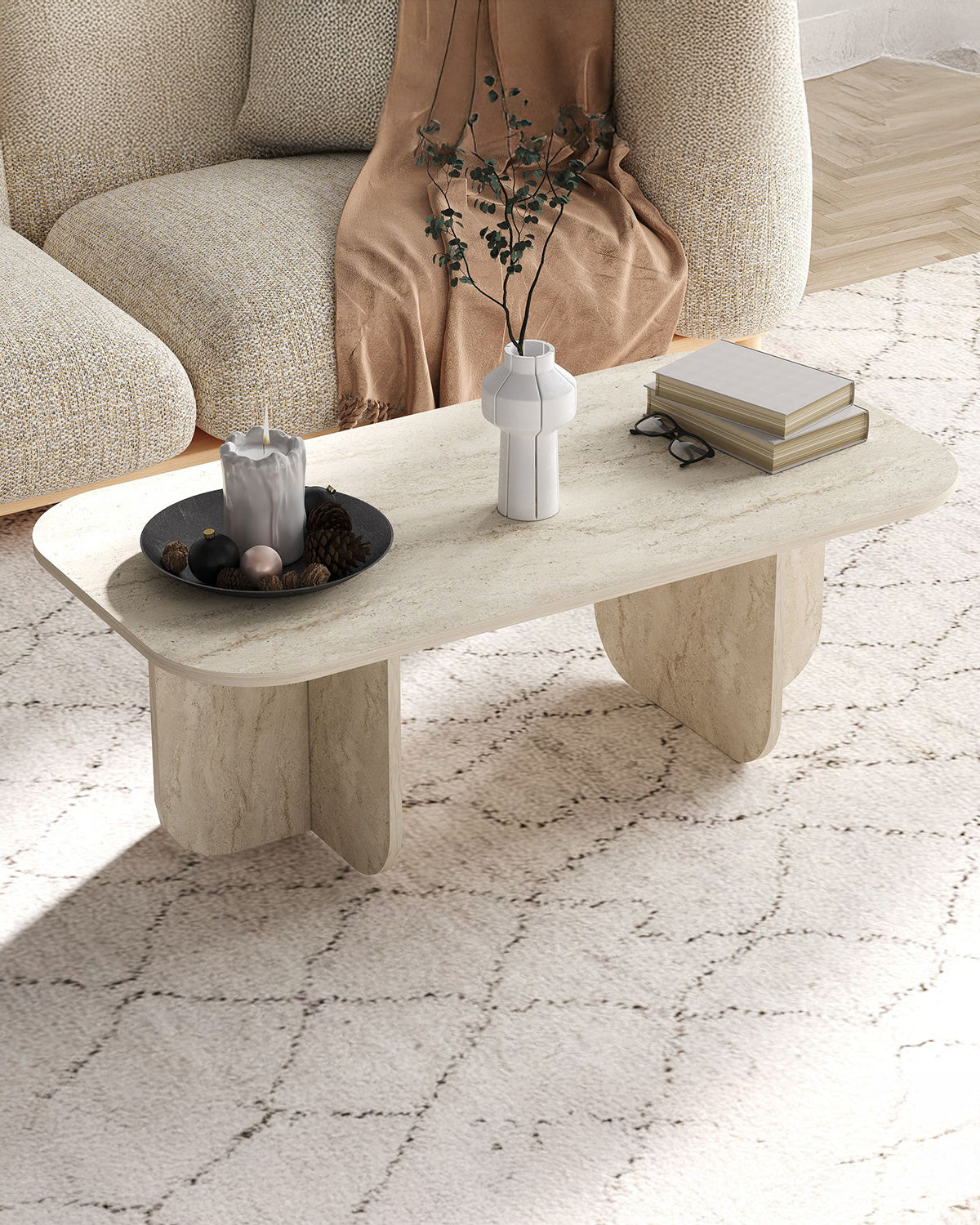 - La mesa de centro Lucille en color travertino destaca por su diseño elegante y su acabado de inspiración mineral, con cantos redondeados que suavizan su silueta y refuerzan su estética contemporánea. Este detalle aporta una sensación visual más ligera y agradable al tacto. Su amplia superficie de 120 x 60 cm la convierte en una pieza funcional y decorativa, ideal para colocar bandejas, libros o adornos. Fabricada en tablero de partículas melaminizado, ofrece una estructura sólida y de fácil limpieza. El acabado travertino añade un toque sofisticado que combina con muebles en tonos neutros o materiales naturales, creando un ambiente equilibrado y refinado en el salón.
