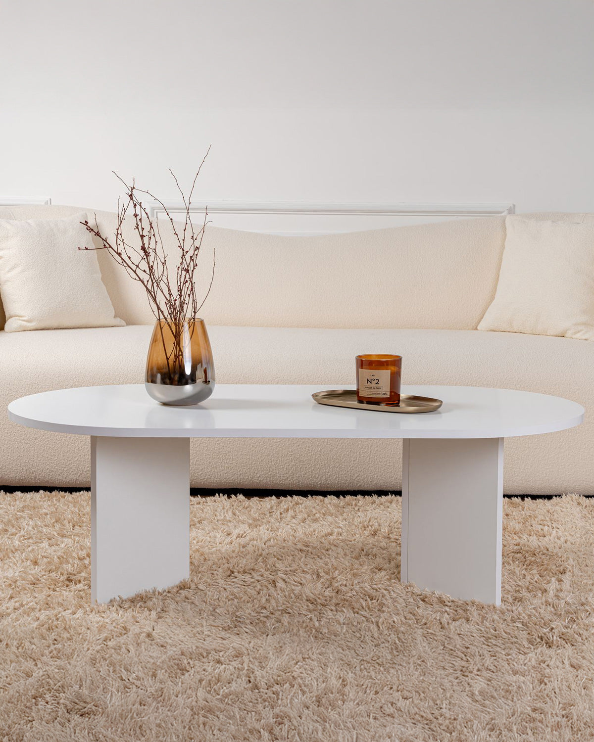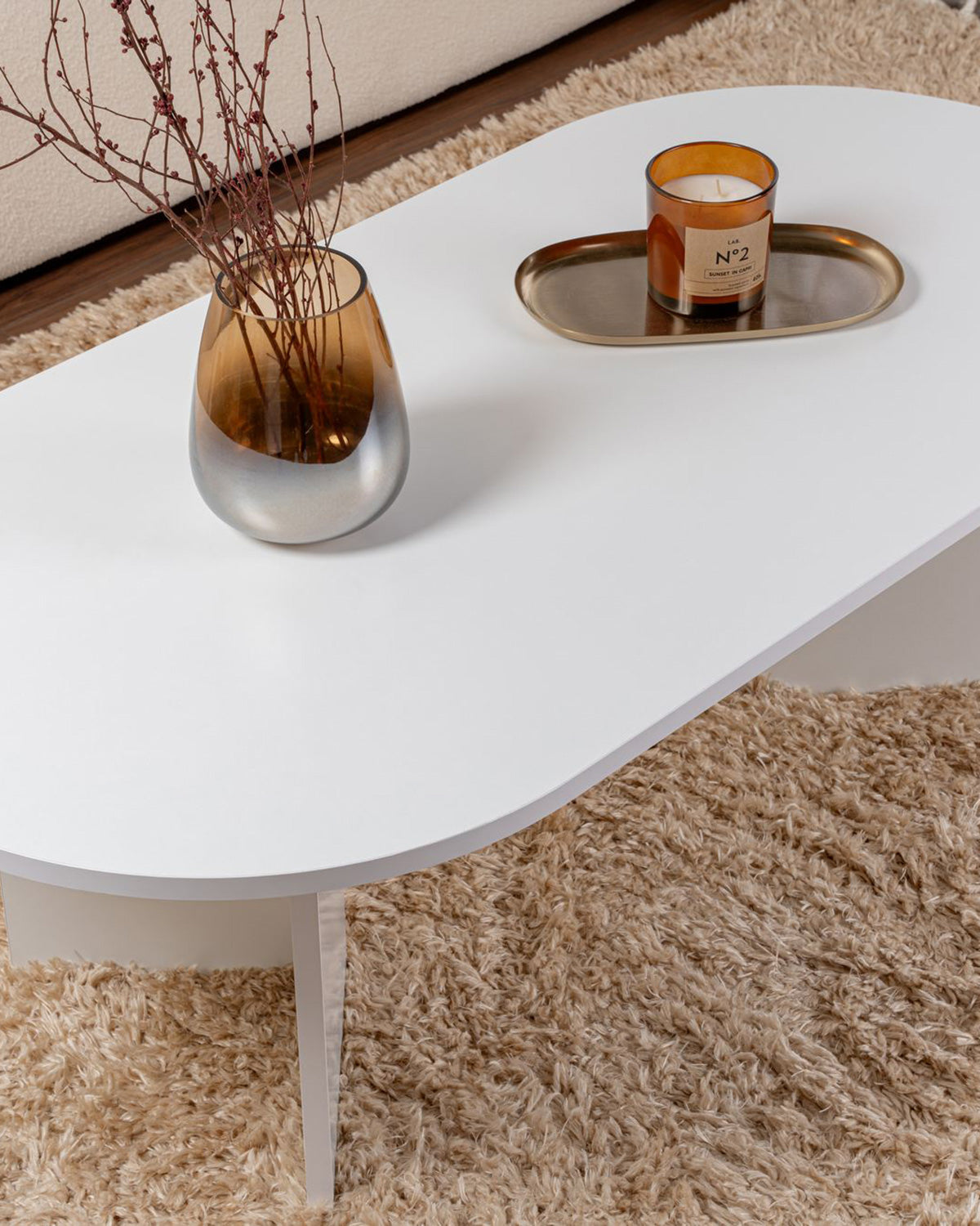 - La mesa de centro Arline en color blanco es una pieza de estilo minimalista que aporta amplitud y luminosidad al salón. Su diseño ovalado con bordes redondeados suaviza las líneas y crea una sensación de armonía visual. Su superficie de 119 x 60 cm resulta práctica y versátil, ideal para espacios modernos y funcionales. Fabricada en tablero de partículas melaminizado, ofrece una estructura sólida, resistente al uso diario y fácil de limpiar. El acabado blanco mate combina con cualquier decoración, desde ambientes escandinavos hasta los más contemporáneos, aportando frescura y equilibrio.