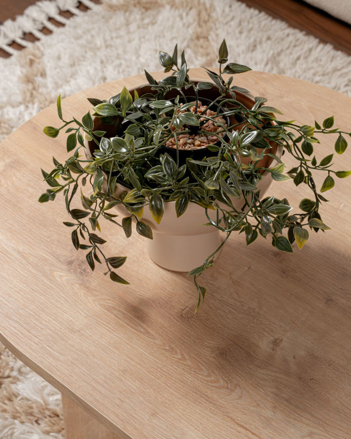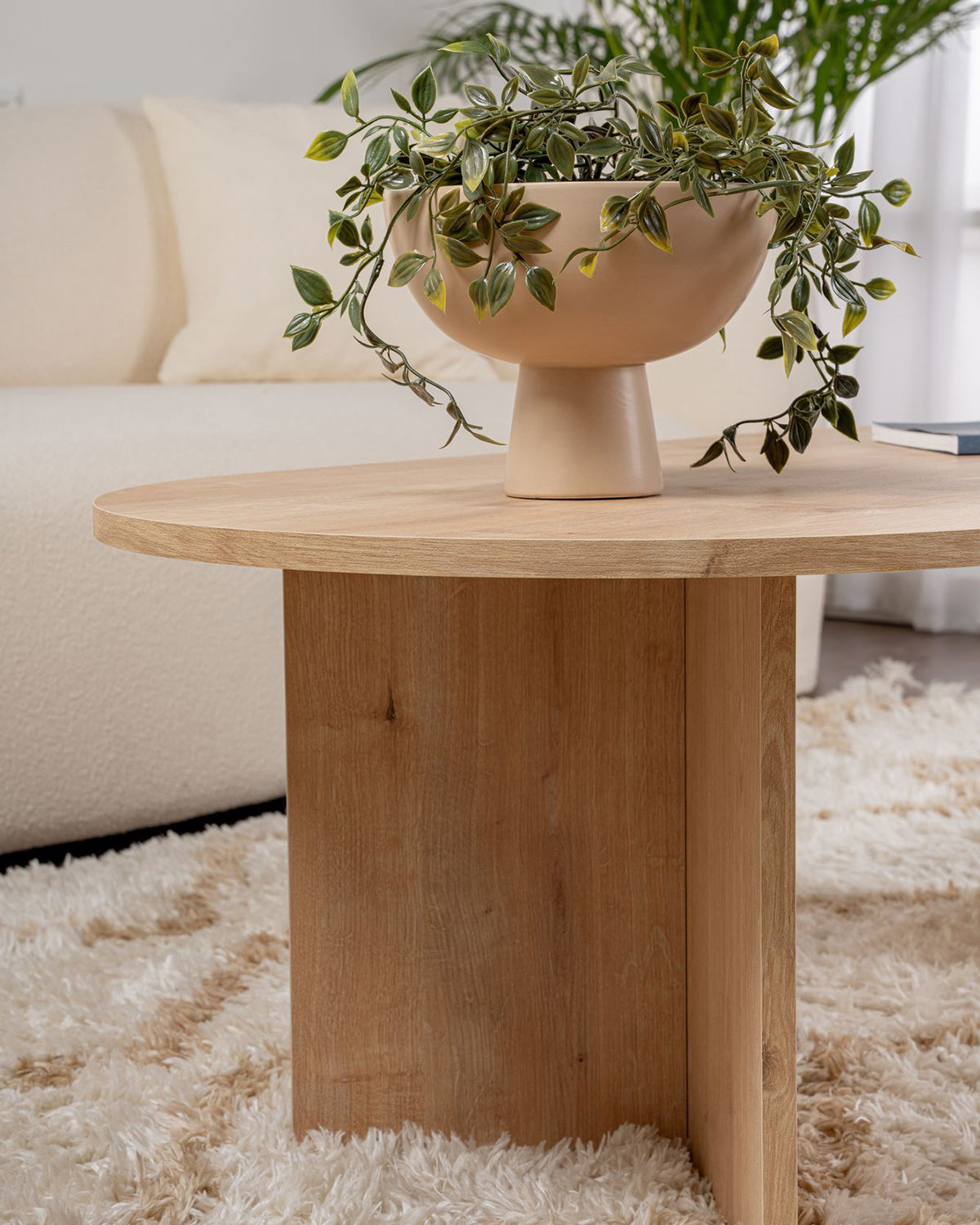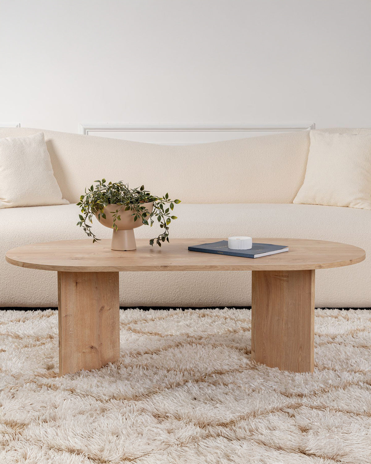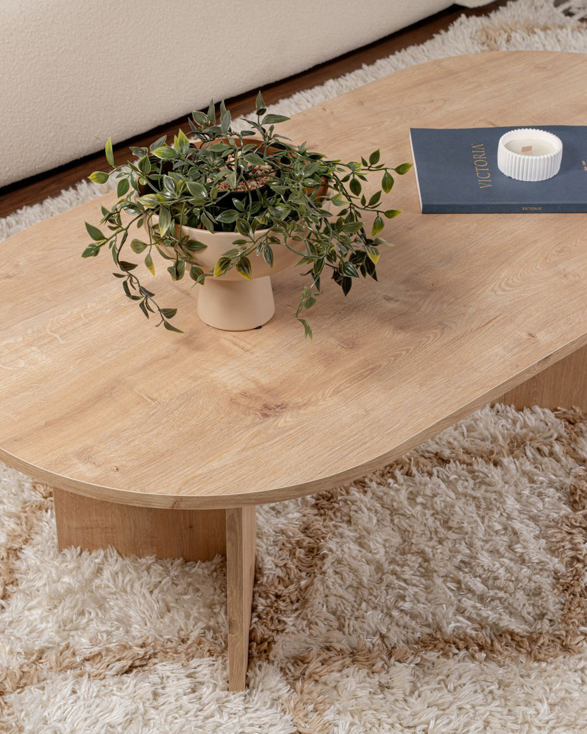 - La mesa de centro ovalada Arline en acabado madera natural combina diseño orgánico y calidez en una pieza versátil y elegante. Su forma ovalada y cantos redondeados suavizan la presencia en el salón, aportando fluidez visual y mayor seguridad en el uso diario. Con unas dimensiones de 119 x 60 cm, ofrece una amplia superficie para el día a día, perfecta para decorar o apoyar bandejas y libros. Fabricada en tablero de partículas melaminizado, garantiza resistencia y fácil limpieza, ideal para espacios de uso frecuente. Su tono claro y natural armoniza con salones de estilo nórdico o contemporáneo, creando un ambiente luminoso y acogedor.