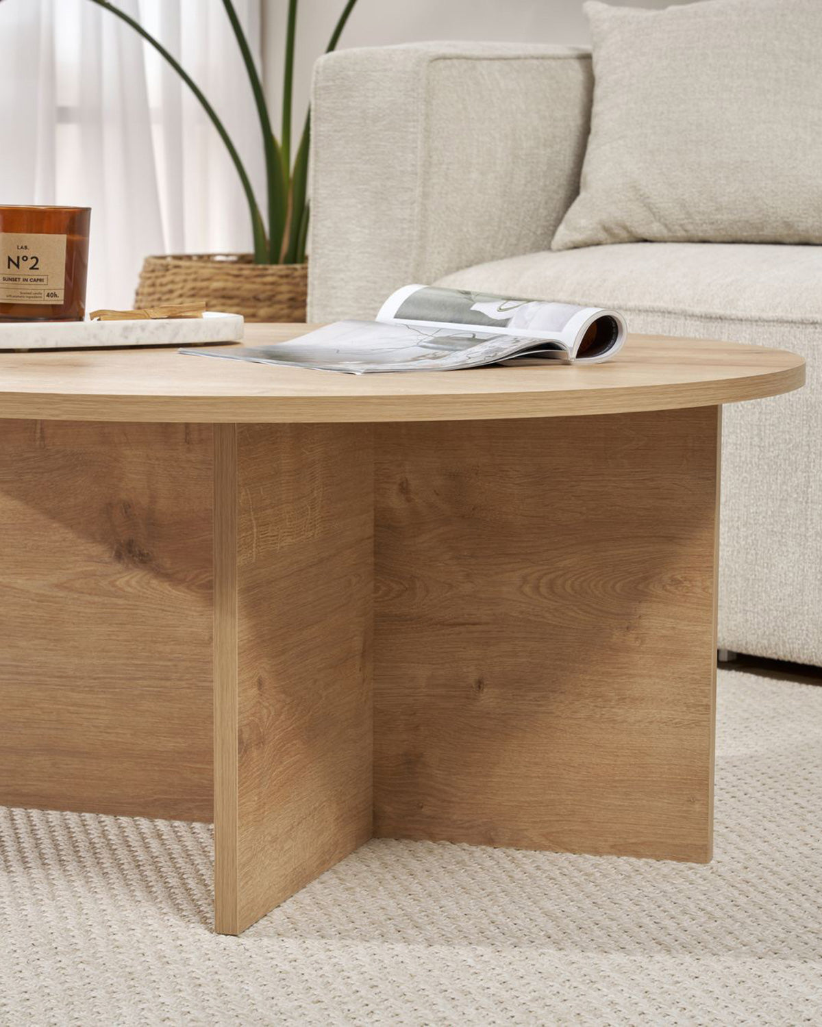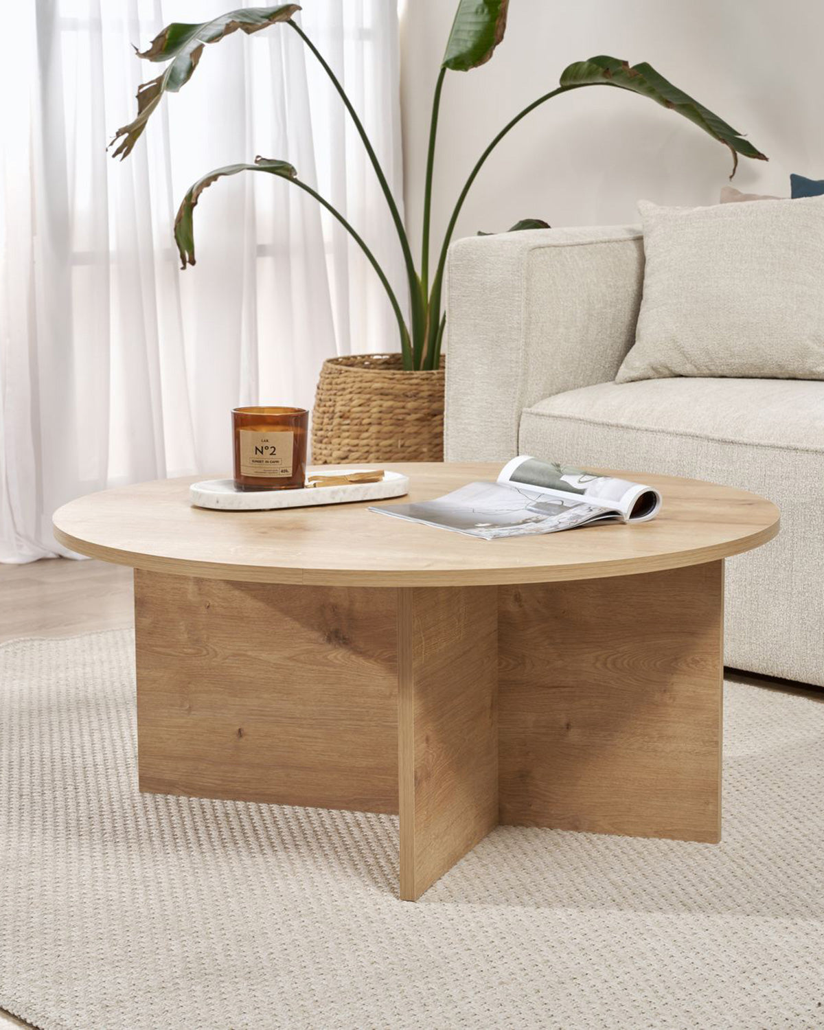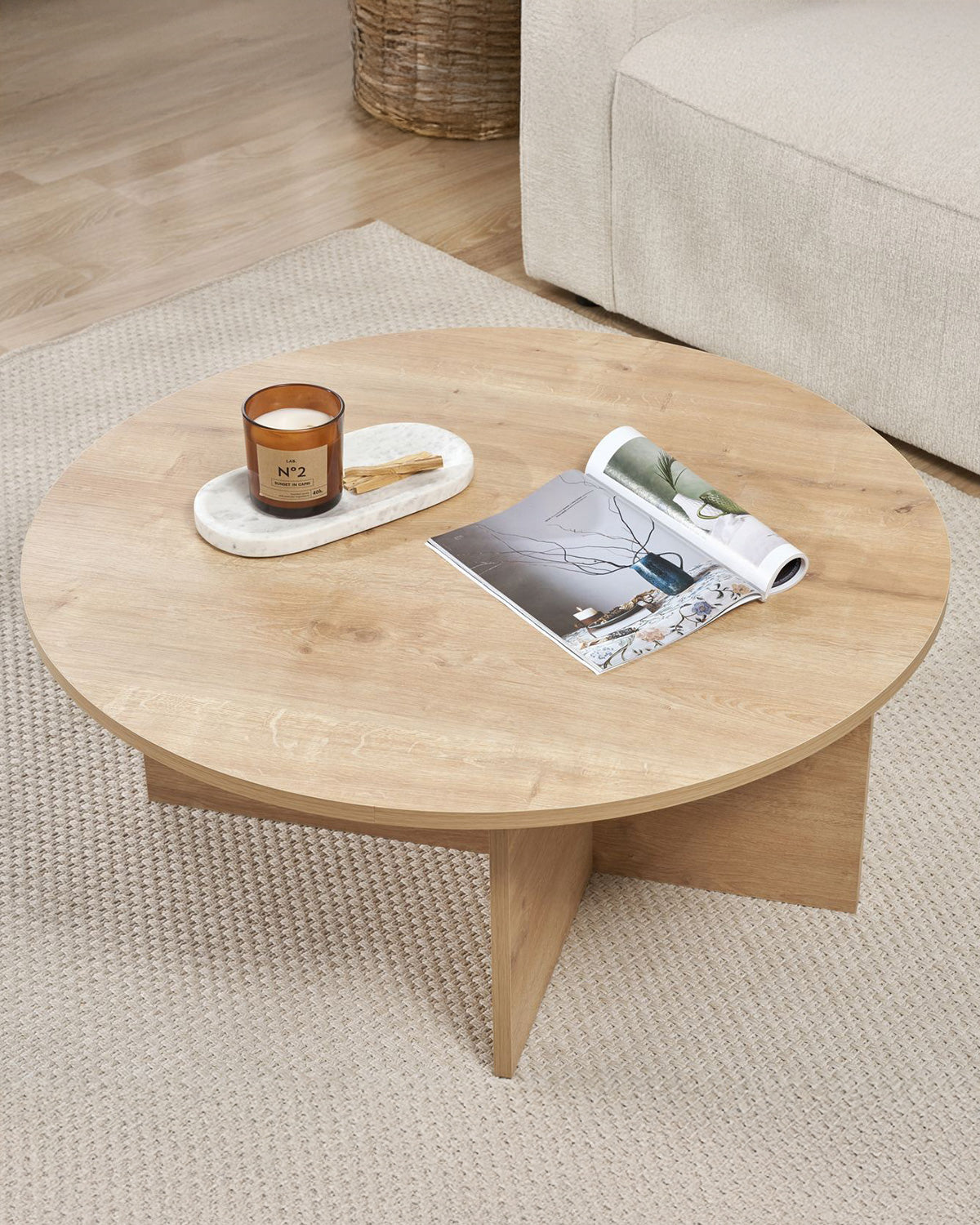 - La mesa de centro Rosalyn combina un diseño redondo de líneas suaves con un acabado en madera natural, ideal para aportar calidez al salón. Su estructura robusta de tablero melaminizado garantiza estabilidad, mientras su superficie amplia de 90 cm permite colocar bandejas, libros o elementos decorativos sin sobrecargar el espacio. Gracias a su formato circular y sus bordes redondeados, resulta perfecta para crear un ambiente fluido y seguro, especialmente en zonas de paso. Su estética natural encaja fácilmente en salones de estilo nórdico, contemporáneo o mediterráneo. Una pieza versátil que destaca por su sencillez equilibrada y su fácil mantenimiento diario.