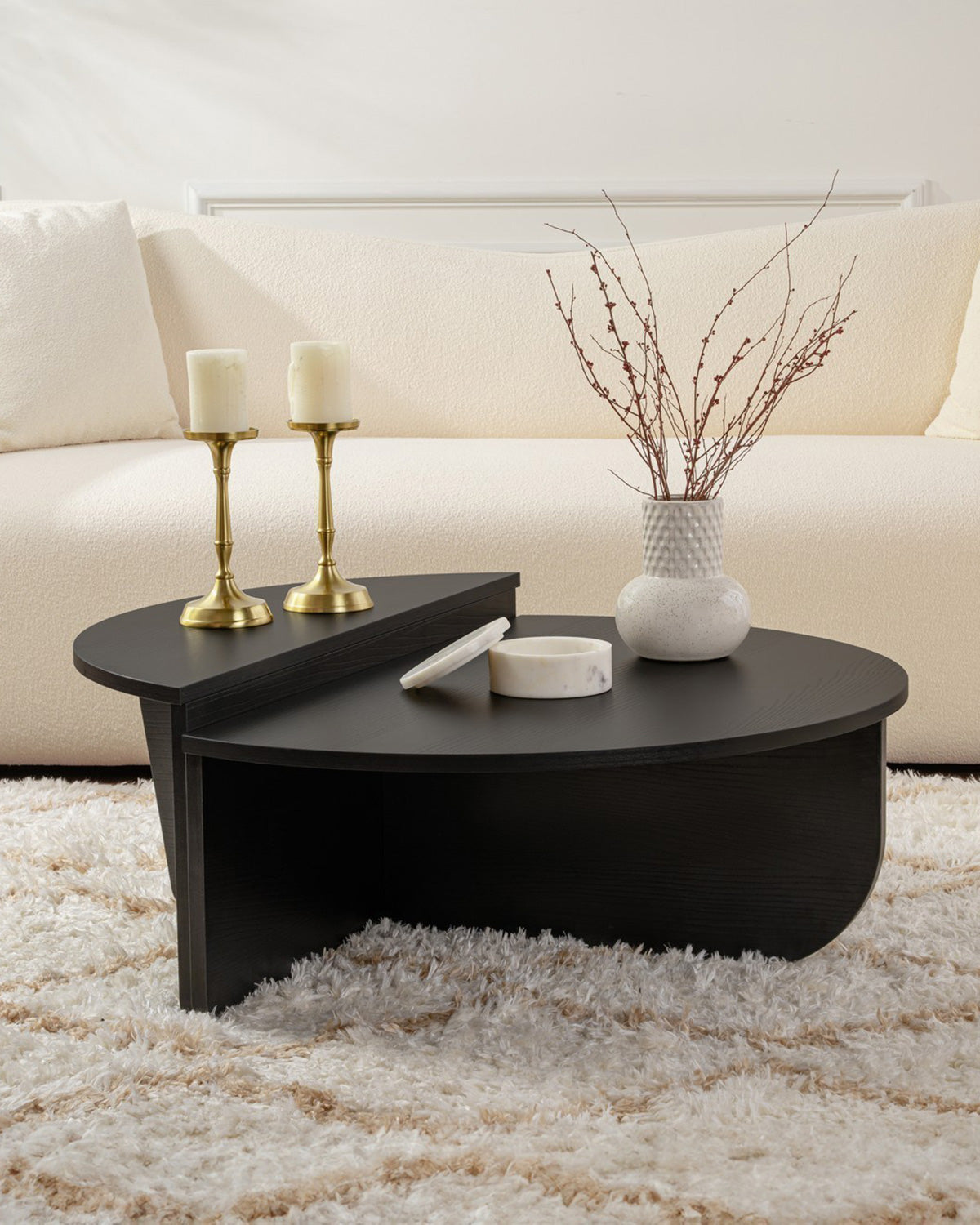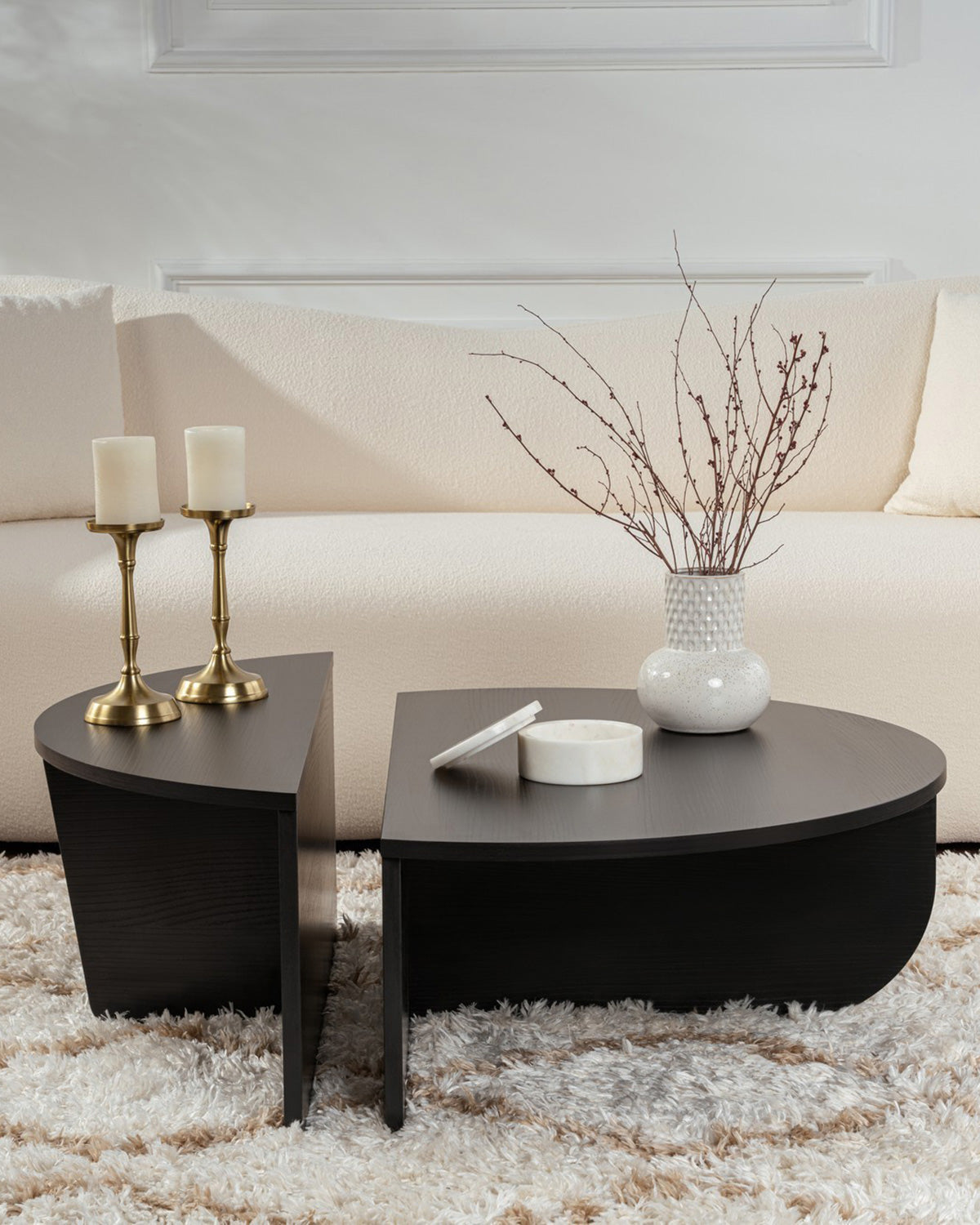 - El conjunto de mesas Flossie en color negro combina sobriedad y estilo contemporáneo. Su diseño de dos alturas y formas redondeadas permite adaptarlas fácilmente al espacio disponible, usándolas juntas o por separado según la ocasión. Fabricadas en tablero melaminizado, destacan por su resistencia y mantenimiento sencillo. La silueta curva de sus sobres aporta equilibrio y una presencia elegante que encaja en salones modernos o minimalistas. Un conjunto funcional y decorativo que aporta personalidad al espacio sin recargarlo.