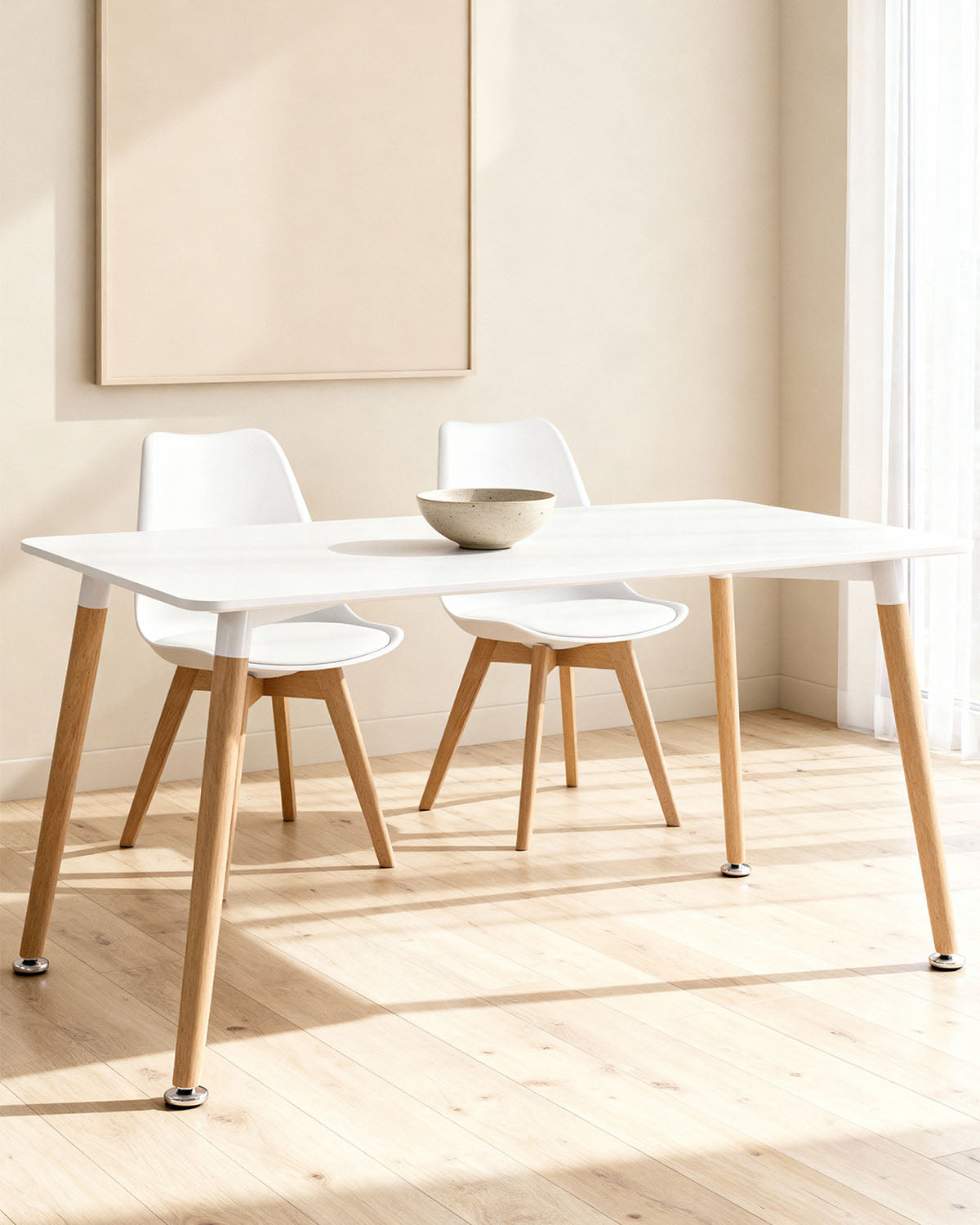 - Mesa de Comedor Rectangular en Madera de Haya y MDF Nola destaca por su equilibrio entre diseño funcional y estética actual, ideal para crear un ambiente acogedor en el comedor o la cocina. El acabado en blanco y madera natural aporta luminosidad y versatilidad a cualquier espacio. Su diseño atemporal facilita su integración en distintos conjuntos de comedor. Diseñada para el uso diario, mantiene una presencia ligera y equilibrada. El sobre en mdf ofrece resistencia y un tacto agradable, las patas en madera de haya refuerzan la estabilidad y aportan un estilo natural y su capacidad para 6 comensales la convierte en una opción práctica para reuniones cotidianas o comidas especiales. Una mesa versátil que encaja en ambientes modernos, nórdicos o contemporáneos, pensada para combinar funcionalidad y estilo en el día a día.