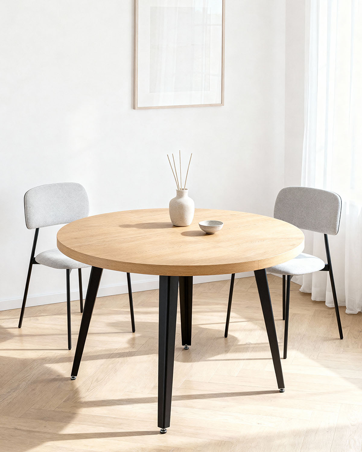 - La mesa Dionne es una solución práctica para comedores que buscan flexibilidad sin renunciar al diseño. Su formato redondo de 120 cm se amplía hasta 160 cm, permitiendo adaptarse cómodamente a diferentes situaciones, desde el uso diario hasta reuniones puntuales con más comensales. El sistema de extensión mediante suplemento interior resulta funcional y fácil de utilizar. Los suplementos se almacenan en el interior de la mesa mediante travesaños de apoyo, manteniéndolos siempre a mano y sin ocupar espacio adicional. Esta característica facilita una ampliación rápida y ordenada cuando se necesita. Fabricada con sobre de MDF y un grosor de 25 mm, ofrece una superficie estable y resistente. Las patas metálicas aportan solidez al conjunto y refuerzan su durabilidad. Diseñada para uso interior, permite acomodar hasta seis comensales con comodidad y equilibrio.