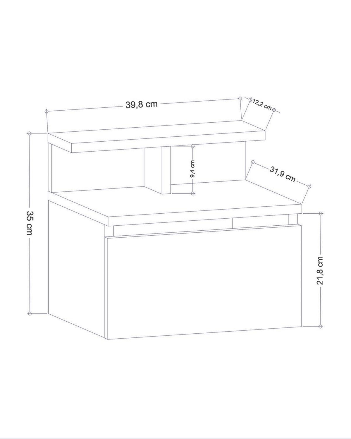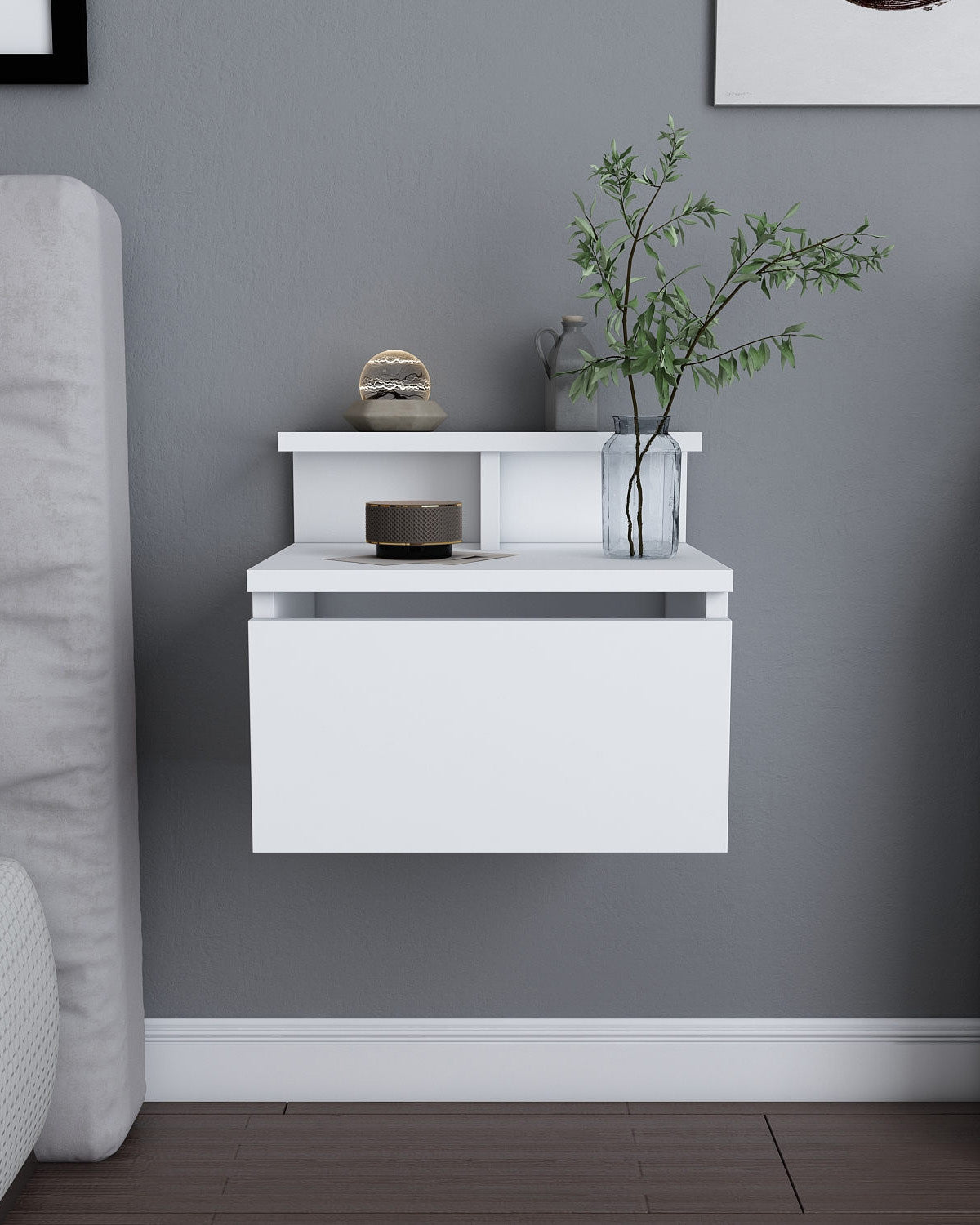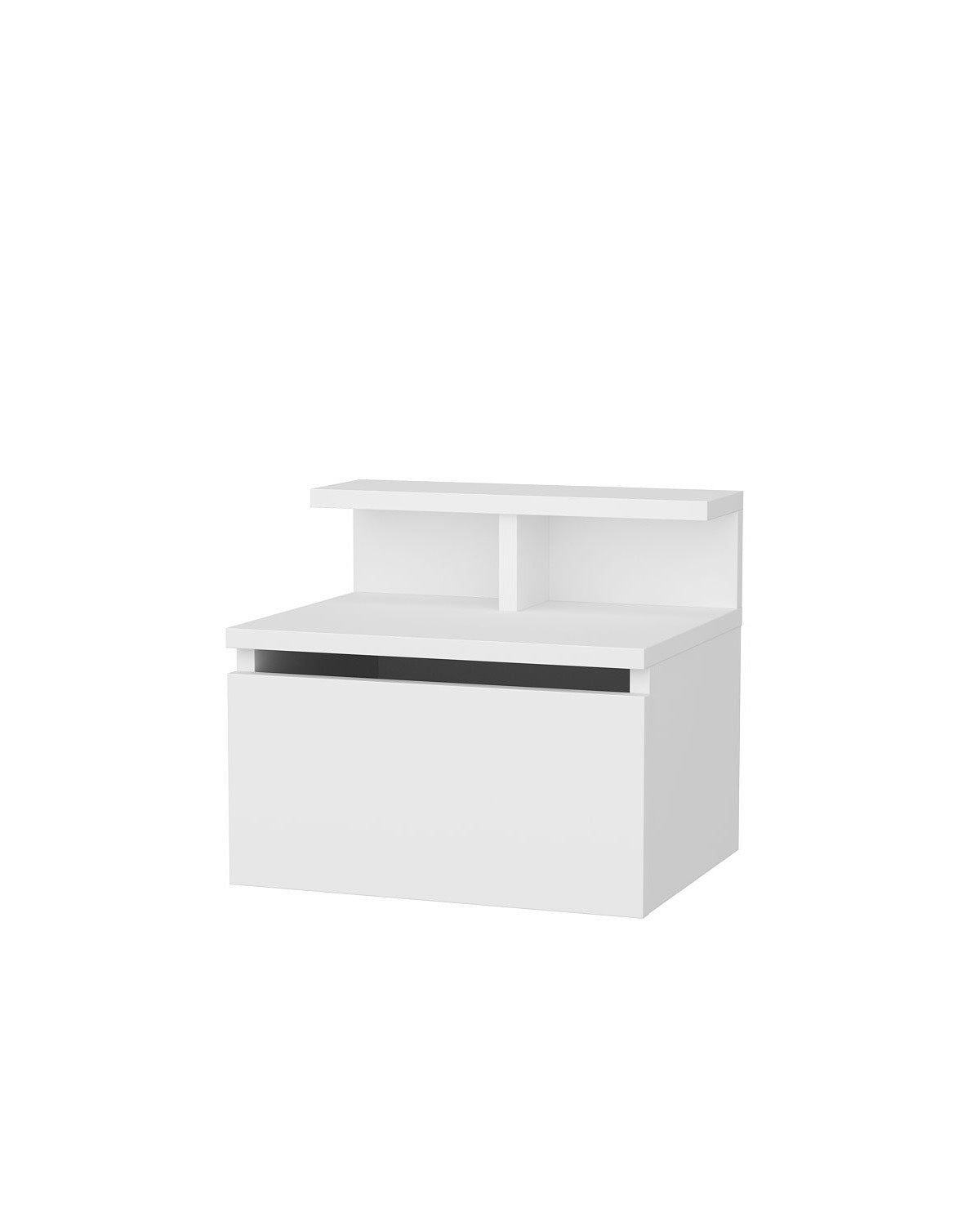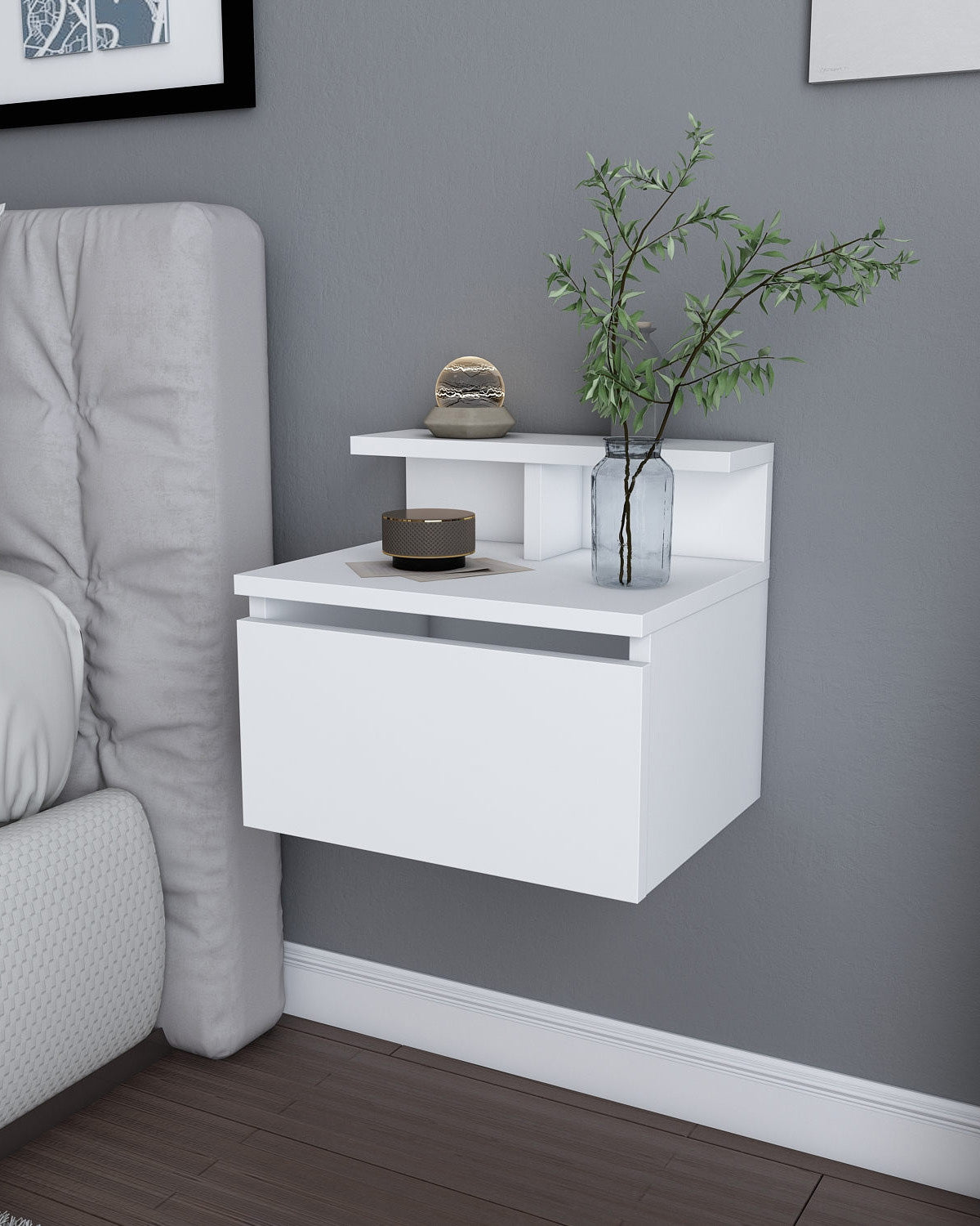 - Con su acabado en blanco, la mesita de noche colgante Lourdes aporta frescura y luminosidad al dormitorio. Su diseño minimalista y líneas rectas encajan con facilidad en ambientes nórdicos o contemporáneos. Incluye un cajón que permite mantener los objetos personales organizados y al alcance de la mano. Su estructura colgante ofrece una apariencia ligera y moderna, a la vez que facilita la limpieza del espacio. Fabricada en tablero melaminizado de alta calidad, combina durabilidad y estética, siendo una pieza práctica y elegante para completar cualquier dormitorio.