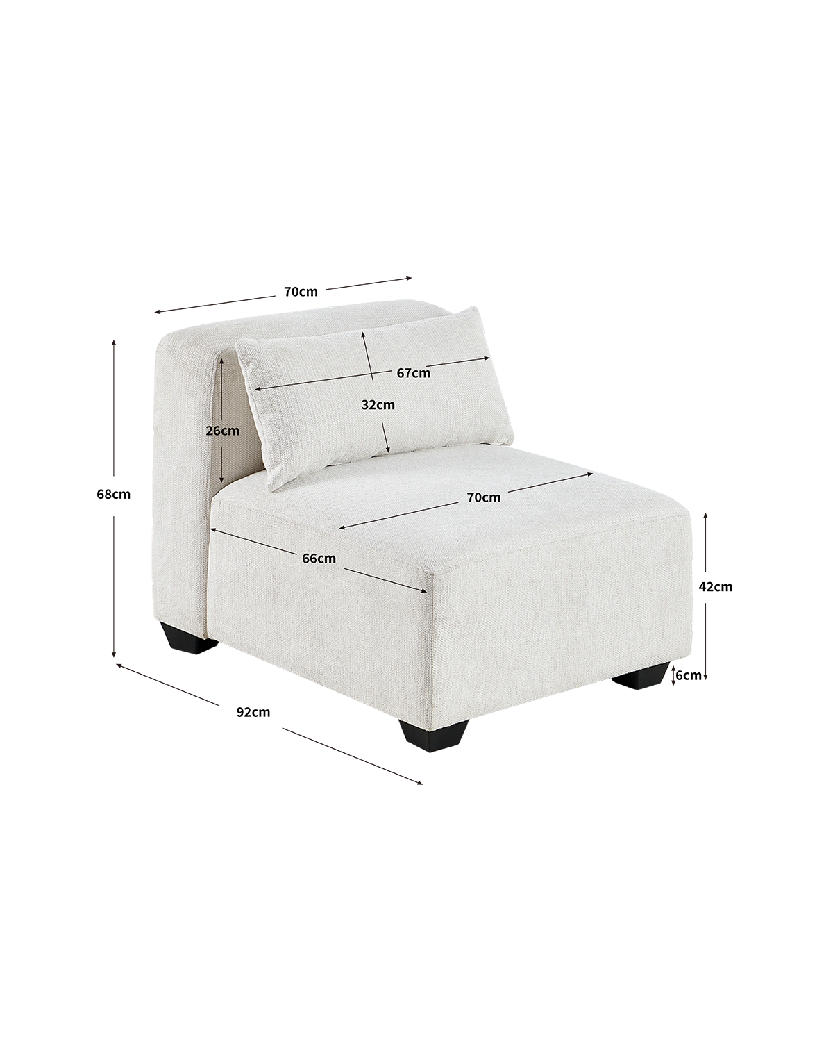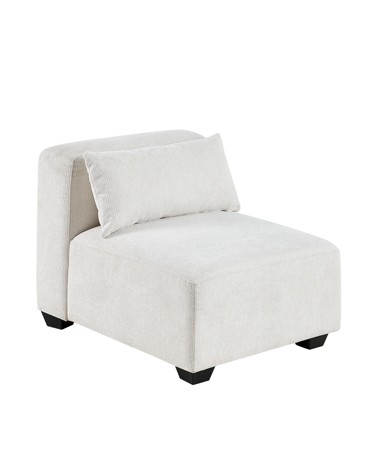 - Módulo de sofá Liza medio Beige combina confort y diseño atemporal, pensado para integrarse en diferentes estilos de salón. El acabado en beige aporta calidez y versatilidad, mientras que su formato de 1 plazas lo convierte en el centro de reuniones familiares o de momentos de descanso. Su carácter práctico lo convierte en una pieza imprescindible para el hogar. Tapizado en poliéster, ofrece una superficie agradable al tacto y fácil de mantener, la estructura en tela y madera refuerza la resistencia y la durabilidad, los asientos mullidos proporcionan la comodidad necesaria para el día a día y las patas de plástico aseguran estabilidad y un estilo natural. Una propuesta versátil que encaja en ambientes modernos, clásicos o nórdicos, aportando equilibrio estético y funcionalidad a cualquier espacio.