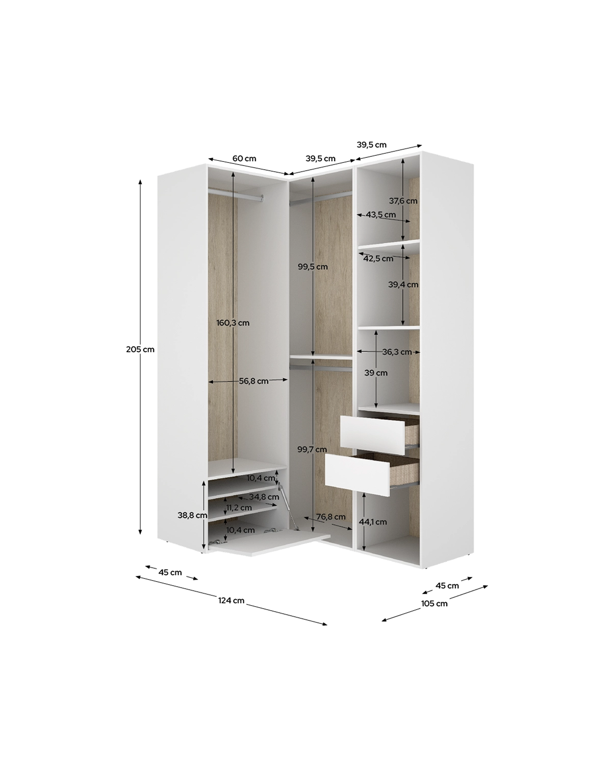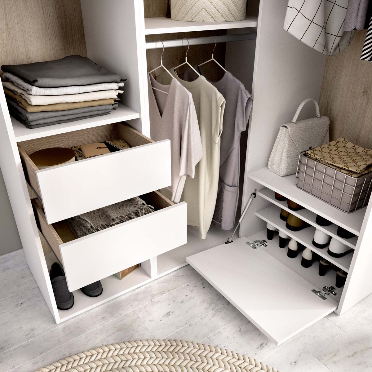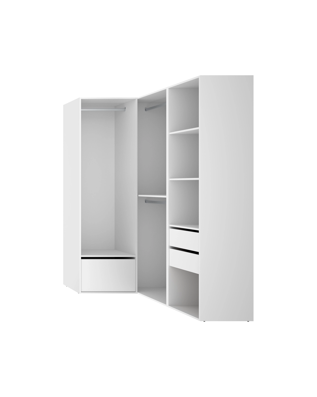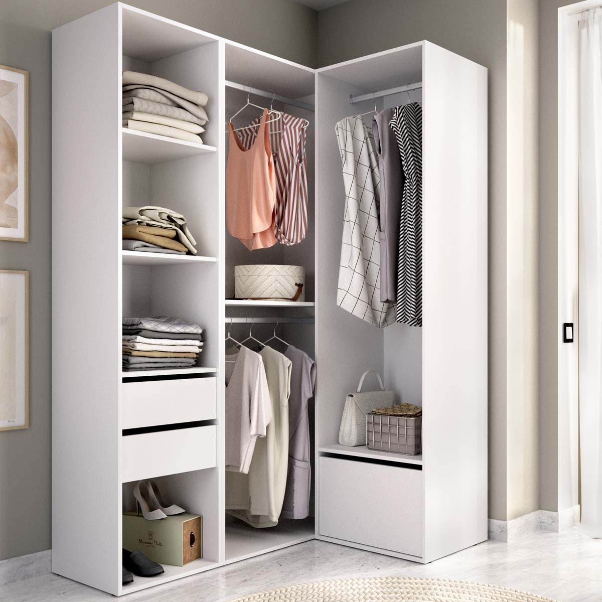 - El módulo vestidor rinconero Suit es una pieza diseñada para aprovechar las esquinas del dormitorio con un equilibrio perfecto entre funcionalidad y estética. Su formato angular permite una integración natural con otros módulos, optimizando el espacio sin recargar el ambiente. La trasera reversible, en blanco o madera natural, ofrece flexibilidad decorativa, adaptándose con facilidad a estilos modernos, nórdicos o más cálidos. Dispone de siete huecos abiertos, dos cajones con acabado textil y guías metálicas, un zapatero abatible y tres barras metálicas para colgar prendas, ofreciendo una capacidad amplia y bien organizada. Fabricado en tablero melaminizado de 16 mm, con tacos ABS quitarruidos y antirrayaduras, combina durabilidad, resistencia y un mantenimiento sencillo. Su diseño abierto favorece la visibilidad y el acceso, manteniendo el orden con naturalidad. Como parte del sistema modular Suit, este modelo puede combinarse con otros módulos para formar vestidores personalizados y adaptables a diferentes dimensiones. Su estructura rinconera convierte las esquinas desaprovechadas en espacios funcionales y elegantes, aportando un toque de diseño equilibrado al conjunto.