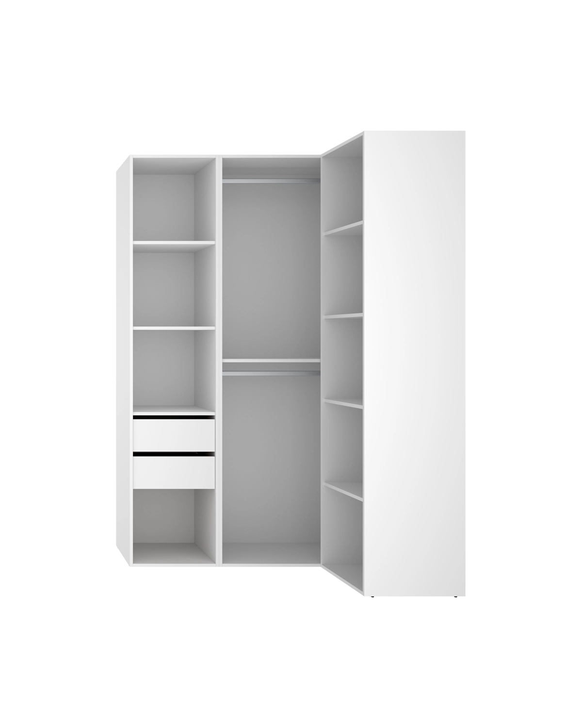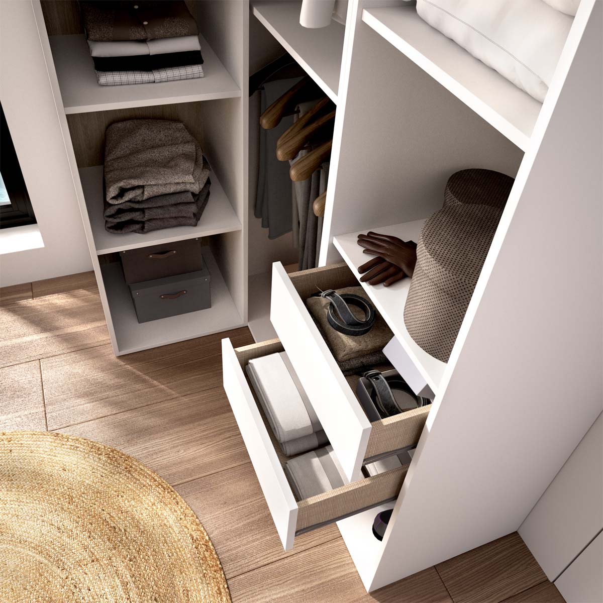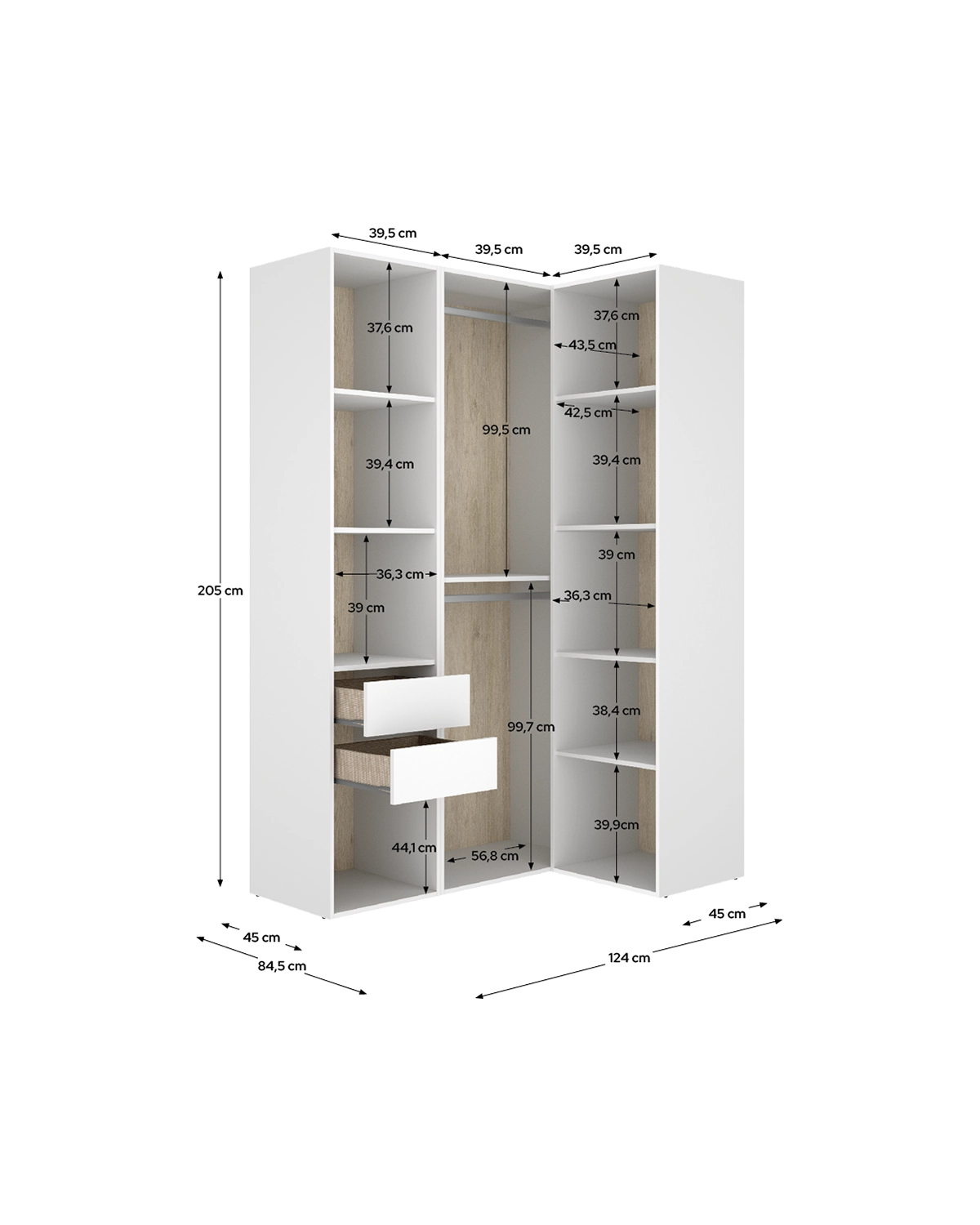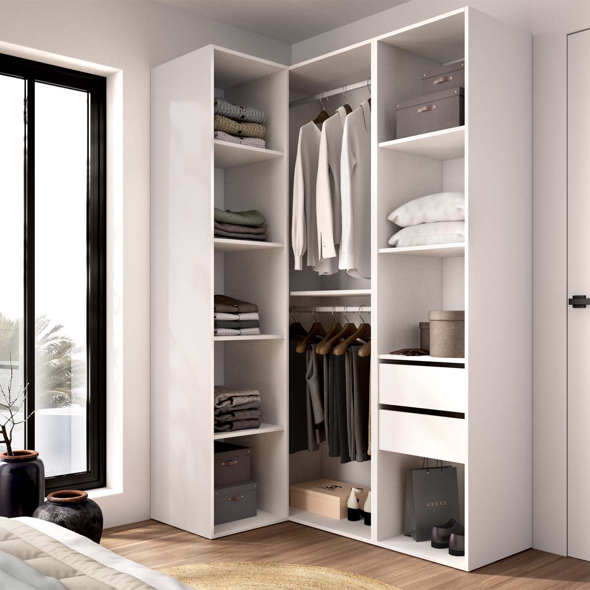 - El módulo vestidor rinconero Suit destaca por su capacidad y su diseño pensado para aprovechar al máximo los rincones del dormitorio. Su estructura abierta aporta amplitud visual, mientras que la trasera reversible, en blanco o madera natural, permite adaptar el acabado al entorno decorativo, ofreciendo flexibilidad estética y coherencia visual con el resto del mobiliario. Este modelo incluye once huecos de almacenaje, dos cajones con acabado textil y guías metálicas de suave deslizamiento, y dos barras metálicas para colgar prendas. Fabricado en tablero melaminizado de 16 mm y reforzado con tacos ABS antirrayaduras y quitarruidos, ofrece estabilidad, durabilidad y un mantenimiento muy sencillo. Su diseño angular y funcional aprovecha cada espacio disponible con una distribución lógica y accesible. Perteneciente al sistema modular Suit, este módulo puede combinarse con otros para formar vestidores a medida, tanto en espacios amplios como en composiciones más compactas. Su estética equilibrada, materiales resistentes y diseño adaptable lo convierten en una pieza esencial para quienes buscan un vestidor rinconero funcional, elegante y personalizado.