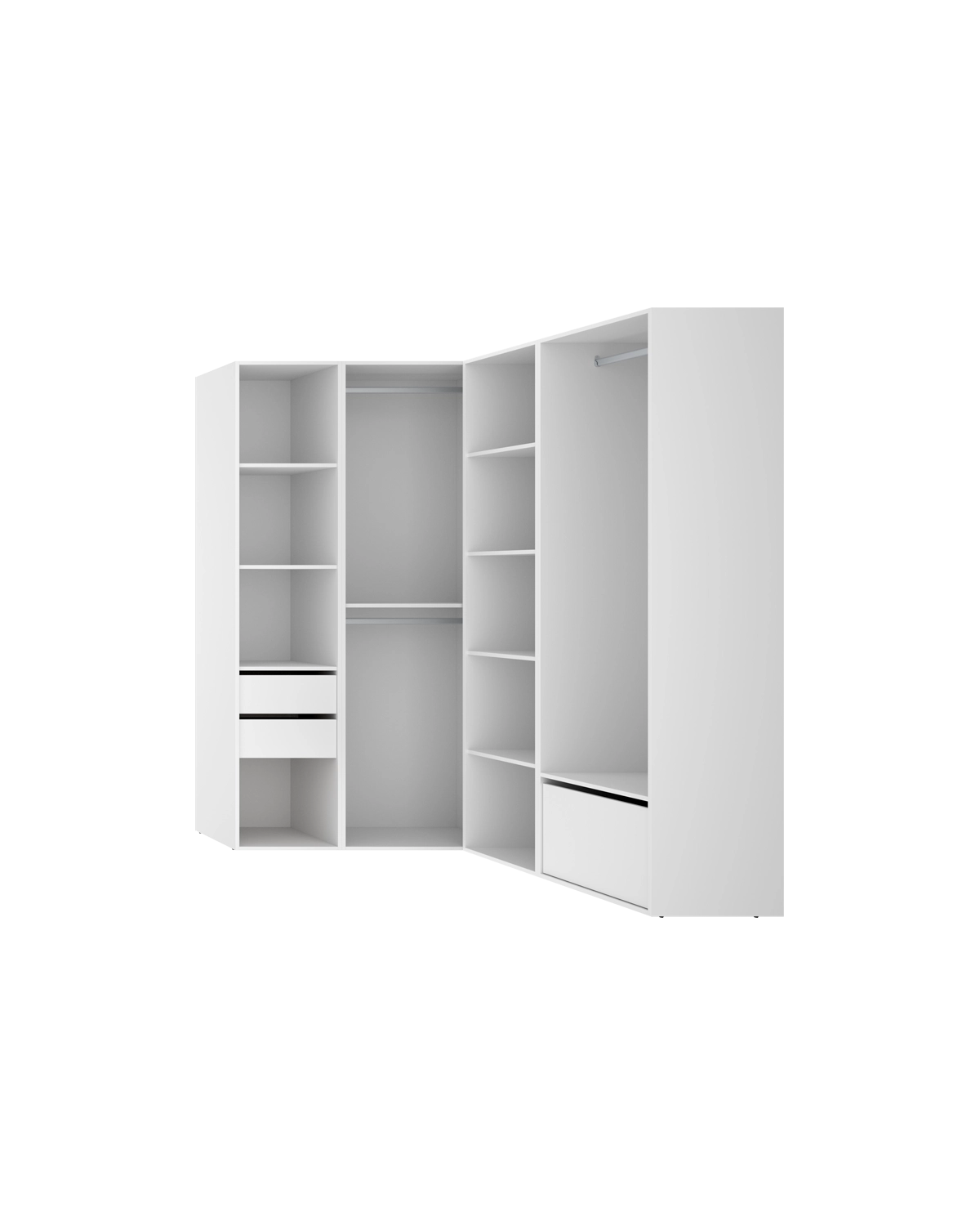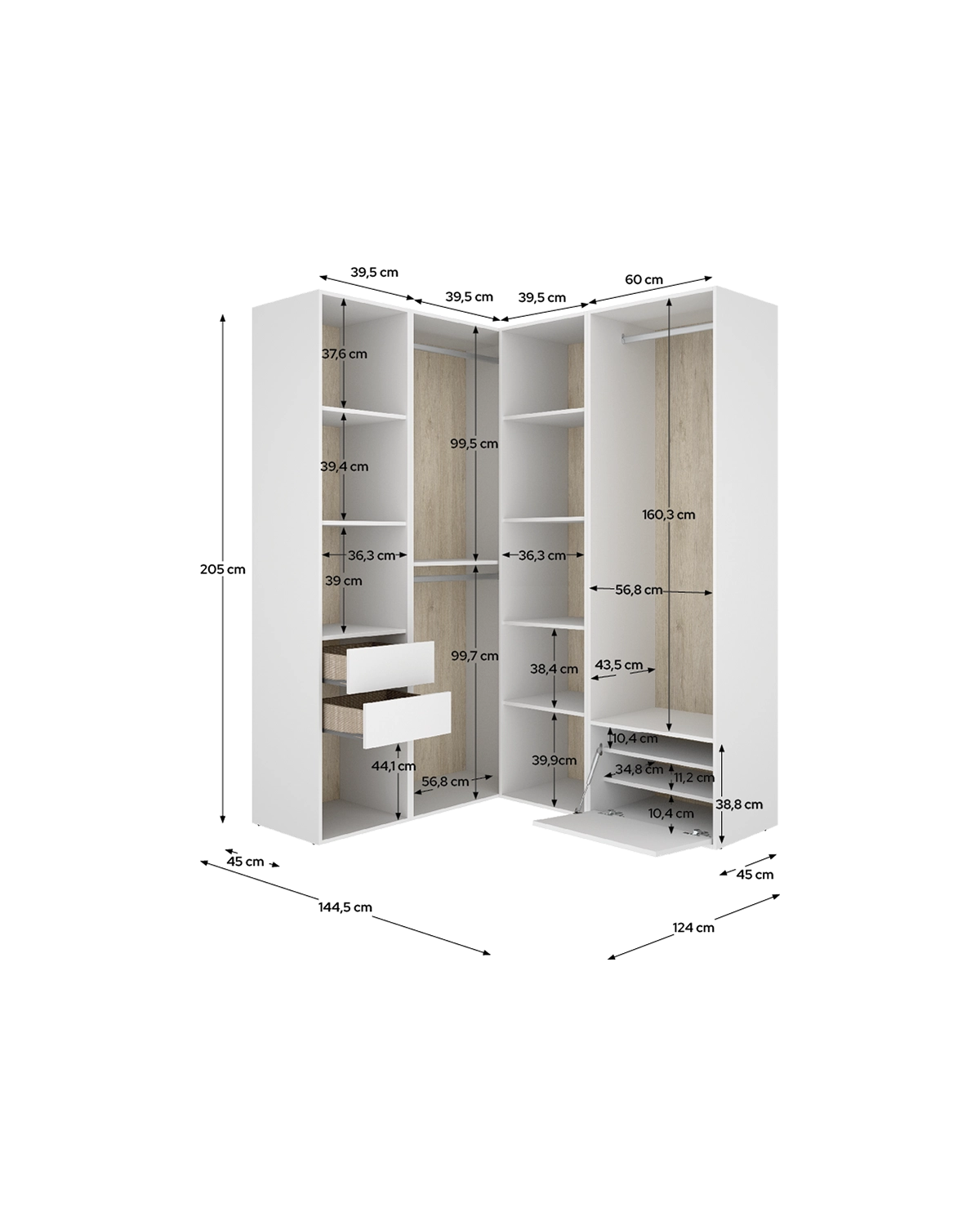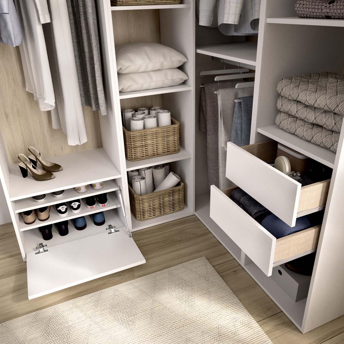 - El módulo vestidor rinconero Suit ofrece un diseño amplio y bien estructurado que convierte los rincones del dormitorio en espacios útiles y organizados. Su trasera reversible, en blanco o madera natural, permite personalizar el acabado según el estilo decorativo del hogar, aportando luminosidad o un toque cálido y natural. Incluye doce huecos, dos cajones con acabado textil y guías metálicas, un zapatero abatible y tres barras de colgar, ofreciendo una organización completa para todo tipo de prendas y accesorios. Los tacos ABS antirrayaduras y quitarruidos garantizan estabilidad y protegen las superficies, mientras que la estructura en tablero melaminizado de 16 mm y los herrajes metálicos proporcionan solidez y larga vida útil. Integrado en el sistema modular Suit, este módulo puede combinarse con otros para crear vestidores personalizados, adaptados a las dimensiones del espacio. Su formato rinconero optimiza el aprovechamiento de los ángulos y aporta una sensación de orden y amplitud, uniendo estética, funcionalidad y confort.