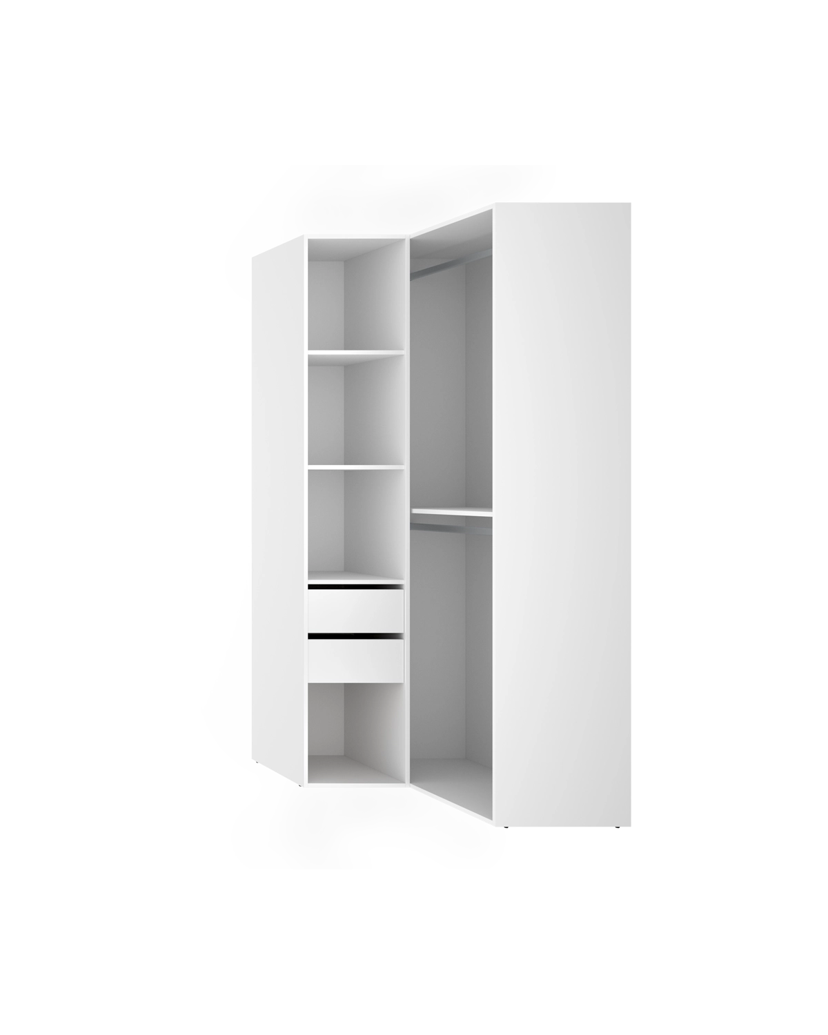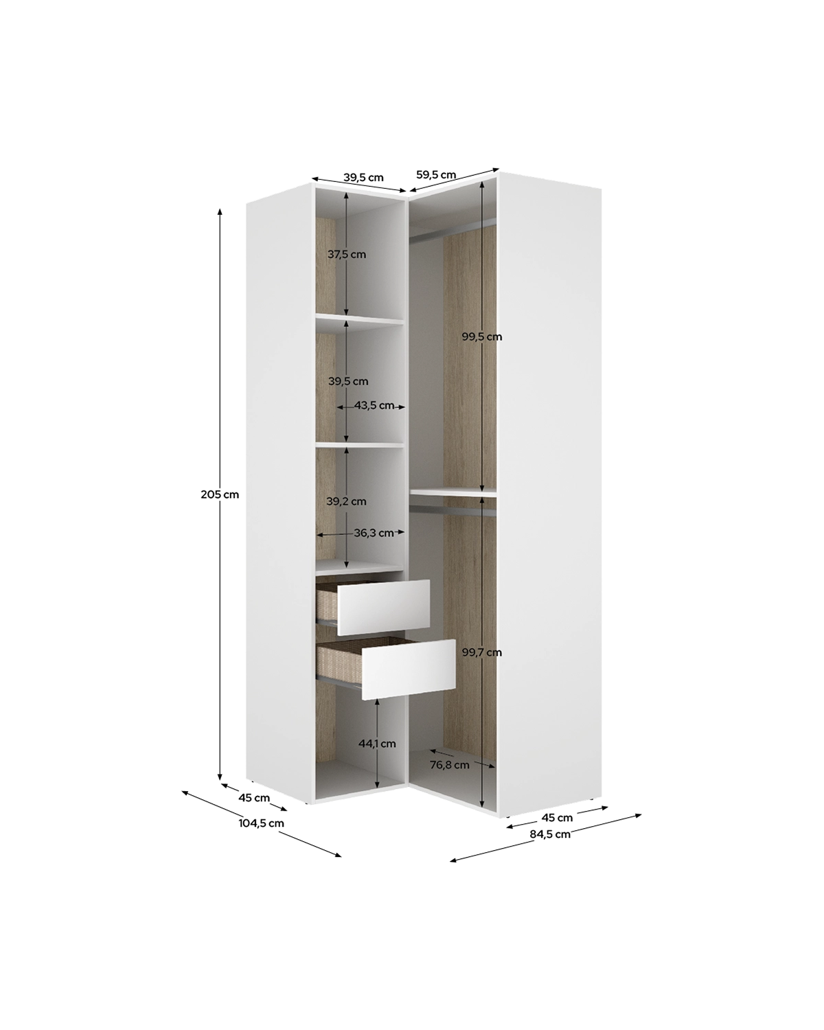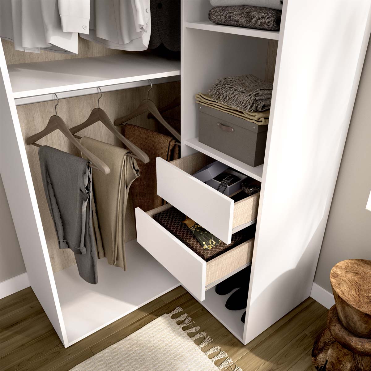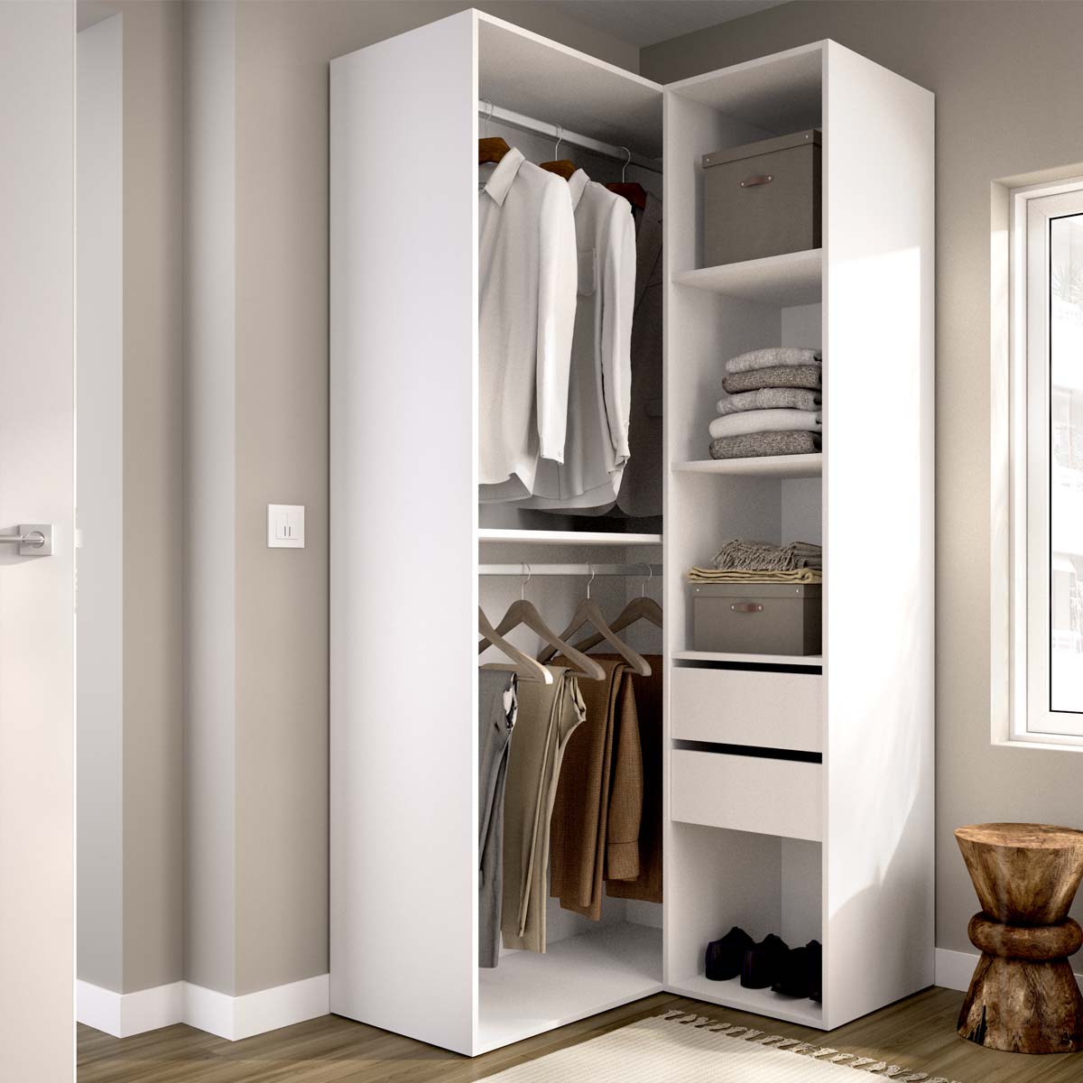 - El módulo vestidor rinconero Suit está diseñado para optimizar cada rincón del dormitorio o vestidor, convirtiendo el espacio en una zona funcional y elegante. Su formato angular aprovecha al máximo las esquinas, aportando continuidad visual y favoreciendo la sensación de amplitud. La trasera reversible, con acabados en blanco y madera natural, permite personalizar la estética del mueble para integrarlo en diferentes estilos decorativos, desde los más contemporáneos hasta los más cálidos. Este modelo ofrece una distribución muy completa con seis huecos de almacenaje, dos cajones con acabado textil y guías metálicas de suave deslizamiento, y dos barras metálicas para colgar prendas. Los tacos ABS quitarruidos y antirrayaduras protegen las superficies y refuerzan la estabilidad, mientras que la estructura en tablero melaminizado de 16 mm garantiza durabilidad y resistencia. Su diseño abierto facilita el acceso a cada prenda, combinando orden y comodidad. Como parte del sistema modular Suit, este módulo puede combinarse con otros de la colección para crear vestidores personalizados, adaptados a distintos espacios y necesidades. Su diseño rinconero convierte los ángulos desaprovechados en un punto clave de almacenaje, uniendo funcionalidad, equilibrio estético y practicidad.