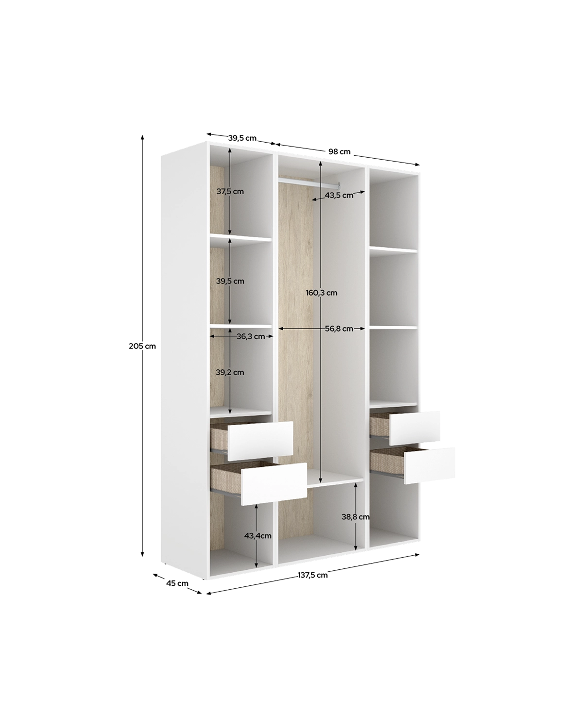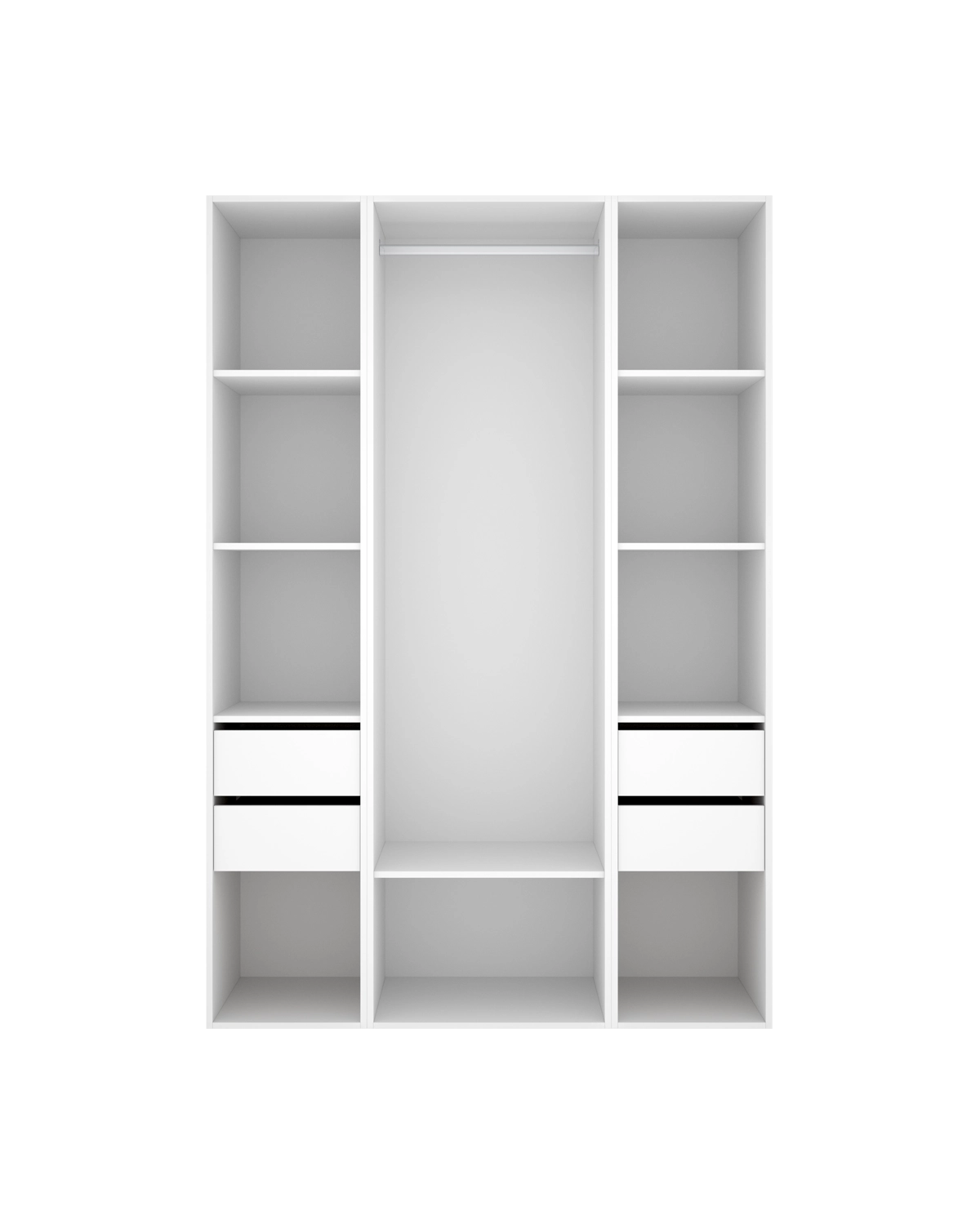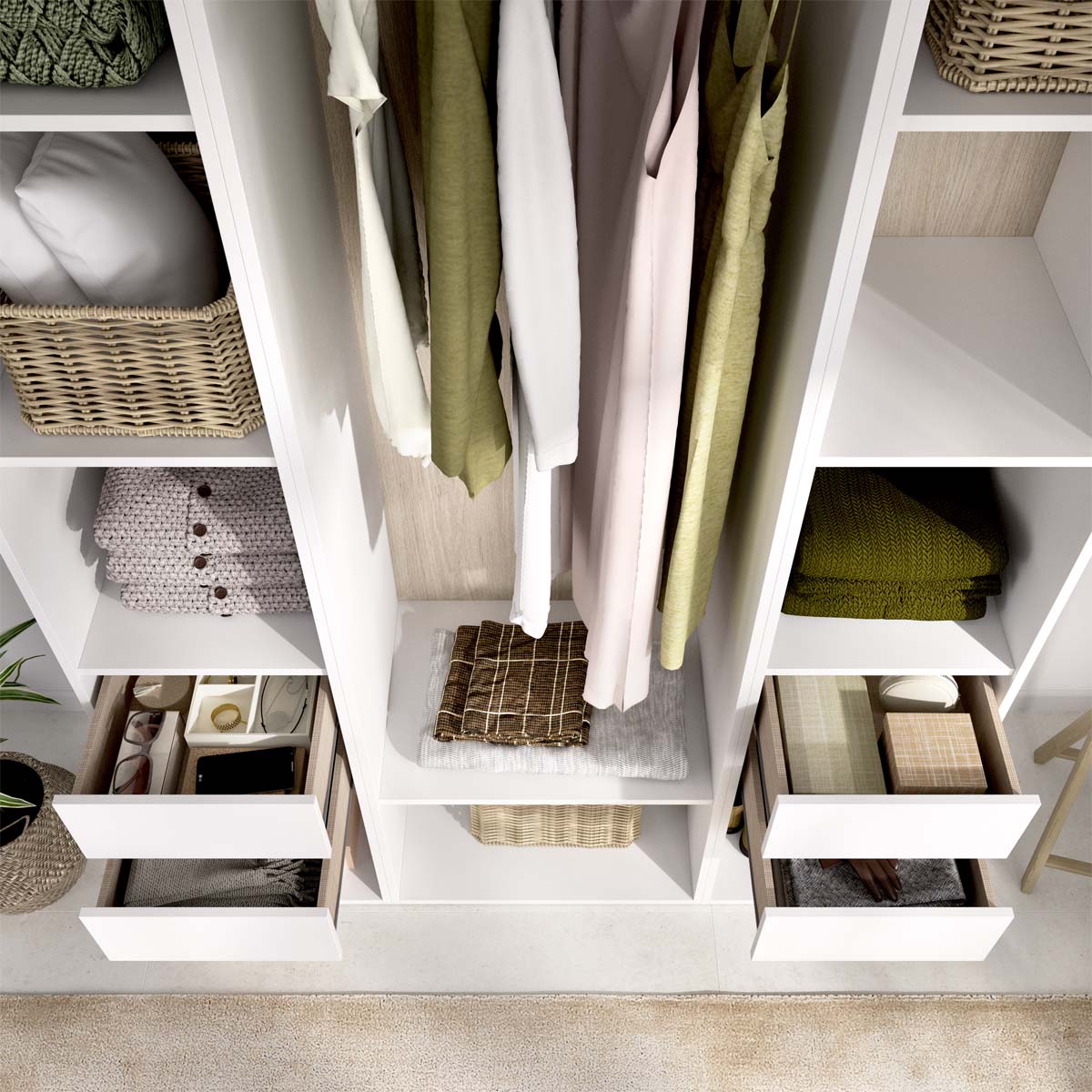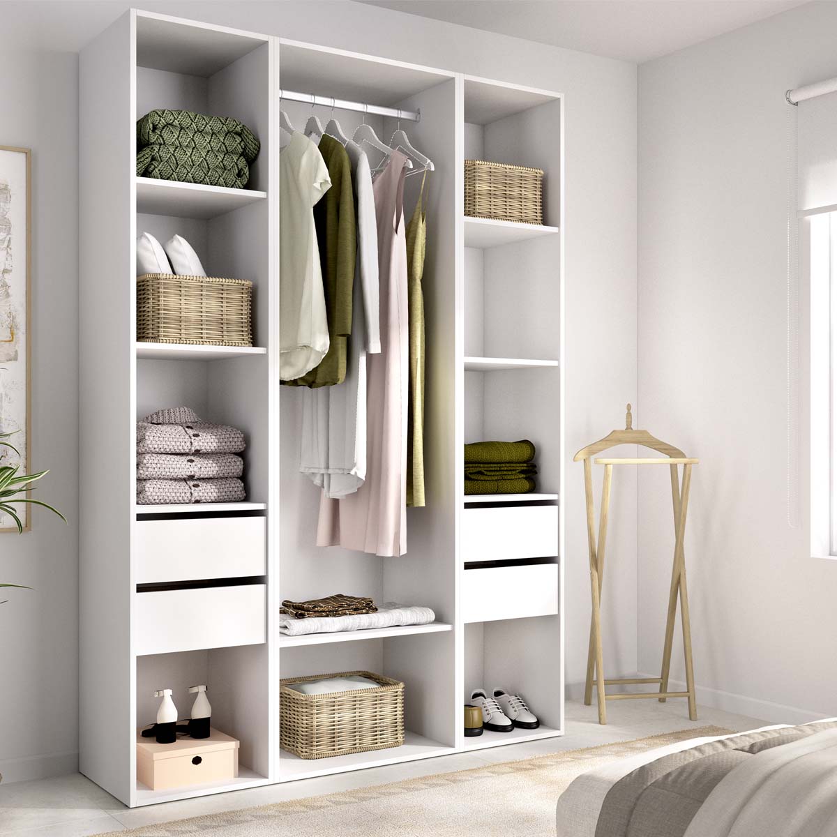 - El módulo vestidor Suit de 137,5 cm está diseñado para quienes buscan mayor capacidad de almacenaje sin renunciar al diseño. Su trasera reversible, en blanco o madera natural, permite personalizar el acabado y crear combinaciones decorativas equilibradas. El conjunto, de líneas rectas y proporciones cuidadas, aporta sensación de orden y elegancia al espacio. Este modelo ofrece diez huecos, cuatro cajones con acabado textil y guías metálicas de suave deslizamiento, y una barra de aluminio, proporcionando una solución completa para organizar ropa, calzado y accesorios. Los tacos ABS protectores mantienen la estabilidad y cuidan el suelo, mientras que los materiales —tablero melaminizado y herrajes metálicos— aseguran una larga vida útil y un mantenimiento sencillo. Al integrarse en el sistema modular Suit, este módulo puede combinarse con otras piezas para crear vestidores adaptados a cualquier espacio o necesidad. Su diseño funcional, equilibrado y atemporal lo convierte en una pieza esencial para quienes valoran la armonía entre organización, estética y comodidad.