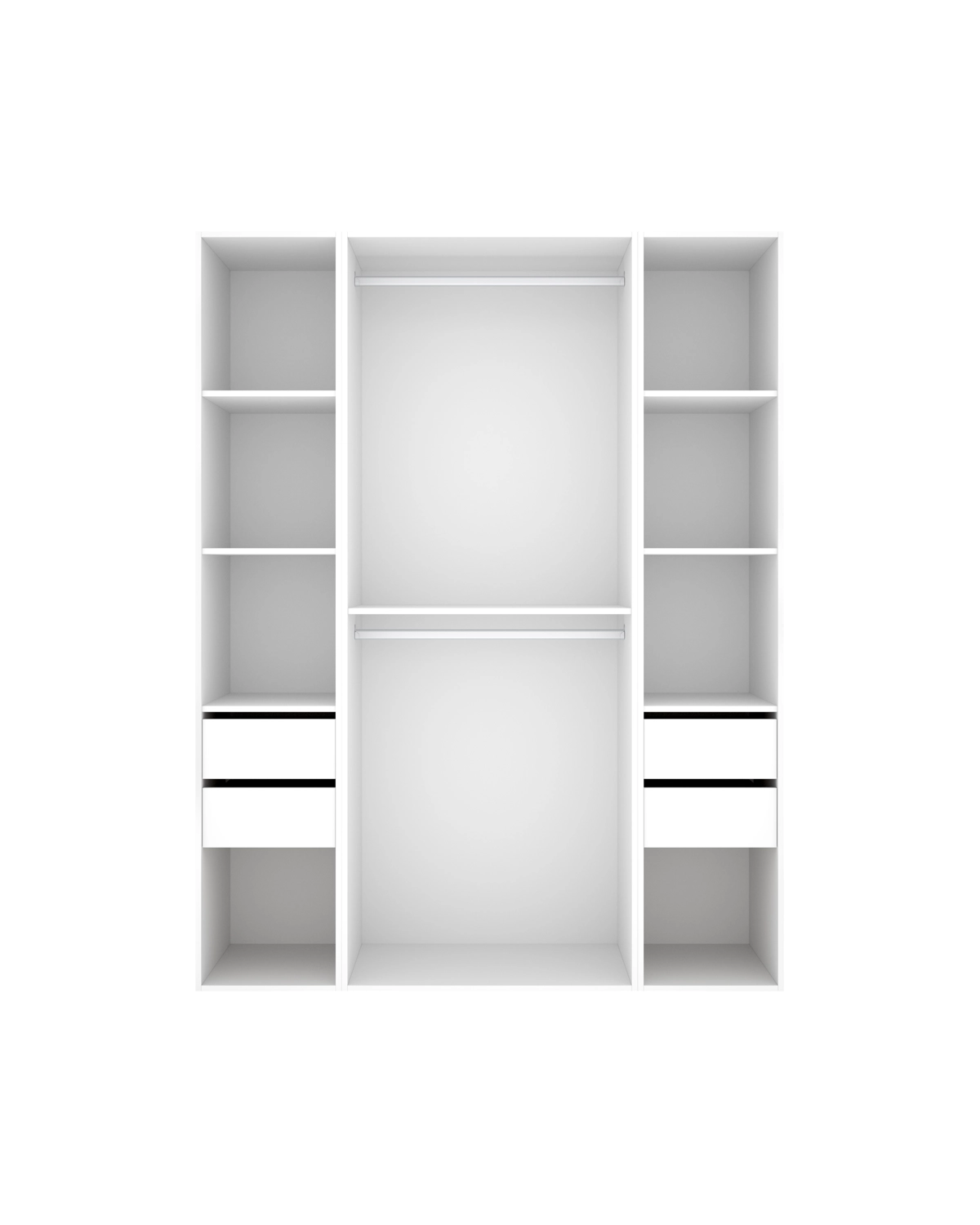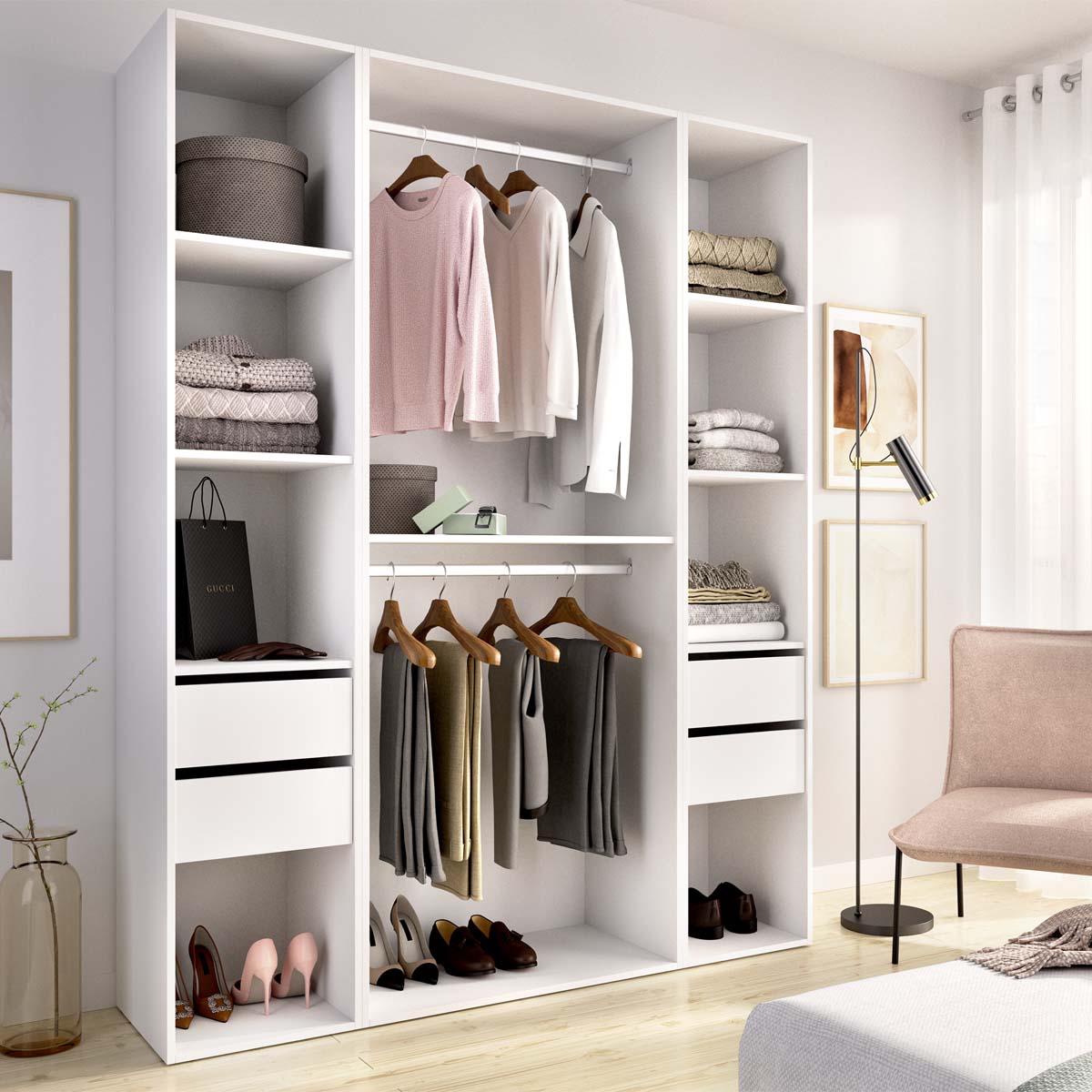- El módulo vestidor Suit de 159 cm ofrece una solución completa para mantener la ropa y los complementos perfectamente organizados. Su diseño modular permite combinarlo con otros elementos de la colección, creando vestidores a medida adaptados a cualquier espacio. La trasera reversible, con acabados en blanco o madera natural, ofrece flexibilidad decorativa y permite jugar con contrastes o mantener una estética uniforme. Este modelo incluye diez huecos abiertos, cuatro cajones con acabado textil y guías metálicas de suave deslizamiento, y dos barras metálicas de colgar, ofreciendo una distribución equilibrada para prendas largas, dobladas o accesorios. Los tacos ABS quitarruidos y antirrayaduras refuerzan la estabilidad del conjunto y protegen el suelo, mientras que el tablero melaminizado y los herrajes metálicos aseguran resistencia y un mantenimiento sencillo. Como parte del sistema modular Suit, puede combinarse con otros modelos de diferentes anchos o configuraciones para crear vestidores adaptados a cada necesidad. Su diseño, robusto y equilibrado, une estética y funcionalidad en un conjunto versátil y elegante.