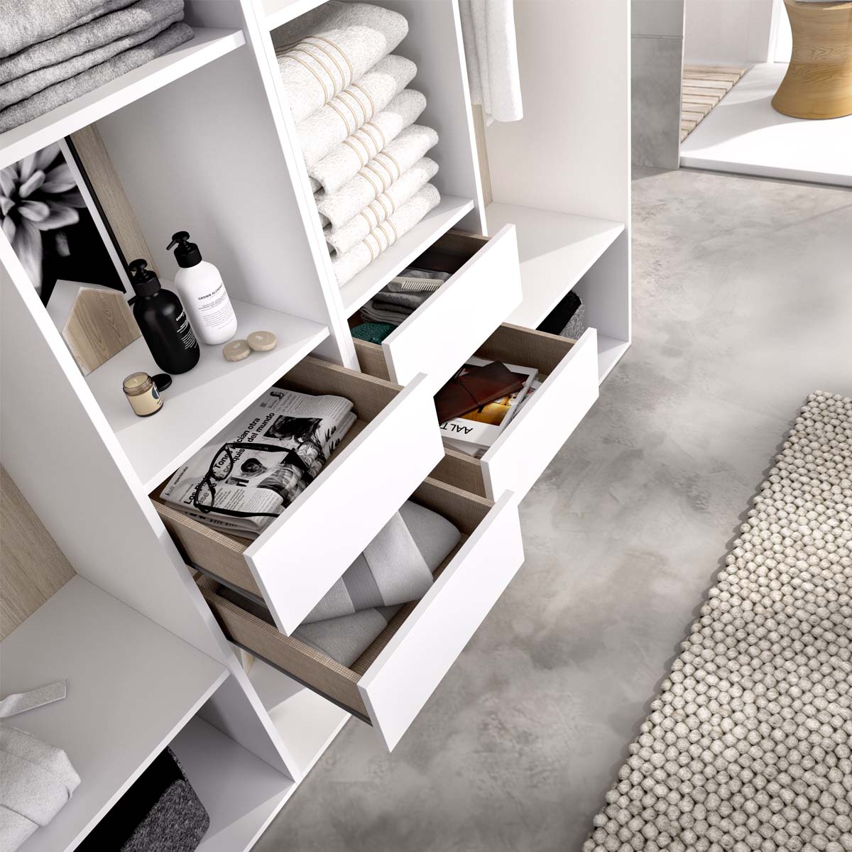 - El módulo vestidor Suit de gran capacidad ofrece una solución completa para quienes buscan un vestidor ordenado, funcional y con presencia decorativa. Su trasera reversible en blanco o madera natural permite adaptar su estética a distintos estilos de interiorismo, aportando versatilidad y equilibrio visual. Su formato amplio y abierto transmite sensación de ligereza y aprovecha al máximo el espacio disponible. En su interior alberga doce huecos, cuatro cajones con acabado textil y guías metálicas de suave deslizamiento, además de dos barras metálicas para colgar ropa. Los tacos ABS antirrayaduras aportan estabilidad y protegen las superficies de apoyo, mientras que la estructura de tablero melaminizado de 16 mm garantiza resistencia y fácil limpieza. Cada detalle está diseñado para ofrecer comodidad, durabilidad y una experiencia de uso práctica. Este módulo se integra en el sistema modular Suit, lo que permite combinarlo con otros modelos para diseñar vestidores personalizados y ampliables. Su diseño equilibrado entre funcionalidad y estética lo convierte en una pieza versátil y elegante, ideal para crear espacios de almacenaje con armonía, orden y estilo.