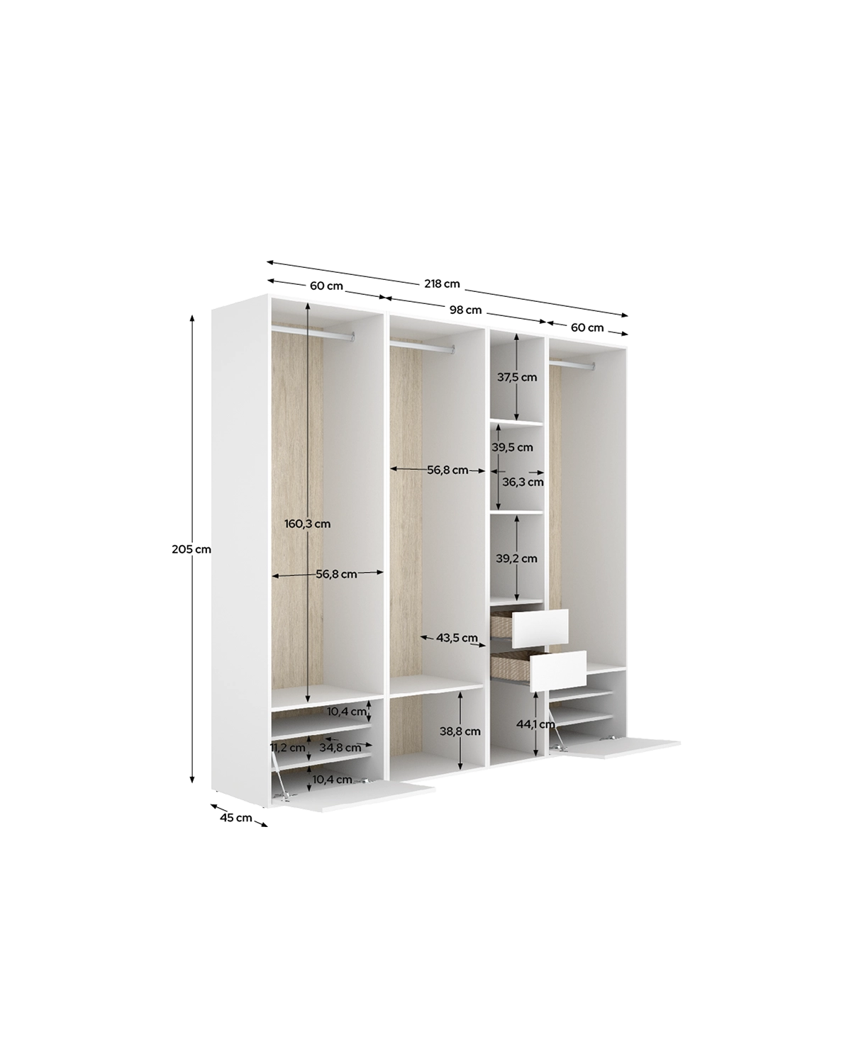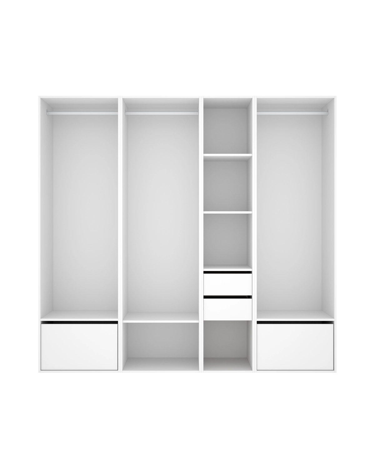 - El módulo vestidor Suit de 218 cm se presenta como una solución de gran capacidad que combina organización, diseño y funcionalidad. Su trasera reversible, en blanco o madera natural, aporta versatilidad y permite crear combinaciones personalizadas dentro del dormitorio o vestidor. Su formato abierto facilita el acceso a todas las prendas y genera una sensación de espacio limpio y ordenado. Este modelo incluye nueve huecos, dos cajones con acabado textil y guías metálicas, dos zapateros abatibles y tres barras de colgar de aluminio, ofreciendo una distribución completa y práctica. Fabricado en tablero melaminizado de 16 mm y reforzado con herrajes metálicos y tacos ABS antirrayaduras, garantiza estabilidad, durabilidad y una excelente resistencia al uso diario. Su mantenimiento resulta sencillo, conservando el color y la textura con el paso del tiempo. Integrado en el sistema modular Suit, este modelo puede combinarse con otros para crear vestidores a medida, adaptados a distintos espacios y estilos. Su diseño moderno, equilibrado y funcional convierte el orden en una experiencia estética, aportando confort visual y practicidad en el día a día.