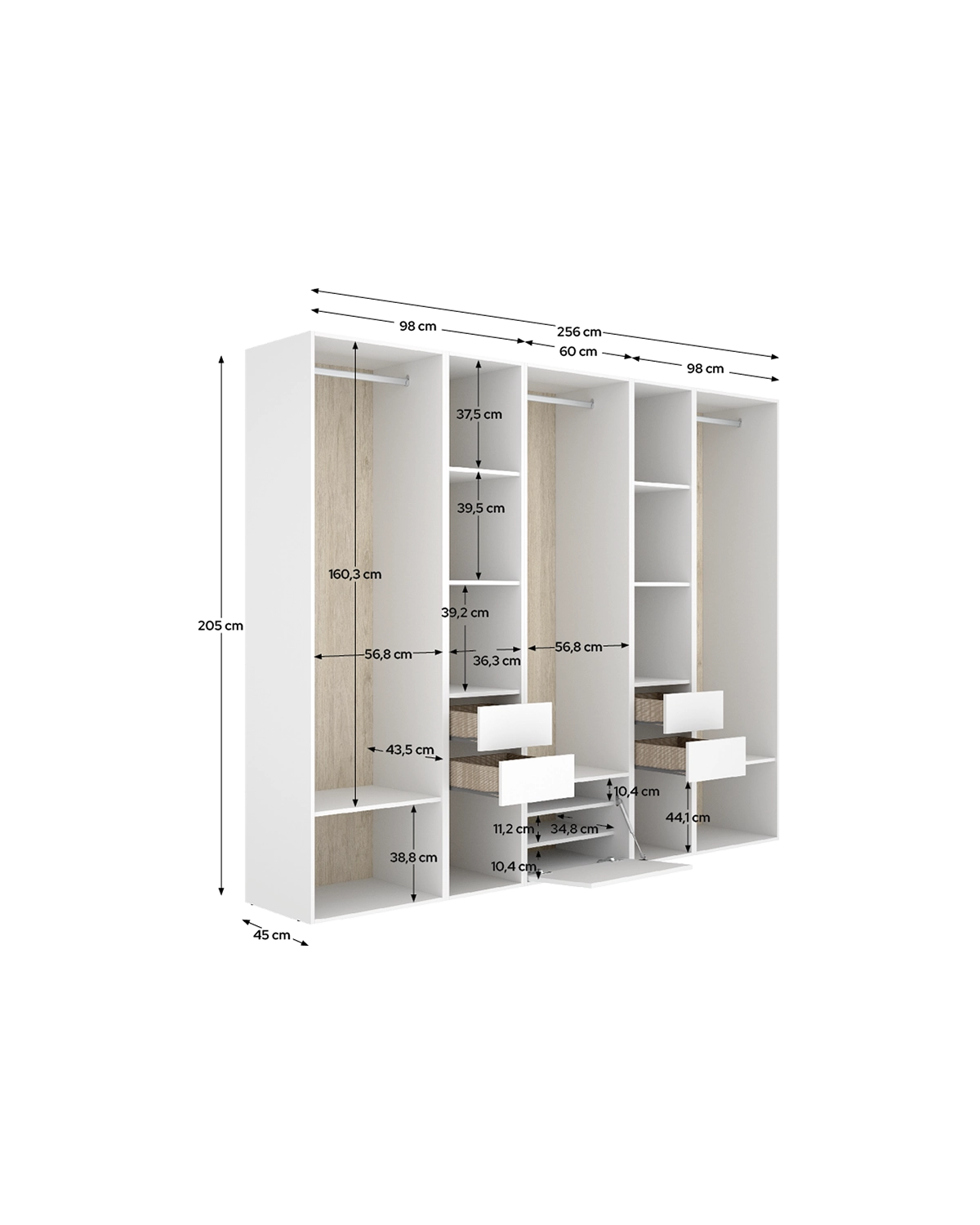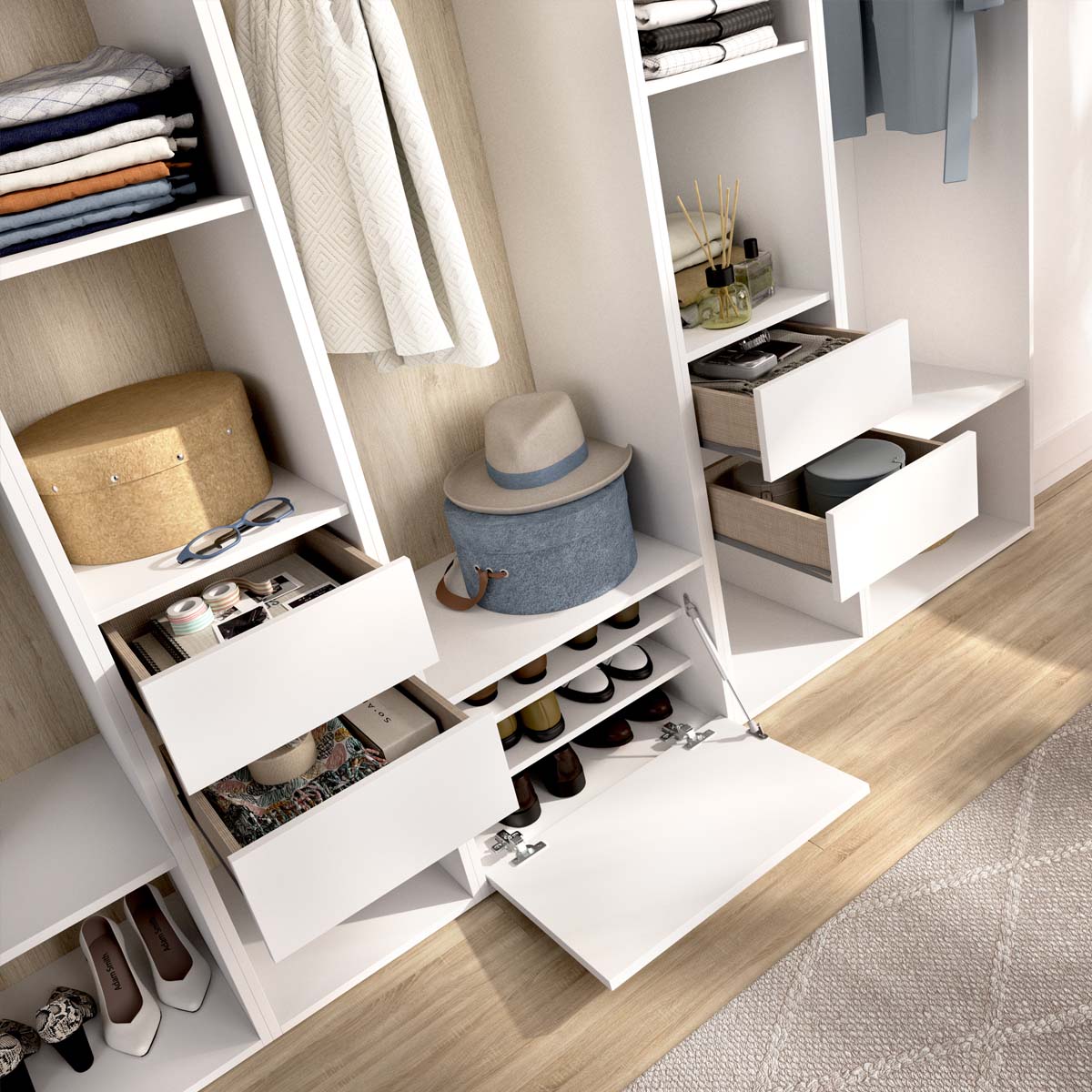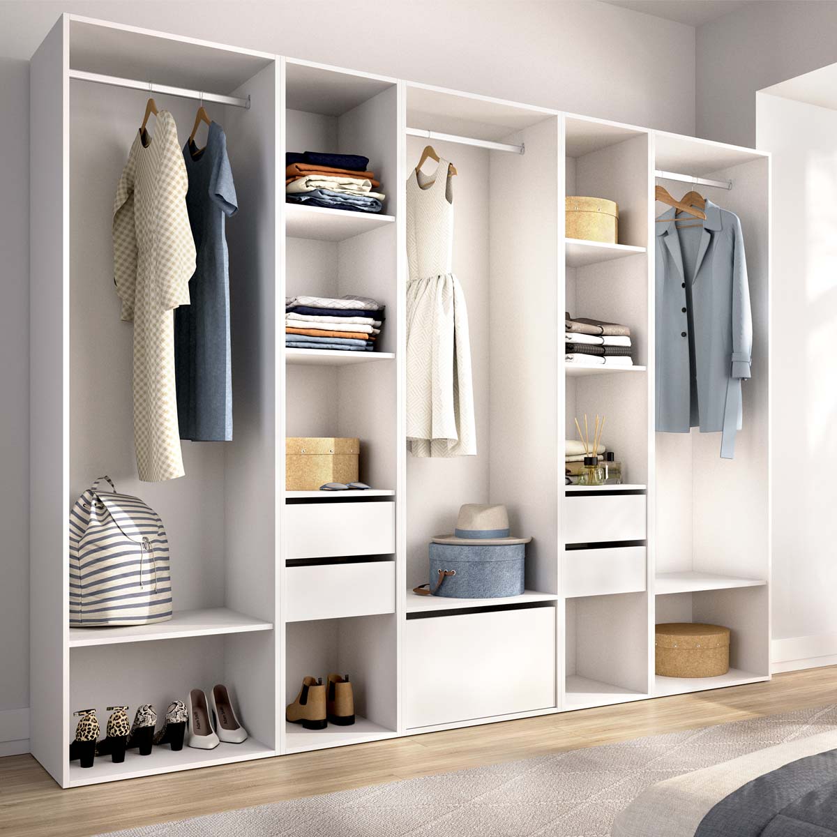 - El módulo vestidor Suit 256 cm representa la máxima expresión de capacidad dentro de la colección. Diseñado para ofrecer un espacio de almacenaje completo, combina doce huecos, cuatro cajones con acabado textil, un zapatero abatible y tres barras metálicas de colgar, proporcionando una organización total para prendas, calzado y complementos. Su formato amplio y abierto aporta una presencia elegante y equilibrada al dormitorio o vestidor. La trasera reversible, con acabado en blanco o madera natural, permite adaptar la estética del conjunto a diferentes estilos decorativos, desde ambientes luminosos hasta propuestas más cálidas y acogedoras. Fabricado en tablero melaminizado de alta densidad, con herrajes metálicos y tacos ABS protectores, este módulo garantiza resistencia, estabilidad y fácil mantenimiento. Cada detalle está concebido para ofrecer comodidad y durabilidad a largo plazo. Como parte del sistema modular Suit, puede combinarse con otros módulos para crear vestidores personalizados de gran formato, ajustándose a las dimensiones y necesidades de cada espacio. Su diseño funcional, contemporáneo y versátil lo convierte en una pieza esencial para quienes buscan un vestidor ordenado, práctico y visualmente armonioso.