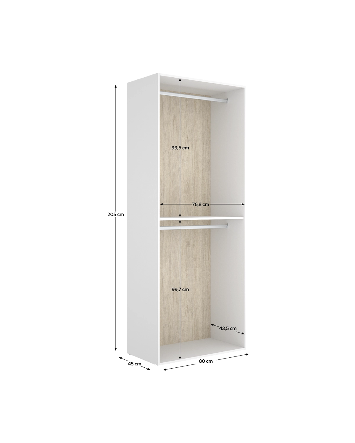 - El módulo vestidor Suit con doble barra ofrece una solución práctica para quienes buscan maximizar el espacio de colgado dentro del vestidor. Su diseño abierto, con líneas sencillas y equilibradas, se completa con una trasera reversible que permite elegir entre el acabado blanco o madera natural, adaptándose fácilmente a diferentes estilos decorativos. Cuenta con dos huecos abiertos y dos barras de aluminio, que permiten separar prendas cortas y largas para una organización más eficiente. Los tacos ABS quitarruidos y antirrayaduras aportan estabilidad y protección del suelo, mientras que la estructura en tablero melaminizado y los herrajes metálicos garantizan resistencia y durabilidad. Su mantenimiento es sencillo, conservando un aspecto impecable con el paso del tiempo. Al igual que el resto de la colección, este módulo forma parte del sistema modular Suit, que ofrece la posibilidad de combinar diferentes configuraciones para crear vestidores personalizados y ampliables. Su diseño versátil y su acabado reversible lo convierten en un elemento esencial para mantener el orden con estilo y naturalidad.