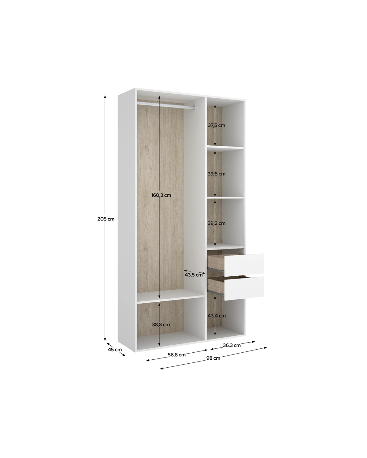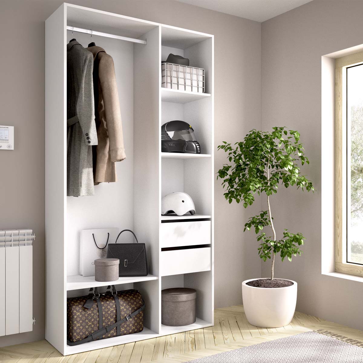 - El módulo vestidor Suit combina funcionalidad y estilo contemporáneo para crear composiciones personalizadas de almacenaje. Su diseño modular, abierto y ligero, permite integrarlo fácilmente en dormitorios o vestidores, aportando una sensación de orden y amplitud. La trasera reversible, en blanco o madera natural, ofrece dos acabados distintos que se adaptan tanto a espacios luminosos y minimalistas como a ambientes más cálidos y naturales, potenciando su versatilidad decorativa. En su interior, este módulo de seis huecos, dos cajones y una barra metálica para colgar prendas ofrece una distribución práctica que facilita mantener todo organizado y a la vista. Los cajones cuentan con acabado textil y guías metálicas de suave deslizamiento, mientras que los tacos ABS quitarruidos y antirrayaduras protegen el suelo y aportan estabilidad. Su estructura en tablero melaminizado de alta calidad asegura resistencia al uso diario y un mantenimiento sencillo, conservando siempre un aspecto impecable. El modelo Suit forma parte de un sistema modular combinable, que permite configurar vestidores a medida uniendo diferentes elementos de la misma serie. Esta flexibilidad facilita crear composiciones adaptadas a cualquier espacio, optimizando la capacidad sin perder armonía visual. Un diseño equilibrado que une orden, estética y funcionalidad para vestir el hogar con elegancia y naturalidad.