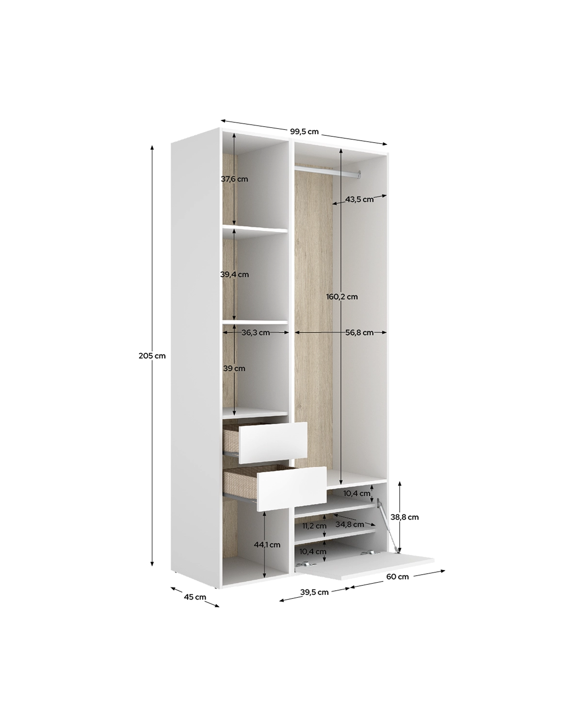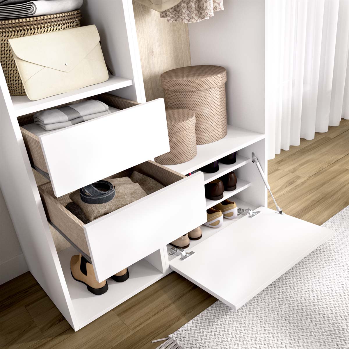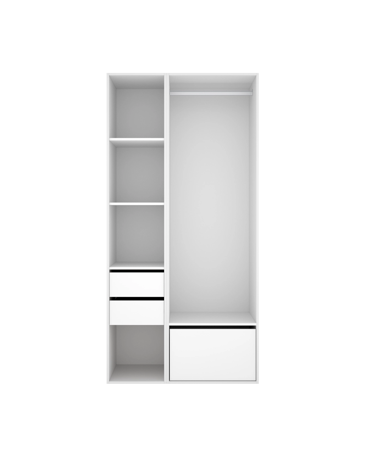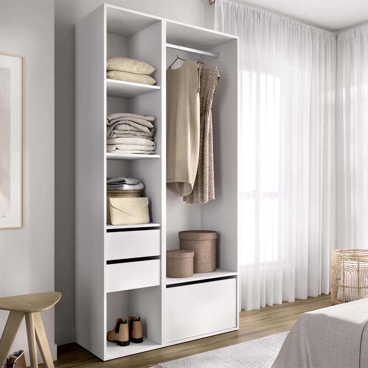 - El módulo vestidor Suit de 99,5 cm combina elegancia y funcionalidad en un diseño versátil pensado para aprovechar al máximo el espacio. Su trasera reversible, con acabado en blanco o madera natural, permite integrarlo con facilidad en distintos estilos decorativos, aportando un toque luminoso o cálido según la elección. La estructura abierta potencia la sensación de amplitud, ideal para dormitorios o vestidores donde el orden se convierte en un elemento estético. Este modelo incluye cinco huecos de almacenaje, dos cajones con acabado textil y guías metálicas, un zapatero y una barra metálica de colgar, ofreciendo una organización completa para todo tipo de prendas y accesorios. Los tacos ABS quitarruidos y antirrayaduras garantizan estabilidad y protegen el suelo, mientras que la estructura de tablero melaminizado de 16 mm asegura durabilidad y un mantenimiento sencillo. Como parte del sistema modular Suit, este módulo puede combinarse con otros para crear vestidores personalizados y ampliables. Su diseño limpio, funcional y adaptable lo convierte en una opción perfecta para quienes buscan una solución moderna que equilibra estilo, practicidad y confort visual.