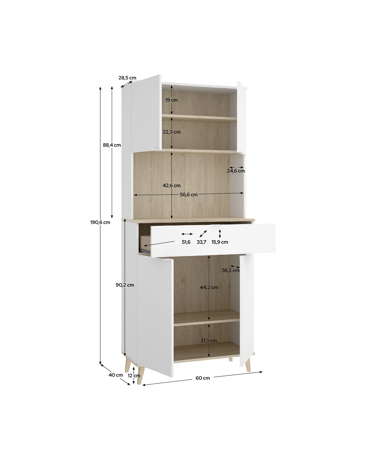 - El mueble auxiliar de cocina Wok destaca por su diseño práctico y versátil, ideal tanto para cocinas como para salones pequeños o espacios abiertos. Su combinación de blanco y madera natural aporta luminosidad y calidez, adaptándose con facilidad a distintos estilos decorativos. Con una altura de 191 cm y un ancho de 60 cm, ofrece gran capacidad de almacenaje en un formato vertical que aprovecha al máximo el espacio disponible. Dispone de cuatro puertas y un cajón con acabado interior textil y guías metálicas de suave deslizamiento, perfectos para guardar utensilios, menaje o incluso productos de despensa. En su interior, los estantes regulables permiten organizar los objetos de forma cómoda y personalizada. Su estructura en tablero de partículas melaminizado de 16 mm asegura resistencia y estabilidad, mientras que las patas en ABS efecto madera natural incorporan tacos antirrayaduras y quitarruidos que protegen el suelo y facilitan la limpieza. Además de su funcionalidad en la cocina, el mueble Wok resulta perfecto como aparador auxiliar en salones o comedores modernos. Su diseño estilizado y su acabado natural lo convierten en una pieza práctica y decorativa, ideal para optimizar el orden en hogares con espacios abiertos o ambientes de estilo contemporáneo.