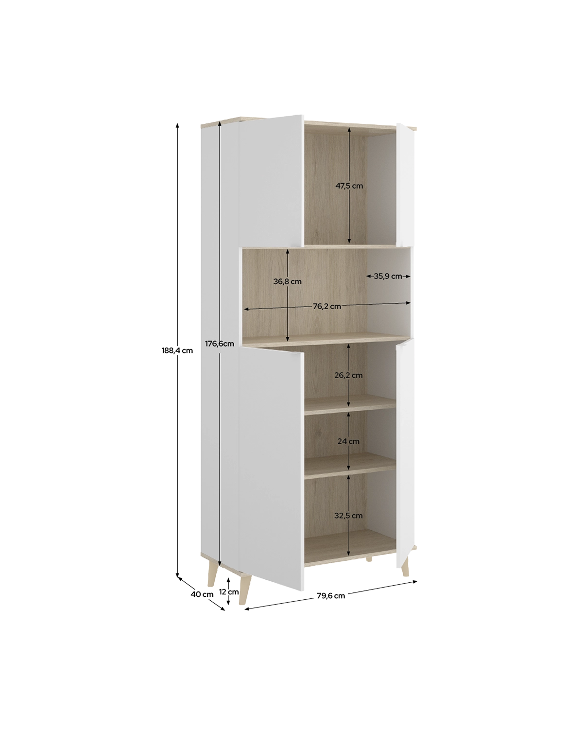 - El mueble auxiliar de cocina Wok en color blanco y roble natural es una opción funcional y elegante para optimizar el espacio en cocinas y zonas abiertas. Con 191 cm de altura y 80 cm de ancho, su formato vertical permite aprovechar al máximo la superficie disponible, ofreciendo una excelente capacidad de almacenaje sin ocupar demasiado espacio. Dispone de tres puertas y estantes interiores regulables que facilitan la organización de menaje, pequeños electrodomésticos o productos de despensa. Su acabado combina el blanco luminoso con el tono cálido del roble natural, creando una pieza equilibrada y versátil que encaja tanto en cocinas modernas como en salones o comedores de estilo nórdico. Fabricado en tablero melaminizado de 16 mm, el mueble incorpora patas de ABS en acabado madera con tacos antirrayaduras y quitarruidos. Los detalles como las guías metálicas y los materiales de calidad refuerzan su durabilidad. Su diseño limpio y funcional lo convierte en un mueble práctico para mantener el orden con estilo en cualquier estancia.