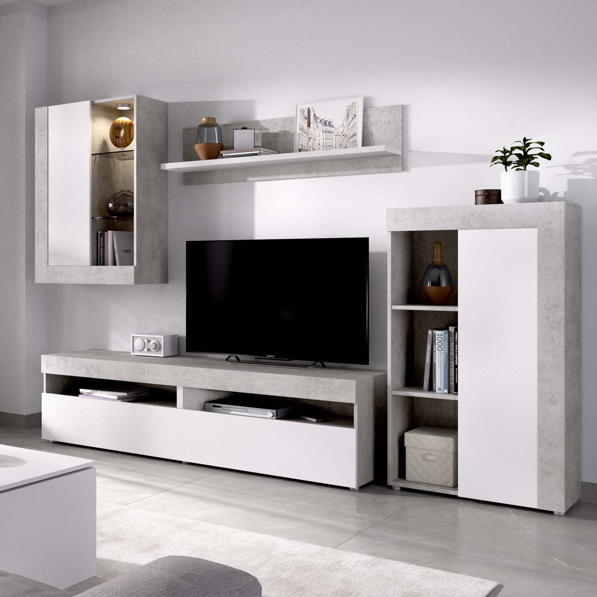 - Este conjunto de salón Tokio con luz está formado por 4 piezas diseñadas para crear un espacio moderno y equilibrado: mueble de TV, vitrina, armario colgante con luz LED integrada y estante. Su acabado en blanco y cemento aporta un estilo actual, ideal para ambientes contemporáneos. Ofrece una organización práctica gracias a sus módulos con puertas, estantes incluidos y un mueble de TV con compás de gas abatible que facilita el acceso interior. La vitrina y el armario colgante permiten mantener el orden y exhibir decoración, aportando además iluminación ambiental gracias a la luz LED integrada. Fabricado en tablero de partículas melaminizado con trasera en fibras de densidad media y patas ABS, garantiza resistencia y estabilidad. Incluye tacos antirrayaduras y sistema de fijación a pared para una instalación segura. Es una solución completa y funcional para renovar tu zona de estar.