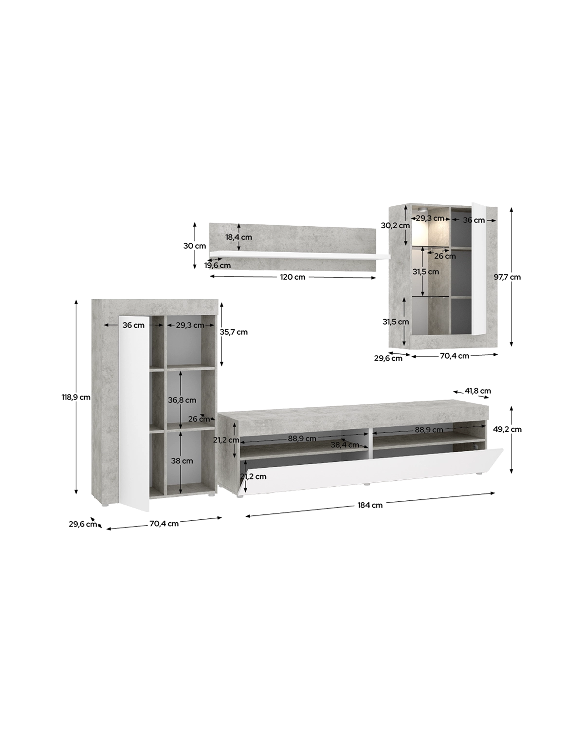 - Ancho: Estante: 120 cm | Armario: 70,4 cm | Mueble TV: 184 | Vitrina: 70,4 cm