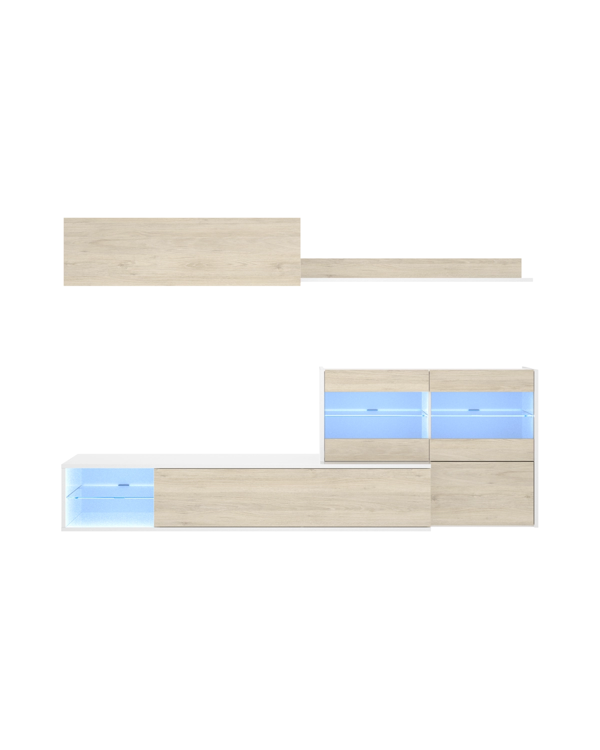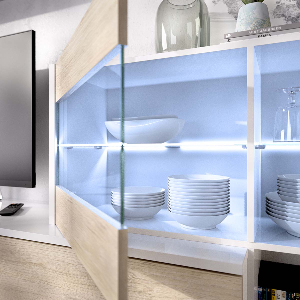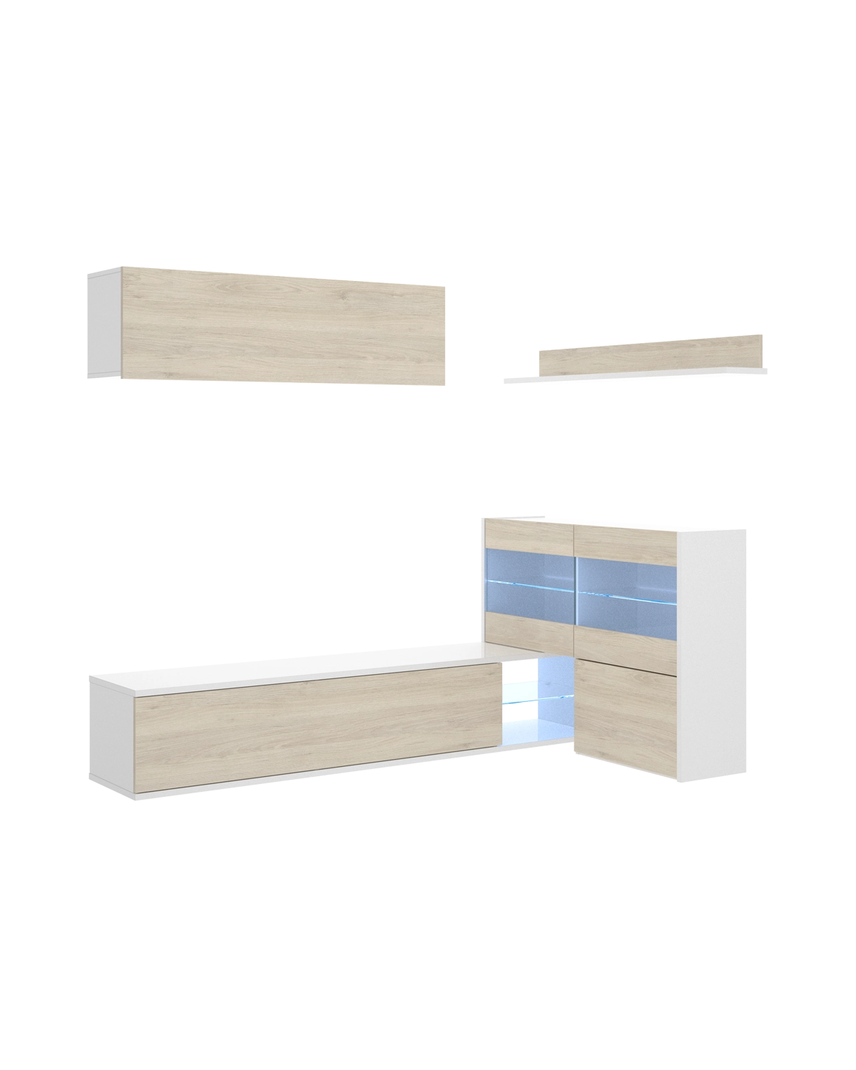 - El conjunto de salón Uma combina diseño modular y máxima versatilidad, formado por cuatro muebles que pueden colocarse en línea o en formato esquinero según el espacio disponible. Su acabado en blanco brillo y roble natural aporta un estilo moderno y luminoso, mientras que las vitrinas con LED integran un toque decorativo ideal para crear ambientes cálidos. Incluye estantes altos, vitrina cerrada y un mueble de TV amplio, ofreciendo almacenamiento accesible y zonas de exposición abiertas. Las puertas cuentan con compás de gas para una apertura suave, y el módulo con iluminación integra transformador e interruptor para usarlo desde el primer día. Fabricado en tablero melaminizado de gran resistencia, incorpora tacos ABS antideslizantes y antirrayaduras. Con montaje reversible y fijación a pared, es una opción robusta y segura para organizar el salón con un diseño contemporáneo y muy funcional.