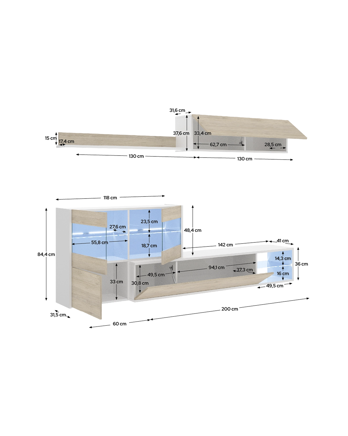 - Ancho: Estantes: 130 cm | Mueble TV: 233 - 260 cm