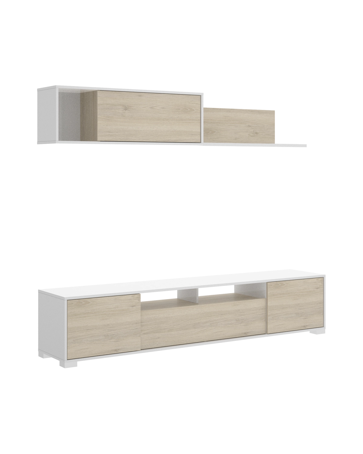 - Este conjunto Ken está compuesto por dos piezas: un estante superior y un mueble de TV ancho que, juntos, proporcionan una solución equilibrada de almacenaje y decoración para salones modernos. Su combinación de blanco brillo y roble natural aporta luminosidad y calidez a cualquier ambiente. Ofrece espacio para dispositivos multimedia, objetos decorativos y almacenamiento cerrado. Las puertas superiores incluyen compás de gas para una apertura cómoda, mientras que el módulo inferior cuenta con compás de retención para mayor seguridad y durabilidad. Es perfecto para salones donde se busca orden y estilo sin ocupar excesivo espacio. Fabricado en tablero melaminizado resistente, con trasera de fibras de densidad media y patas ABS, garantiza estabilidad y un mantenimiento sencillo. Incluye fijación a pared y todos los herrajes necesarios para un montaje seguro.