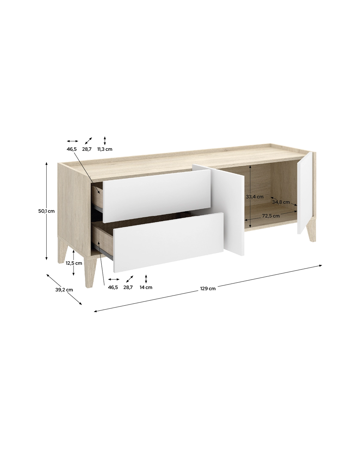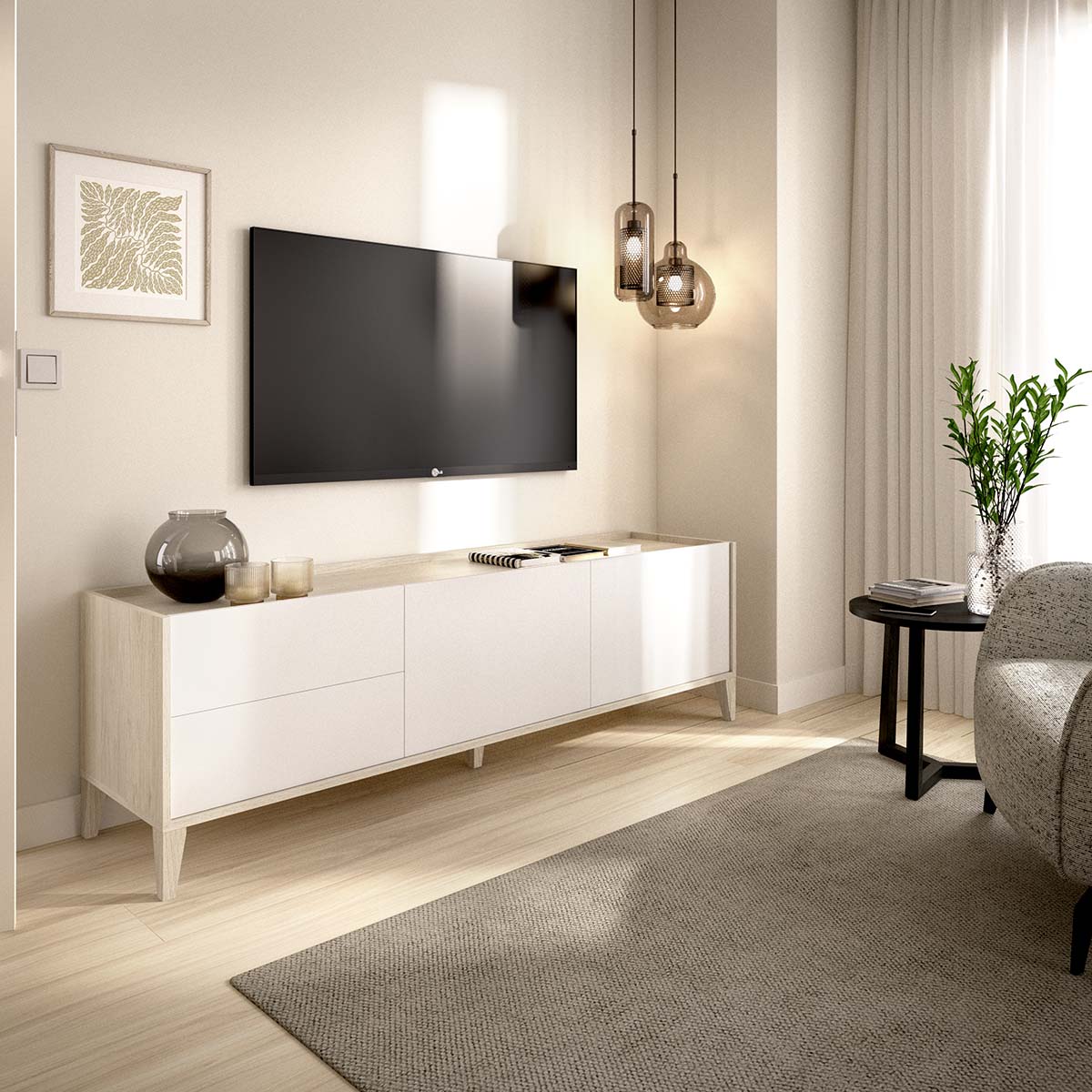 - El mueble de TV Bari combina diseño contemporáneo y practicidad en una pieza compacta y funcional. Con un acabado en blanco y madera natural, ofrece un contraste equilibrado que aporta calidez y luminosidad al salón. Sus 129 cm de ancho y 47,6 cm de alto lo convierten en una opción perfecta para espacios medianos, ofreciendo capacidad de almacenaje sin ocupar demasiado espacio visual. Dispone de dos puertas laterales y dos cajones centrales con acabado textil y guías metálicas de suave deslizamiento, ideales para mantener ordenados dispositivos electrónicos, mandos o accesorios. La parte superior ofrece una superficie amplia y estable para ubicar el televisor y elementos decorativos. Está fabricado en tablero de partículas melaminizado de 16 mm, con patas en ABS con recubrimiento efecto madera natural y tacos quitarruidos y antirrayaduras que protegen el suelo. Su estructura sólida, su diseño limpio y su tono cálido hacen de este mueble una pieza versátil, perfecta para completar ambientes de estilo moderno o nórdico.