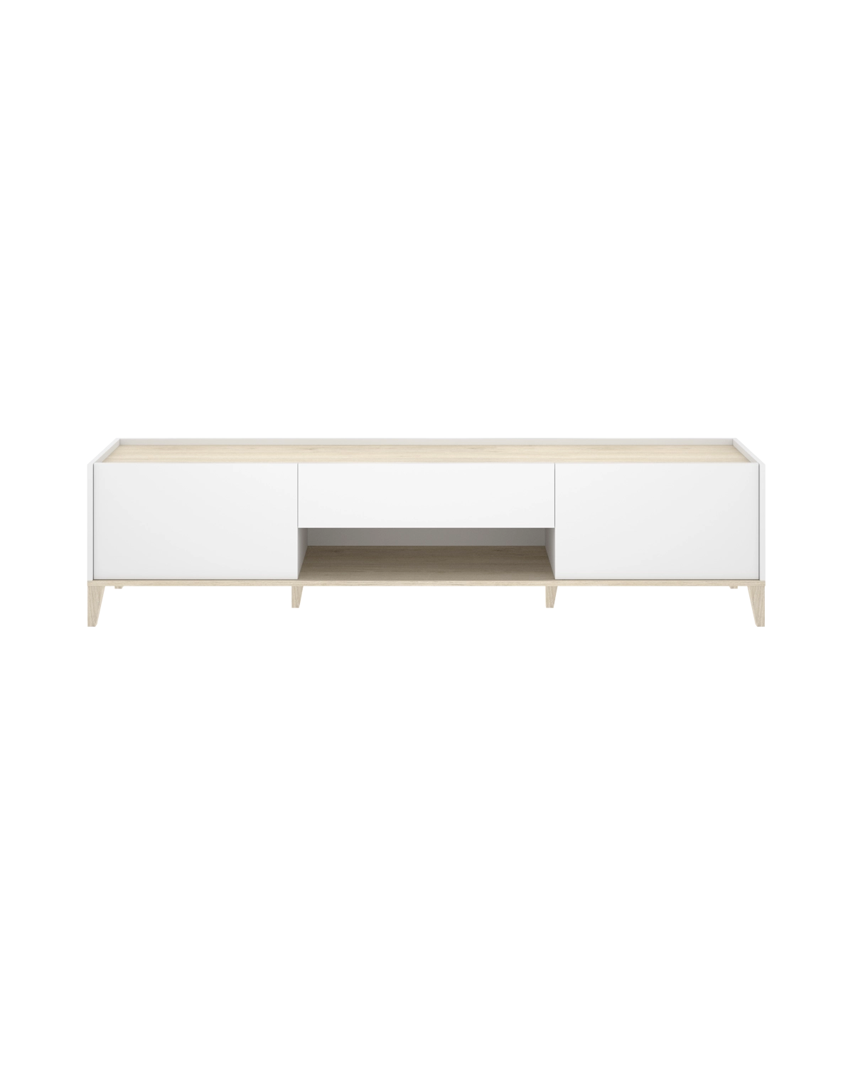 - El mueble de TV Bari de 196,5 cm destaca por su formato amplio y su diseño natural, pensado para salones espaciosos donde el orden y la estética son protagonistas. Su acabado en blanco y madera natural aporta un equilibrio entre modernidad y calidez, favoreciendo entornos luminosos y acogedores. Ofrece dos puertas laterales y un cajón central con acabado textil y guías metálicas de suave deslizamiento, que facilitan el almacenamiento de dispositivos electrónicos, cables o accesorios multimedia. Su gran superficie superior permite colocar televisores de gran tamaño junto a elementos decorativos sin perder armonía visual. Fabricado en tablero melaminizado de 16 mm, incorpora patas de ABS con recubrimiento efecto madera natural y tacos quitarruidos y antirrayaduras que protegen el suelo. La combinación de materiales resistentes y su diseño atemporal lo convierten en una pieza versátil, práctica y estéticamente equilibrada para cualquier salón moderno.