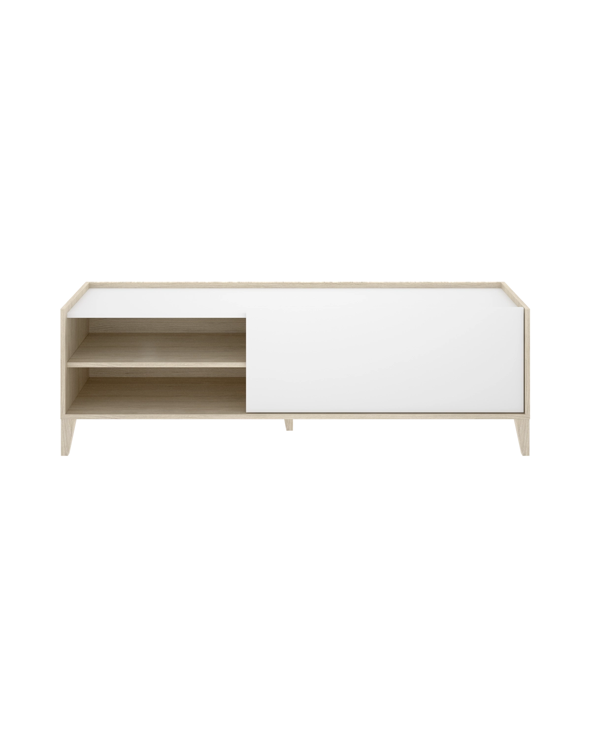 - El mueble de TV Bari destaca por su diseño limpio y natural, ideal para salones de inspiración nórdica. La combinación de blanco y madera natural aporta calidez y luminosidad al ambiente, mientras que sus proporciones —155 cm de ancho y 47 cm de alto— ofrecen una estructura equilibrada y funcional. Cuenta con una puerta abatible con compás de gas, que facilita un movimiento suave y silencioso. Su interior espacioso resulta perfecto para almacenar dispositivos multimedia, juegos o accesorios, ayudando a mantener la zona del televisor siempre ordenada. La parte superior ofrece una superficie amplia para el televisor y elementos decorativos. Fabricado en tablero melaminizado de 16 mm, incorpora patas de ABS efecto madera natural con tacos antirrayaduras y quitarruidos. Su estilo sobrio y natural, unido a la calidad de sus materiales, convierte al Ness en una pieza versátil y duradera que se adapta fácilmente a distintos tipos de decoración.