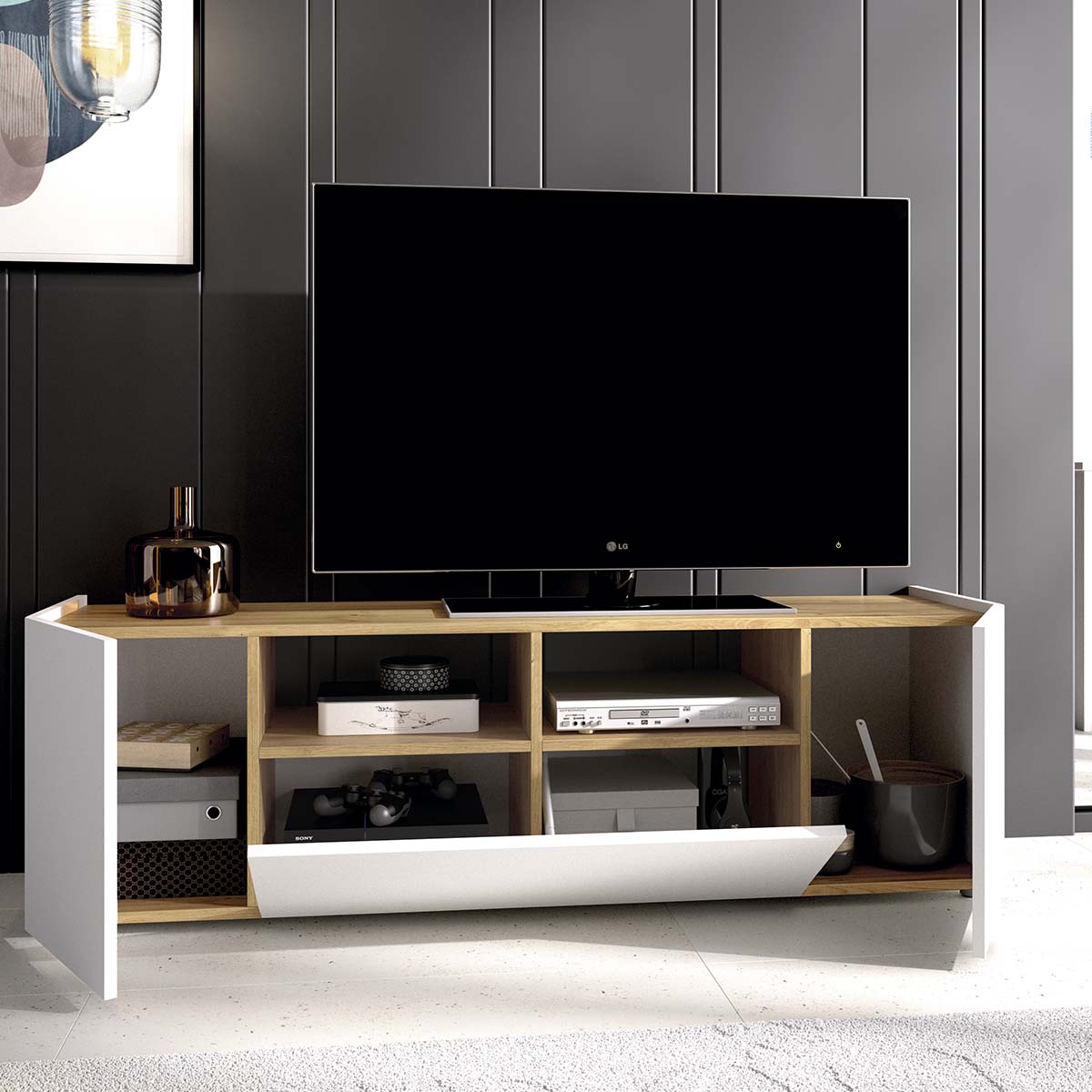 - El mueble TV Isola es una opción funcional y compacta para organizar la zona multimedia con un diseño limpio en blanco y nordic. Su formato bajo y proporcionado se adapta fácilmente a salones modernos, aportando luminosidad y una sensación de orden visual sin recargar el ambiente. Cuenta con tres puertas y estantes interiores que permiten guardar dispositivos, cables o accesorios de forma discreta. La puerta del módulo de TV incorpora compás de gas abatible, facilitando una apertura cómoda y segura en el uso diario. Las patas ajustables ayudan a nivelar el mueble según el suelo. Fabricado en tablero de partículas melaminizado, ofrece resistencia y fácil mantenimiento. Incluye patas de ABS con tacos quitarruidos y antirrayaduras que protegen el suelo y mejoran la estabilidad. Un mueble práctico, pensado para el día a día y para mantener el salón organizado.
