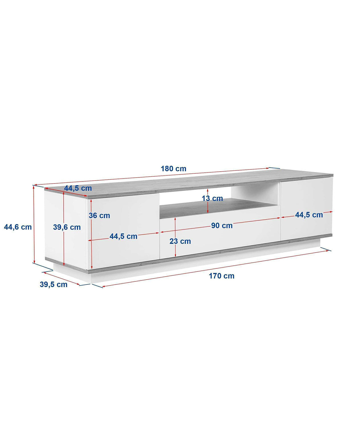 - El mueble de TV Melanie en acabado blanco y madera natural combina equilibrio y luminosidad en un diseño moderno y funcional. Con una longitud de 180 cm, ofrece una amplia superficie para colocar el televisor y diversos elementos decorativos. Dispone de tres puertas frontales que ocultan un generoso espacio de almacenaje, ideal para mantener ordenados cables, mandos y dispositivos electrónicos. Además, cuenta con un estante abierto central, perfecto para colocar el reproductor o la consola. Fabricado en tablero melaminizado de 18 mm, este mueble aporta solidez, resistencia y un acabado elegante que encaja en salones de inspiración nórdica o contemporánea.