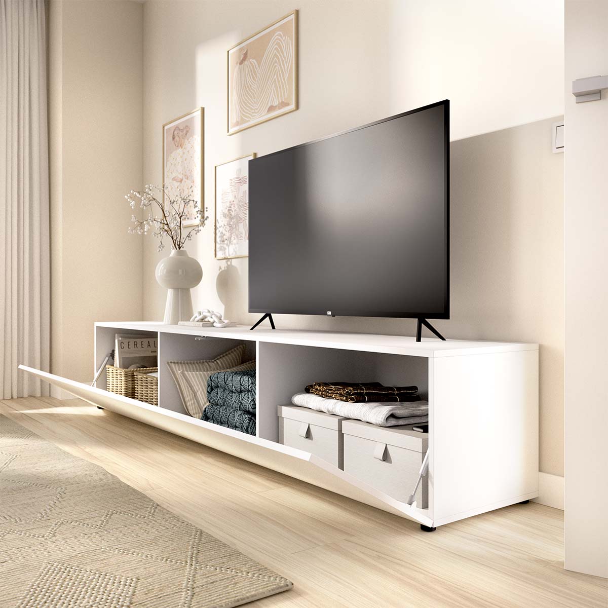- El mueble de TV Noka destaca por su presencia natural y su diseño de líneas rectas, pensado para quienes buscan un equilibrio entre estilo y funcionalidad. Su acabado en blanco aporta luz y autenticidad al salón, mientras que su estructura de 220 cm de ancho y 42 cm de alto proporciona una superficie amplia y estable para el televisor y elementos decorativos. Cuenta con una puerta con compás de gas abatible que garantiza una apertura fluida y segura. El interior ofrece un espacio generoso para guardar aparatos electrónicos, cables o accesorios, ayudando a mantener el entorno despejado y armonioso. Fabricado en tablero melaminizado de 16 mm, incluye tacos ABS quitarruidos y antirrayaduras que protegen el suelo y mejoran la estabilidad. Su diseño robusto y atemporal combina durabilidad, funcionalidad y un acabado que aporta una nota de calidez a los espacios modernos y naturales.